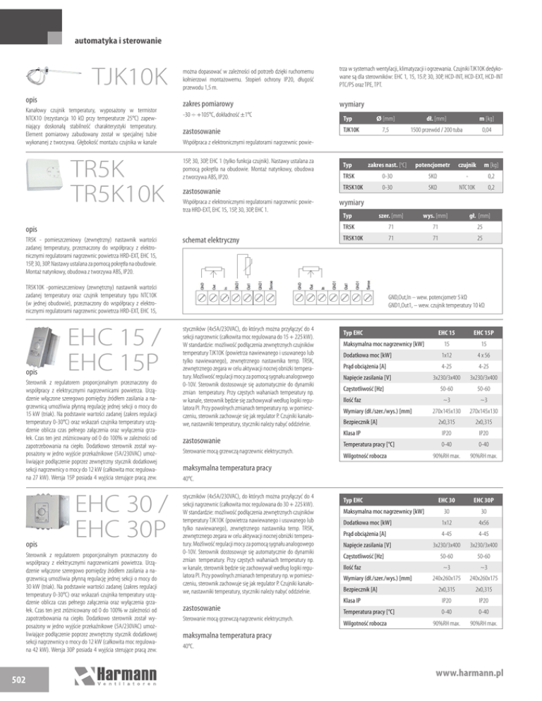 automatyka i sterowanie TJK10K opis Kanałowy czujnik temperatury, wyposażony w termistor NTCK10 (rezystancja 10 kΏ przy temperaturze 25°C) zapewniający doskonałą stabilność charakterystyki temperatury. Element pomiarowy zabudowany został w specjalnej tubie wykonanej z tworzywa. Głębokość montażu czujnika w kanale TR5K TR5K10K można dopasować w zależności od potrzeb dzięki ruchomemu kołnierzowi montażowemu. Stopień ochrony IP20, długość przewodu 1,5 m. trza w systemach wentylacji, klimatyzacji i ogrzewania. Czujniki TJK10K dedykowane są dla sterowników: EHC 1, 15, 15.P, 30, 30P, HCD-INT, HCD-EXT, HCD-INT PTC/PS oraz TPE, TPT. zakres pomiarowy wymiary -30 ÷ +105°C, dokładność ±1°C Typ zastosowanie TJK10K dł. [mm] m [kg] 7,5 1500 przewód / 200 tuba 0,04 Współpraca z elektronicznymi regulatorami nagrzewnic powie15P, 30, 30P, EHC 1 (tylko funkcja czujnik). Nastawy ustalana za pomocą pokrętła na obudowie. Montaż natynkowy, obudowa z tworzywa ABS, IP20. Typ zakres nast. [oC] potencjometr czujnik m [kg] TR5K 0-30 5KΩ - 0,2 zastosowanie TR5K10K 0-30 5KΩ NTC10K 0,2 Współpraca z elektronicznymi regulatorami nagrzewnic powietrza HRD-EXT, EHC 15, 15P, 30, 30P, EHC 1. opis TR5K - pomieszczeniowy (zewnętrzny) nastawnik wartości zadanej temperatury, przeznaczony do współpracy z elektronicznymi regulatorami nagrzewnic powietrza HRD-EXT, EHC 15, 15P, 30, 30P. Nastawy ustalana za pomocą pokrętła na obudowie. Montaż natynkowy, obudowa z tworzywa ABS, IP20. Ø [mm] schemat elektryczny wymiary Typ szer. [mm] wys. [mm] gł. [mm] TR5K 71 71 25 TR5K10K 71 71 25 TR5K10K -pomieszczeniowy (zewnętrzny) nastawnik wartości zadanej temperatury oraz czujnik temperatury typu NTC10K (w jednej obudowie), przeznaczony do współpracy z elektronicznymi regulatorami nagrzewnic powietrza HRD-EXT, EHC 15, opis EHC 15 / EHC 15P Sterownik z regulatorem proporcjonalnym przeznaczony do współpracy z elektrycznymi nagrzewnicami powietrza. Urządzenie włączone szeregowo pomiędzy źródłem zasilania a nagrzewnicą umożliwia płynną regulację jednej sekcji o mocy do 15 kW (triak). Na podstawie wartości zadanej (zakres regulacji temperatury 0-30°C) oraz wskazań czujnika temperatury urządzenie oblicza czas pełnego załączenia oraz wyłączenia grzałek. Czas ten jest zróżnicowany od 0 do 100% w zależności od zapotrzebowania na ciepło. Dodatkowo sterownik został wyposażony w jedno wyjście przekaźnikowe (5A/230VAC) umożliwiające podłączenie poprzez zewnętrzny stycznik dodatkowej sekcji nagrzewnicy o mocy do 12 kW (całkowita moc regulowana 27 kW). Wersja 15P posiada 4 wyjścia sterujące pracą zew. opis EHC 30 / EHC 30P Sterownik z regulatorem proporcjonalnym przeznaczony do współpracy z elektrycznymi nagrzewnicami powietrza. Urządzenie włączone szeregowo pomiędzy źródłem zasilania a nagrzewnicą umożliwia płynną regulację jednej sekcji o mocy do 30 kW (triak). Na podstawie wartości zadanej (zakres regulacji temperatury 0-30°C) oraz wskazań czujnika temperatury urządzenie oblicza czas pełnego załączenia oraz wyłączenia grzałek. Czas ten jest zróżnicowany od 0 do 100% w zależności od zapotrzebowania na ciepło. Dodatkowo sterownik został wyposażony w jedno wyjście przekaźnikowe (5A/230VAC) umożliwiające podłączenie poprzez zewnętrzny stycznik dodatkowej sekcji nagrzewnicy o mocy do 12 kW (całkowita moc regulowana 42 kW). Wersja 30P posiada 4 wyjścia sterujące pracą zew. 502 GND,Out,In – wew. potencjometr 5 kΏ GND1,Out1, – wew. czujnik temperatury 10 kΏ styczników (4x5A/230VAC), do których można przyłączyć do 4 sekcji nagrzewnic (całkowita moc regulowana do 15 + 225 kW). W standardzie: możliwość podłączenia zewnętrznych czujników temperatury TJK10K (powietrza nawiewanego i usuwanego lub tylko nawiewanego), zewnętrznego nastawnika temp. TR5K, zewnętrznego zegara w celu aktywacji nocnej obniżki temperatury. Możliwość regulacji mocy za pomocą sygnału analogowego 0-10V. Sterownik dostosowuje się automatycznie do dynamiki zmian temperatury. Przy częstych wahaniach temperatury np. w kanale, sterownik będzie się zachowywał według logiki regulatora PI. Przy powolnych zmianach temperatury np. w pomieszczeniu, sterownik zachowuje się jak regulator P. Czujniki kanałowe, nastawniki temperatury, styczniki należy nabyć oddzielnie. zastosowanie Sterowanie mocą grzewczą nagrzewnic elektrycznych. Typ EHC Maksymalna moc nagrzewnicy [kW] EHC 15 EHC 15P 15 15 Dodatkowa moc [kW] 1x12 4 x 56 Prąd obciążenia [A] 4-25 4-25 3x230/3x400 3x230/3x400 50-60 50-60 ~3 ~3 270x145x130 270x145x130 2x0,315 2x0,315 IP20 IP20 Napięcie zasilania [V] Częstotliwość [Hz] Ilość faz Wymiary (dł./szer./wys.) [mm] Bezpiecznik [A] Klasa IP Temperatura pracy [°C] Wilgotność robocza 0-40 0-40 90%RH max. 90%RH max. EHC 30 EHC 30P maksymalna temperatura pracy 40°C. styczników (4x5A/230VAC), do których można przyłączyć do 4 sekcji nagrzewnic (całkowita moc regulowana do 30 + 225 kW). W standardzie: możliwość podłączenia zewnętrznych czujników temperatury TJK10K (powietrza nawiewanego i usuwanego lub tylko nawiewanego), zewnętrznego nastawnika temp. TR5K, zewnętrznego zegara w celu aktywacji nocnej obniżki temperatury. Możliwość regulacji mocy za pomocą sygnału analogowego 0-10V. Sterownik dostosowuje się automatycznie do dynamiki zmian temperatury. Przy częstych wahaniach temperatury np. w kanale, sterownik będzie się zachowywał według logiki regulatora PI. Przy powolnych zmianach temperatury np. w pomieszczeniu, sterownik zachowuje się jak regulator P. Czujniki kanałowe, nastawniki temperatury, styczniki należy nabyć oddzielnie. zastosowanie Sterowanie mocą grzewczą nagrzewnic elektrycznych. maksymalna temperatura pracy 40°C. Typ EHC Maksymalna moc nagrzewnicy [kW] 30 30 Dodatkowa moc [kW] 1x12 4x56 Prąd obciążenia [A] 4-45 4-45 3x230/3x400 3x230/3x400 50-60 50-60 Napięcie za