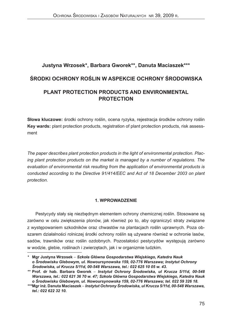 Ochrona Środowiska i Zasobów Naturalnych nr 39, 2009 r. Justyna Wrzosek*, Barbara Gworek**, Danuta Maciaszek*** Środki ochrony roślin w aspekcie ochrony środowiska Plant protection products and environmental protection Słowa kluczowe: środki ochrony roślin, ocena ryzyka, rejestracja środków ochrony roślin Key wards: plant protection products, registration of plant protection products, risk assessment The paper describes plant protection products in the light of environmental protection. Placing plant protection products on the market is managed by a number of regulations. The evaluation of environmental risk resulting from the application of environmental products is conducted according to the Directive 91/414/EEC and Act of 18 December 2003 on plant protection. 1. Wprowadzenie Pestycydy stały się niezbędnym elementem ochrony chemicznej roślin. Stosowane są zarówno w celu zwiększenia plonów, jak również po to, aby ograniczyć straty związane z występowaniem szkodników oraz chwastów na plantacjach roślin uprawnych. Poza obszarem działalności rolniczej środki ochrony roślin są używane również w ochronie lasów, sadów, trawników oraz roślin ozdobnych. Pozostałości pestycydów występują zarówno w wodzie, glebie, roślinach i zwierzętach, jak i w organizmie ludzkim. *Mgr Justyna Wrzosek − Szkoła Główna Gospodarstwa Wiejskiego, Katedra Nauk o Środowisku Glebowym, ul. Nowoursynowska 159, 02-776 Warszawa; Instytut Ochrony Środowiska, ul Krucza 5/11d, 00-548 Warszawa, tel.: 022 625 10 05 w. 43. ** Prof. dr hab. Barbara Gworek − Instytut Ochrony Środowiska, ul Krucza 5/11d, 00-548 Warszawa, tel.: 022 621 36 70 w. 47; Szkoła Główna Gospodarstwa Wiejskiego, Katedra Nauk o Środowisku Glebowym, ul. Nowoursynowska 159, 02-776 Warszawa; tel. 022 59 326 18. ***Mgr inż. Danuta Maciaszek − Instytut Ochrony Środowiska, ul Krucza 5/11d, 00-548 Warszawa, tel.: 022 622 32 10. 75 Justyna Wrzosek, Barbara Gworek, Danuta Maciaszek Produkcja i stosowanie środków ochrony roślin, poza niewątpliwymi korzyściami, wiąże się jednak z wieloma niepożądanymi skutkami. Zabiegi ochronne z użyciem pestycydów wykonane na polach uprawnych oraz terenach nieużytkowanych rolniczo są głównym źródłem degradacji otaczającego nas środowiska . Na szczególną uwagę zasługuje problem ochrony wód przed zanieczyszczeniami pestycydowymi. Występowanie środków ochrony roślin stwierdzono we wszystkich rodzajach wód krążących w ekosystemie − w opadach atmosferycznych, wodach powierzchniowych i podziemnych. Część substancji aktywnej, wchodzącej w skład środka ochrony roślin oraz jej metabolitów może przedostać się do łańcucha troficznego ludzi i zwierząt wraz z plonem rośliny uprawnej. Stają się wówczas szkodliwymi pozostałościami. Stwierdzono również, że małe powierzchnie pól uprawnych, bioróżnorodność gatunkowa upraw, a także sumienne wykonywanie zabiegów agrotechnicznych przez wykwalifikowanych i przeszkolonych rolników przestrzegających instrukcji stosowania zawartych w etykiecie na opakowaniu danego środka ochrony roślin, sprzyja ograniczeniu negatywnego oddziaływania pestycydów na środowisko [Banaszkiewicz 2003]. Chemiczne środki ochrony roślin stały się zatem szybkim, wygodnym i bardzo powszechnym elementem ochrony roślin przed patogenami. Pomimo występowania wielu zagrożeń związanych z degradacją środowiska naturalnego oraz możliwością włączania pozostałości pestycydów do łańcucha biologicznego na etapie gleba – roślina – człowiek są one nadal najbardziej skuteczną i nowoczesną metodą zapobiegania występowaniu wielu szkodliwych gatunków owadów, nicieni, roztoczy i gryzoni, a także chorobotwórczych wirusów, grzybów i bakterii na plantacjach roślin uprawnych. Ze względu na wymienione czynniki głównym kierunkiem w ochronie środowiska jest poszukiwanie sposobu ograniczania szkodliwego działania odpadów i pozostałości pestycydowych. Wnikliwa ocena ryzyka wprowadzanych do obrotu środków ochrony roślin oraz wszelkie środki ostrożności stosowane w celu zminimalizowania występującego narażenia na organizmy żywe są zatem niezbędnym elementem zabezpieczenia żywności oraz środowiska naturalnego przed negatywnym oddziaływaniem pestycydów na środowisko naturalne. 2. CHARAKTERYSTYKA ŚRODKÓW OCHRONY ROŚLIN 2.1. Zastosowanie i działanie Pestycydy są związkami pochodzenia syntetycznego lub naturalnego stosowanymi w ochronie roślin uprawnych w celu ograniczenia lub całkowitego wyeliminowania szkodników, chorób oraz chwastów. Wpływają również na regulację wzrostu roślin. Nazwa wywodzi się od łacińskich słów: pestis – szkodnik oraz cedeo – niszczyć. Liczba stosowanych pestycydów na świecie jest ogromna. Szacuje się, że obecnie wyprodukowano ponad 1000 preparatów zawierających substancje pestycydowe o dużej 76 Środki ochrony roślin w aspekcie ochrony środowiska aktywności biologicznej [Laskowski, Migula 2004; Makles, Domański 2008; Rejmer 1997]. Odgrywają one istotną rolę w zwiększaniu efektywności i jakości produkcji rolnej przez ograniczenie chorób roślin oraz niszczenia chwastów, grzybów, roztoczy, insektów, gryzoni atakujących te uprawy. Szacuje się, że ok. 15−20 % strat produktów rolniczych jest wywołanych przez szkodniki roślinne i zwierzęce. Ograniczenie ich występowania zapewni wyżywienie stale rosnącej liczbie ludności na świecie i ograniczy istniejące strefy głodu. Stosowane są również w ochronie pól, lasów, a także w celu konserwacji drewna oraz zabezpieczenia żywności podczas jej magazynowania i transportu [Makles, Domański 2008]. Środki ochrony roślin charakteryzuje duża toksyczność w stosunku do docelowych szkodników. Powinna również charakteryzować je krótka trwałość w środowisku oraz dużą podatnością na degradację, tak aby po spełnieniu swego zadania szyb