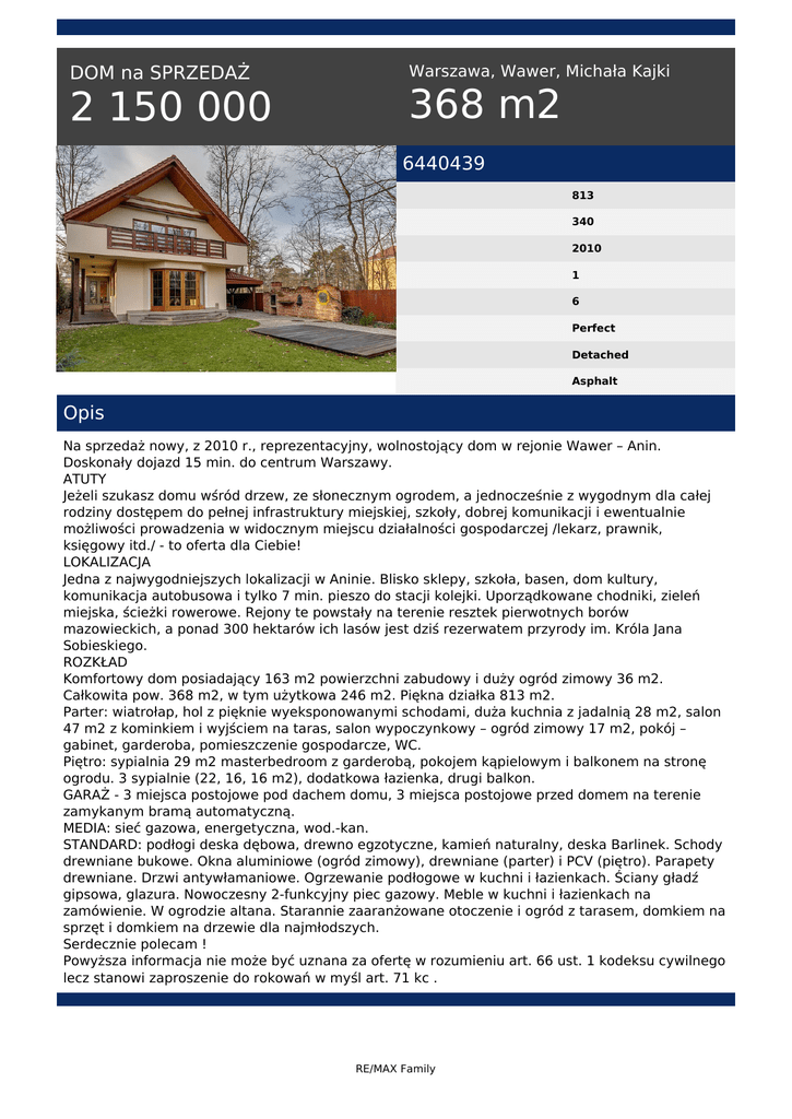 DOM na SPRZEDAŻ 2 150 000 Warszawa, Wawer, Michała Kajki 368 m2 6440439 813 340 2010 1 6 Perfect Detached Asphalt Opis Na sprzedaż nowy, z 2010 r., reprezentacyjny, wolnostojący dom w rejonie Wawer – Anin. Doskonały dojazd 15 min. do centrum Warszawy. ATUTY Jeżeli szukasz domu wśród drzew, ze słonecznym ogrodem, a jednocześnie z wygodnym dla całej rodziny dostępem do pełnej infrastruktury miejskiej, szkoły, dobrej komunikacji i ewentualnie możliwości prowadzenia w widocznym miejscu działalności gospodarczej /lekarz, prawnik, księgowy itd./ - to oferta dla Ciebie! LOKALIZACJA Jedna z najwygodniejszych lokalizacji w Aninie. Blisko sklepy, szkoła, basen, dom kultury, komunikacja autobusowa i tylko 7 min. pieszo do stacji kolejki. Uporządkowane chodniki, zieleń miejska, ścieżki rowerowe. Rejony te powstały na terenie resztek pierwotnych borów mazowieckich, a ponad 300 hektarów ich lasów jest dziś rezerwatem przyrody im. Króla Jana Sobieskiego. ROZKŁAD Komfortowy dom posiadający 163 m2 powierzchni zabudowy i duży ogród zimowy 36 m2. Całkowita pow. 368 m2, w tym użytkowa 246 m2. Piękna działka 813 m2. Parter: wiatrołap, hol z pięknie wyeksponowanymi schodami, duża kuchnia z jadalnią 28 m2, salon 47 m2 z kominkiem i wyjściem na taras, salon wypoczynkowy – ogród zimowy 17 m2, pokój – gabinet, garderoba, pomieszczenie gospodarcze, WC. Piętro: sypialnia 29 m2 masterbedroom z garderobą, pokojem kąpielowym i balkonem na stronę ogrodu. 3 sypialnie (22, 16, 16 m2), dodatkowa łazienka, drugi balkon. GARAŻ - 3 miejsca postojowe pod dachem domu, 3 miejsca postojowe przed domem na terenie zamykanym bramą automatyczną. MEDIA: sieć gazowa, energetyczna, wod.-kan. STANDARD: podłogi deska dębowa, drewno egzotyczne, kamień naturalny, deska Barlinek. Schody drewniane bukowe. Okna aluminiowe (ogród zimowy), drewniane (parter) i PCV (piętro). Parapety drewniane. Drzwi antywłamaniowe. Ogrzewanie podłogowe w kuchni i łazienkach. Ściany gładź gipsowa, glazura. Nowoczesny 2-funkcyjny piec gazowy. Meble w kuchni i łazienkach na zamówienie. W ogrodzie altana. Starannie zaaranżowane otoczenie i ogród z tarasem, domkiem na sprzęt i domkiem na drzewie dla najmłodszych. Serdecznie polecam ! Powyższa informacja nie może być uznana za ofertę w rozumieniu art. 66 ust. 1 kodeksu cywilnego lecz stanowi zaproszenie do rokowań w myśl art. 71 kc . RE/MAX Family RE/MAX Family tel. 22 724 98 28 email: [email protected] RE/MAX Family Powered by TCPDF (www.tcpdf.org)