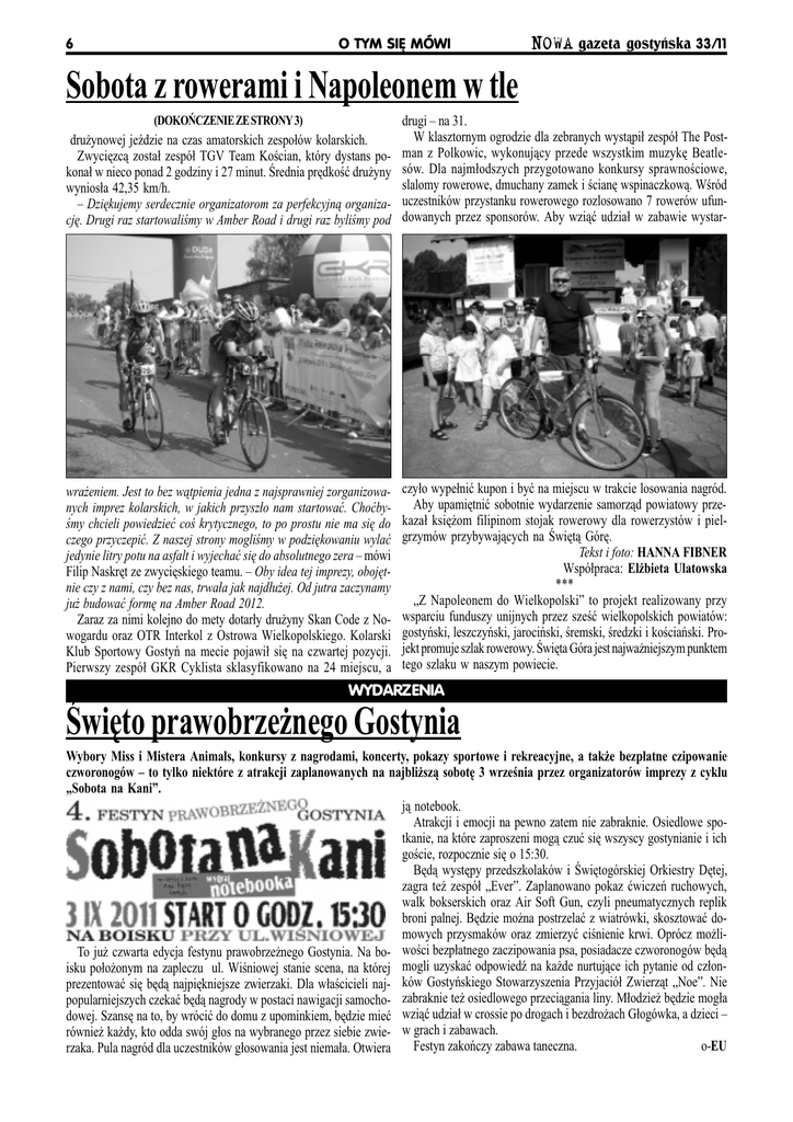 6 O TYM SIÊ MÓWI NOWA gazeta gostyñska 33/11 Sobota z rowerami i Napoleonem w tle dru¿ynowej jedzie na czas amatorskich zespo³ów kolarskich. Zwyciêzc¹ zosta³ zespó³ TGV Team Kocian, który dystans pokona³ w nieco ponad 2 godziny i 27 minut. rednia prêdkoæ dru¿yny wynios³a 42,35 km/h. Dziêkujemy serdecznie organizatorom za perfekcyjn¹ organizacjê. Drugi raz startowalimy w Amber Road i drugi raz bylimy pod drugi na 31. W klasztornym ogrodzie dla zebranych wyst¹pi³ zespó³ The Postman z Polkowic, wykonuj¹cy przede wszystkim muzykê Beatlesów. Dla najm³odszych przygotowano konkursy sprawnociowe, slalomy rowerowe, dmuchany zamek i cianê wspinaczkow¹. Wród uczestników przystanku rowerowego rozlosowano 7 rowerów ufundowanych przez sponsorów. Aby wzi¹æ udzia³ w zabawie wystar- wra¿eniem. Jest to bez w¹tpienia jedna z najsprawniej zorganizowanych imprez kolarskich, w jakich przysz³o nam startowaæ. Choæbymy chcieli powiedzieæ co krytycznego, to po prostu nie ma siê do czego przyczepiæ. Z naszej strony moglimy w podziêkowaniu wylaæ jedynie litry potu na asfalt i wyjechaæ siê do absolutnego zera mówi Filip Naskrêt ze zwyciêskiego teamu. Oby idea tej imprezy, obojêtnie czy z nami, czy bez nas, trwa³a jak najd³u¿ej. Od jutra zaczynamy ju¿ budowaæ formê na Amber Road 2012. Zaraz za nimi kolejno do mety dotar³y dru¿yny Skan Code z Nowogardu oraz OTR Interkol z Ostrowa Wielkopolskiego. Kolarski Klub Sportowy Gostyñ na mecie pojawi³ siê na czwartej pozycji. Pierwszy zespó³ GKR Cyklista sklasyfikowano na 24 miejscu, a czy³o wype³niæ kupon i byæ na miejscu w trakcie losowania nagród. Aby upamiêtniæ sobotnie wydarzenie samorz¹d powiatowy przekaza³ ksiê¿om filipinom stojak rowerowy dla rowerzystów i pielgrzymów przybywaj¹cych na wiêt¹ Górê. Tekst i foto: HANNA FIBNER Wspó³praca: El¿bieta Ulatowska *** Z Napoleonem do Wielkopolski to projekt realizowany przy wsparciu funduszy unijnych przez szeæ wielkopolskich powiatów: gostyñski, leszczyñski, jarociñski, remski, redzki i kociañski. Projekt promuje szlak rowerowy. wiêta Góra jest najwa¿niejszym punktem tego szlaku w naszym powiecie. (DOKOÑCZENIE ZE STRONY 3) WYDARZENIA wiêto prawobrze¿nego Gostynia Wybory Miss i Mistera Animals, konkursy z nagrodami, koncerty, pokazy sportowe i rekreacyjne, a tak¿e bezp³atne czipowanie czworonogów to tylko niektóre z atrakcji zaplanowanych na najbli¿sz¹ sobotê 3 wrzenia przez organizatorów imprezy z cyklu Sobota na Kani. j¹ notebook. Atrakcji i emocji na pewno zatem nie zabraknie. Osiedlowe spotkanie, na które zaproszeni mog¹ czuæ siê wszyscy gostynianie i ich gocie, rozpocznie siê o 15:30. Bêd¹ wystêpy przedszkolaków i wiêtogórskiej Orkiestry Dêtej, zagra te¿ zespó³ Ever. Zaplanowano pokaz æwiczeñ ruchowych, walk bokserskich oraz Air Soft Gun, czyli pneumatycznych replik broni palnej. Bêdzie mo¿na postrzelaæ z wiatrówki, skosztowaæ domowych przysmaków oraz zmierzyæ cinienie krwi. Oprócz mo¿liTo ju¿ czwarta edycja festynu prawobrze¿nego Gostynia. Na bo- woci bezp³atnego zaczipowania psa, posiadacze czworonogów bêd¹ isku po³o¿onym na zapleczu ul. Winiowej stanie scena, na której mogli uzyskaæ odpowied na ka¿de nurtuj¹ce ich pytanie od cz³onprezentowaæ siê bêd¹ najpiêkniejsze zwierzaki. Dla w³acicieli naj- ków Gostyñskiego Stowarzyszenia Przyjació³ Zwierz¹t Noe. Nie popularniejszych czekaæ bêd¹ nagrody w postaci nawigacji samocho- zabraknie te¿ osiedlowego przeci¹gania liny. M³odzie¿ bêdzie mog³a dowej. Szansê na to, by wróciæ do domu z upominkiem, bêdzie mieæ wzi¹æ udzia³ w crossie po drogach i bezdro¿ach G³ogówka, a dzieci równie¿ ka¿dy, kto odda swój g³os na wybranego przez siebie zwie- w grach i zabawach. Festyn zakoñczy zabawa taneczna. o-EU rzaka. Pula nagród dla uczestników g³osowania jest niema³a. Otwiera