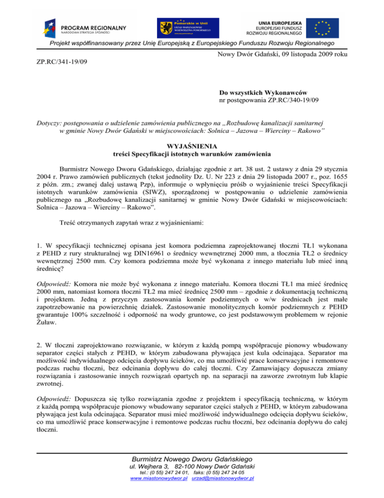 Projekt współfinansowany przez Unię Europejską z Europejskiego Funduszu Rozwoju Regionalnego Nowy Dwór Gdański, 09 listopada 2009 roku ZP.RC/341-19/09 Do wszystkich Wykonawców nr postępowania ZP.RC/340-19/09 Dotyczy: postępowania o udzielenie zamówienia publicznego na „Rozbudowę kanalizacji sanitarnej w gminie Nowy Dwór Gdański w miejscowościach: Solnica – Jazowa – Wierciny – Rakowo” WYJAŚNIENIA treści Specyfikacji istotnych warunków zamówienia Burmistrz Nowego Dworu Gdańskiego, działając zgodnie z art. 38 ust. 2 ustawy z dnia 29 stycznia 2004 r. Prawo zamówień publicznych (tekst jednolity Dz. U. Nr 223 z dnia 29 listopada 2007 r., poz. 1655 z późn. zm.; zwanej dalej ustawą Pzp), informuje o wpłynięciu próśb o wyjaśnienie treści Specyfikacji istotnych warunków zamówienia (SIWZ), sporządzonej w postępowaniu o udzielenie zamówienia publicznego na „Rozbudowę kanalizacji sanitarnej w gminie Nowy Dwór Gdański w miejscowościach: Solnica – Jazowa – Wierciny – Rakowo”. Treść otrzymanych zapytań wraz z wyjaśnieniami: 1. W specyfikacji technicznej opisana jest komora podziemna zaprojektowanej tłoczni TŁ1 wykonana z PEHD z rury strukturalnej wg DIN16961 o średnicy wewnętrznej 2000 mm, a tłocznia TŁ2 o średnicy wewnętrznej 2500 mm. Czy komora podziemna moŜe być wykonana z innego materiału lub mieć inną średnicę? Odpowiedź: Komora nie moŜe być wykonana z innego materiału. Komora tłoczni TŁ1 ma mieć średnicę 2000 mm, natomiast komora tłoczni TŁ2 ma mieć średnicę 2500 mm – zgodnie z dokumentacją techniczną i projektem. Jedną z przyczyn zastosowania komór podziemnych o w/w średnicach jest małe zapotrzebowanie na powierzchnię działek. Zastosowanie monolitycznych komór podziemnych z PEHD gwarantuje 100% szczelność i odporność na wody gruntowe, co jest podstawowym problemem w rejonie śuław. 2. W tłoczni zaprojektowano rozwiązanie, w którym z kaŜdą pompą współpracuje pionowy wbudowany separator części stałych z PEHD, w którym zabudowana pływająca jest kula odcinająca. Separator ma moŜliwość indywidualnego odcięcia dopływu ścieków, co ma umoŜliwić prace konserwacyjne i remontowe podczas ruchu tłoczni, bez odcinania dopływu do całej tłoczni. Czy Zamawiający dopuszcza zmiany rozwiązania i zastosowanie innych rozwiązań opartych np. na separacji na zaworze zwrotnym lub klapie zwrotnej. Odpowiedź: Dopuszcza się tylko rozwiązania zgodne z projektem i specyfikacją techniczną, w którym z kaŜdą pompą współpracuje pionowy wbudowany separator części stałych z PEHD, w którym zabudowana pływająca jest kula odcinająca. Separator musi mieć moŜliwość indywidualnego odcięcia dopływu ścieków, co ma umoŜliwić prace konserwacyjne i remontowe podczas ruchu tłoczni, bez odcinania dopływu do całej tłoczni. Burmistrz Nowego Dworu Gdańskiego ul. Wejhera 3, 82-100 Nowy Dwór Gdański tel.: (0 55) 247 24 01, faks: (0 55) 247 24 05 www.miastonowydwor.pl [email protected] 3. Czy Zamawiający dopuszcza zastosowanie tłoczni i pompowni pochodzących od róŜnych producentów. Odpowiedź: W obrębie realizowanego zadania nie dopuszcza się zastosowania tłoczni i pompowni pochodzących od róŜnych producentów. 4. W specyfikacji technicznej w opisie sterowania pompowni Ps1, Ps2, Ps3, Ps4, Ps5, Ps6, Ps7, Ps8, Ps9 jako wyposaŜenie tablicy sterowniczej wskazano zarówno pływaki jaki i sondę pneumatyczną. Czy Zamawiający mógłby sprecyzować jaki naleŜy zastosować sposób pomiaru poziomu ścieków w w/w pompowniach? Odpowiedź: Pomiar poziomu ścieków realizowany ma być za pomocą sondy hydrostatycznej 4-20 mA. Tablica sterownicza wyposaŜona ma być w następujące elementy: - wyłącznik główny - wyłącznik róŜnicowo-prądowy - czujnik zaniku faz - przełącznik rodzaju sterowania ręczny / automat - lampki sygnalizacyjne pracy i awarii pomp i zasilania - zabezpieczenie przepięciowe kl.C - lampa alarmowa zewnętrzna - ogrzewanie szafy z termoregulatorem (zabezpieczenie przed roszeniem), - liczniki czasu pracy pomp, - zabezpieczenie przed suchobiegiem - zabezpieczenia zwarciowe i przeciąŜeniowe - wyświetlacz poziomu ścieków - sterownik - sonda hydrostatyczna 4-20 mA. - przewód do sondy 10 metrów - pływak szt.1 - moduł GSM - woltomierz szt.1 z przełącznikiem - amperomierz szt.2 - gniazdo remontowe 220V - gniazdo remontowe 400V - oświetlenie - gniazdo do agregatu z odpowiednim zabezpieczeniem. 5. Zgodnie z odpowiedzią na pytanie numer 5 z dnia 04.11.2009 r., prosimy o udostępnienie załączników do SIWZ w wersji edytowalnej (Word) na stronie internetowej wyŜej wymienionego postępowania. Odpowiedź: Zamawiający podtrzymuje swoją decyzję – nie przychyla się do powyŜszej prośby. 6. Ilość przewiertów zawartych w przedmiarze oraz w projekcie dotyczącym rozbudowy kanalizacji sanitarnej jest róŜna. I tak według przedmiaru jest do wykonania 2792 mb przewiertu, a według projektu 4055 mb. Proszę o wyjaśnienie tej rozbieŜności. 2 Odpowiedź: Zgłoszone rozbieŜności pomiędzy długościami przewiertów w przedmiarach, a długościami w dokumentacji projektowej nie występują. Nie moŜna zmieniać długości przewiertów w przedmiarach robót. 7. Długości poszczególnych przewiertów w przedmiarach nie pokrywają się z długościami przewiertów z profili kanalizacji. Czy moŜna zmienić długości przewiertów w przedmiarach? Odpowiedź: Patrz – odpowiedź na pytanie 6. Z powaŜaniem, BURMISTRZ Tadeusz Studziński 3