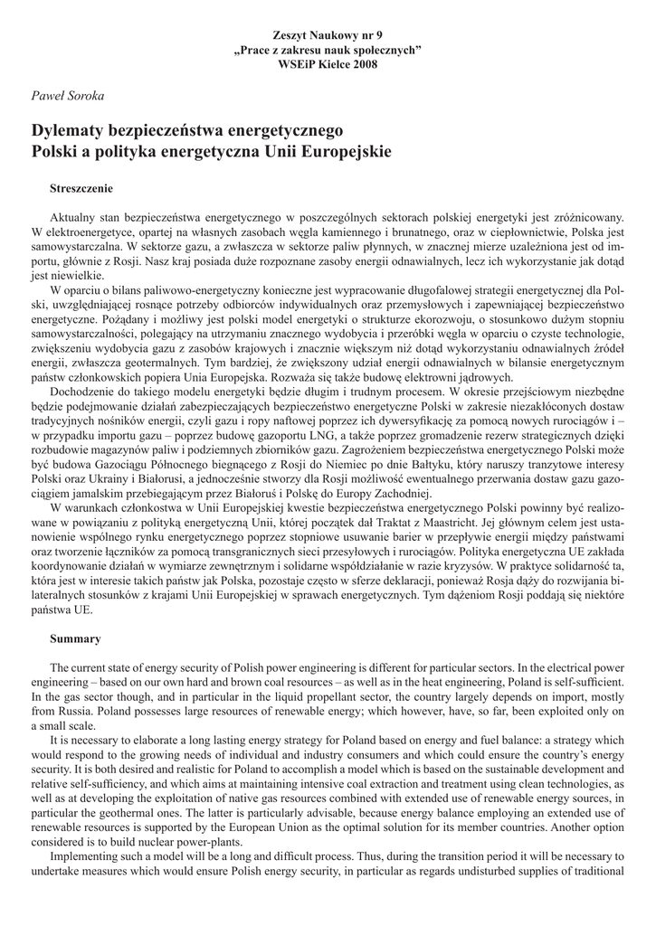 Zeszyt Naukowy nr 9 „Prace z zakresu nauk społecznych” WSEiP Kielce 2008 Paweł Soroka Dylematy bezpieczeństwa energetycznego Polski a polityka energetyczna Unii Europejskie Streszczenie Aktualny stan bezpieczeństwa energetycznego w poszczególnych sektorach polskiej energetyki jest zróżnicowany. W elektroenergetyce, opartej na własnych zasobach węgla kamiennego i brunatnego, oraz w ciepłownictwie, Polska jest samowystarczalna. W sektorze gazu, a zwłaszcza w sektorze paliw płynnych, w znacznej mierze uzależniona jest od importu, głównie z Rosji. Nasz kraj posiada duże rozpoznane zasoby energii odnawialnych, lecz ich wykorzystanie jak dotąd jest niewielkie. W oparciu o bilans paliwowo-energetyczny konieczne jest wypracowanie długofalowej strategii energetycznej dla Polski, uwzględniającej rosnące potrzeby odbiorców indywidualnych oraz przemysłowych i zapewniającej bezpieczeństwo energetyczne. Pożądany i możliwy jest polski model energetyki o strukturze ekorozwoju, o stosunkowo dużym stopniu samowystarczalności, polegający na utrzymaniu znacznego wydobycia i przeróbki węgla w oparciu o czyste technologie, zwiększeniu wydobycia gazu z zasobów krajowych i znacznie większym niż dotąd wykorzystaniu odnawialnych źródeł energii, zwłaszcza geotermalnych. Tym bardziej, że zwiększony udział energii odnawialnych w bilansie energetycznym państw członkowskich popiera Unia Europejska. Rozważa się także budowę elektrowni jądrowych. Dochodzenie do takiego modelu energetyki będzie długim i trudnym procesem. W okresie przejściowym niezbędne będzie podejmowanie działań zabezpieczających bezpieczeństwo energetyczne Polski w zakresie niezakłóconych dostaw tradycyjnych nośników energii, czyli gazu i ropy naftowej poprzez ich dywersyfikację za pomocą nowych rurociągów i – w przypadku importu gazu – poprzez budowę gazoportu LNG, a także poprzez gromadzenie rezerw strategicznych dzięki rozbudowie magazynów paliw i podziemnych zbiorników gazu. Zagrożeniem bezpieczeństwa energetycznego Polski może być budowa Gazociągu Północnego biegnącego z Rosji do Niemiec po dnie Bałtyku, który naruszy tranzytowe interesy Polski oraz Ukrainy i Białorusi, a jednocześnie stworzy dla Rosji możliwość ewentualnego przerwania dostaw gazu gazociągiem jamalskim przebiegającym przez Białoruś i Polskę do Europy Zachodniej. W warunkach członkostwa w Unii Europejskiej kwestie bezpieczeństwa energetycznego Polski powinny być realizowane w powiązaniu z polityką energetyczną Unii, której początek dał Traktat z Maastricht. Jej głównym celem jest ustanowienie wspólnego rynku energetycznego poprzez stopniowe usuwanie barier w przepływie energii między państwami oraz tworzenie łączników za pomocą transgranicznych sieci przesyłowych i rurociągów. Polityka energetyczna UE zakłada koordynowanie działań w wymiarze zewnętrznym i solidarne współdziałanie w razie kryzysów. W praktyce solidarność ta, która jest w interesie takich państw jak Polska, pozostaje często w sferze deklaracji, ponieważ Rosja dąży do rozwijania bilateralnych stosunków z krajami Unii Europejskiej w sprawach energetycznych. Tym dążeniom Rosji poddają się niektóre państwa UE. Summary The current state of energy security of Polish power engineering is different for particular sectors. In the electrical power engineering – based on our own hard and brown coal resources – as well as in the heat engineering, Poland is self-sufficient. In the gas sector though, and in particular in the liquid propellant sector, the country largely depends on import, mostly from Russia. Poland possesses large resources of renewable energy; which however, have, so far, been exploited only on a small scale. It is necessary to elaborate a long lasting energy strategy for Poland based on energy and fuel balance: a strategy which would respond to the growing needs of individual and industry consumers and which could ensure the country’s energy security. It is both desired and realistic for Poland to accomplish a model which is based on the sustainable development and relative self-sufficiency, and which aims at maintaining intensive coal extraction and treatment using clean technologies, as well as at developing the exploitation of native gas resources combined with extended use of renewable energy sources, in particular the geothermal ones. The latter is particularly advisable, because energy balance employing an extended use of renewable resources is supported by the European Union as the optimal solution for its member countries. Another option considered is to build nuclear power-plants. Implementing such a model will be a long and difficult process. Thus, during the transition period it will be necessary to undertake measures which would ensure Polish energy security, in particular as regards undisturbed supplies of traditional energy carriers, i.e. gas and oil. The measures should focus on diversifying the supplies by means of new pipelines, and – in case of gas supplies – by the LNG gas terminal, as well as by building underground gas holders and fuel repositories, where strategic reserve stocks could be stored. What may pose a threat to the Polish energy security is the construction of the Northern Gas Pipeline from Russia to Germany through the Baltic Sea, as it may affect the interests of Poland, Ukraine, and Belarus; it may also enable Russia to suspend gas supplies transferred via the Yamal-Europe Pipeline, running through Poland and Belarus to the Western Europe. Poland, being an EU member, should implement its energy security measures in accordance with the Union’s energy policy, initiated by the Maastricht Treaty. The main objective of this policy is to establish a common energy market by gradual removal of barriers hindering free energy transfer between member countries, as well as strengthening ties by the construction of transboundary main