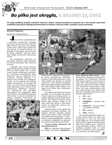 Klub Ludzi Artystycznie Niewyżytych – II LO w Krośnie 2007 Bo piłka jest okrągła, A BRAMKI SĄ DWIE Po mojej wnikliwej analizie ostatnich numerów „Klanu” zaobserwowałem, że pojawia się w nim bardzo mała ilość artykułów sportowych. Dlatego postanowiłem to zmienić i stworzyć tekst o tematyce czysto sportowej. Dariusz Filipowicz Mieszkaniec Leśnego Królestwa J est to jedna z najpiękniejszych i najbardziej popularnych dyscyplin sportowych. Łączy ona miliony ludzi na całym świecie. Jak łatwo się domyślić, chodzi tutaj o piłkę nożną. Jestem jednak pewien, że niewielu kibiców zna początki tej dyscypliny. Jak powstawała? Kiedy rozegrano pierwszy mecz? Gdzie odbyły się pierwsze mistrzostwa świata? Dla zaspokojenia ciekawości postanowiłem zamieścić kilka informacji, bez których prawdziwy kibic obejść się nie może. Podwaliny pod rozwój nowoczesnego futbolu położyła Anglia. W wieku XVII oraz XVIII stanęła ona u szczytu swego rozwoju militarnego, umysłowego a zwłaszcza przemysłowego. Klasa robotnicza stała się najliczniej reprezentowaną warstwą społeczną i to właśnie tutaj football był najpopularniejszy, ale nie gardzili nim studenci i ludzie wykształceni. W początku XIX wieku do coraz liczniej powstających szkół publicznych (m.in. Harrow, Eton, Charterhouse, Winchester, Westminster, Shrewsbury) ową dyscyplinę wprowadzono do programów szkolnych. Futbol w tych szkołach przybierał różne formy, a z czasem uwydatniał się szkielet przepisów dotyczących gry w futbol - każdy inny w poszczególnej szkole. By móc rozgrywać międzyszkolne mecze, postanowiono ujednolicić przepisy. Próby takiej dokonano w roku 1946, jednak czas pokazał, że football musiał iść w dwu różnych kierunkach: piłkę nożną, gdzie głównym postulatem był zakaz łapania piłki rękami, oraz rugby, które bliższe było tradycyjnym metodom gry. Idea piłkarskich Mistrzostw Świata narodziła się na początku XX stulecia. Pomysł organizacji turnieju, który wyłoniłby najlepszą drużynę futbolową na świecie, był dziełem Francuza Julesa Rimeta. Jego marzenie ziściło się 28 maja 1928 roku, kiedy to FIFA postanowiła, że mistrzostwa zostaną rozegrane w roku 1930. Jedynym krajem, który zgłosił chęć organizacji pierwszego mundialu, był Urugwaj. Ojczyzna mistrzów olimpijskich w piłce nożnej z 1924 i 1928 roku, a na dodatek kraj obchodzący w 1930 r. stulecie swojej niepodległości, wydawał się idealnym kandydatem na gospodarza premierowych Mistrzostw Świata. I jeszcze krótki „słowniczek” dla niewtajemniczonych: FIFA (fr. Fédération Internationale de Football Association) Międzynaro- 24 dowa Federacja Piłki Nożnej) – międzynarodowa organizacja pozarządowa zrzeszająca 214 narodowych federacji piłki nożnej, założona w Paryżu dnia 21 maja 1904. FIFA organizuje światowe rozgrywki piłkarskie (turnieje olimpijskie, mistrzostwa świata kobiet i mężczyzn oraz grup młodzieżowych itp.) oraz ustala przepisy gry w piłkę nożną. FIFA jest nadrzędną organizacją wobec federacji regionalnych: AFC – Azja CAF – Afryka CONMEBOL – Ameryka Południowa CONCACAF – Ameryka Północna, Środkowa i Karaiby OFC – Oceania UEFA – Europa Dla prawdziwego kibica piłka nożna albo inaczej futbol jest czymś najważniejszym w życiu. Jest dla niego drugą religią. Nie ma nic bardziej świętego od meczu, podczas którego tysiące ludzi łączy wspólna pasja i miłość do swojej ukochanej drużyny. Futbol jest wspólnym językiem ludzi na całym świecie. Oczywiście można powiedzieć, że to tylko gra, jak wiele innych, Klub Ludzi Artystycznie Niewyżytych – II LO w Krośnie 2007 lecz dla nas jest to wspaniała opowieść o bohaterach i ich drużynach, lojalności, oddaniu i walce, jaką toczą zawodnicy przez 90 minut. Chwila, gdy miliony kibiców przed telewizorami i na stadionie wstrzymują oddech, obserwując wojnę dwóch drużyn, jest czymś, czego nie da się opisać. Dla nich liczy się tylko zwycięstwo, przegrana oznacza hańbę. Łzy przegranych, radość zwycięzców to nieodłączne elementy tego widowiska. Jest to coś wspaniałego, coś czego człowiek, który nie interesuje się sportem, nie może pojąć i zrozumieć. Na tym polega piękno futbolu, dlatego sport ten uważany jest za najpiękniejszy na całej kuli ziemskiej. Postanowiłem jednak zadać pytanie wśród rodziny i znajomych: czym dla nich jest futbol? Oto niektóre z odpowiedzi: Janusz (53 l): Dla mnie jest to po prostu jedna z wielu dyscyplin sportowych. Nie mam czasu interesować się futbolem, ale oczywiście lubię oglądnąć dobry „meczyk” z kufelkiem piwka w ręce. Niestety, rzadko dotrwam do końca, ponieważ zasypiam. Magda (25 l): Według mnie piłka nożna jest bez sensu. 22 chłopaków biega 90 minut za jedną piłką i do tego kopią się po nogach. Głupota. Marek (29 l): Dla mnie futbol to przede wszystkim hobby i rozrywka. Najlepszym wypoczynkiem jest ogląd- nąć z przyjaciółmi ciekawy mecz. Często też z kumplami wynajmujemy salę i gramy w piłkę, jest to dobry sposób, aby się rozerwać i odstresować. Ela (46 l): W moim domu piłka jest najważniejsza. Mój mąż i syn są zafascynowani tym sportem. Dlatego, chcąc nie chcąc, muszę orientować się w tych sprawach. Najgorsze jest to, że nigdy nie mogę oglądnąć telenoweli, bo zawsze jest jakiś mecz. A i jeszcze nie mogę zrozumieć, co to jest spalony. Oczywiście wielu ludzi udaje prawdziwych i oddanych kibiców. Tak naprawdę przechwalają się, aby wzbudzić wśród przyjaciół i znajomych podziw oraz zazdrość. Tacy kibice są jak „chorągiewka na wietrze”, gdzie powieje wiatr, tam zwracają swoją uwagę. Nie są wierni jednej, ukochanej drużynie, tylko tej, która w tym momencie jest modna i zdobywa wiele tytułów. To nie są prawdziwi kibice i powinni się wstydzić swojego powania. Jak mo, żaden piłkarski team nie mo