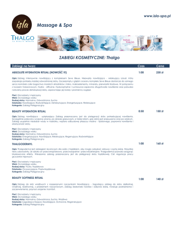 www.isla-spa.pl Massage & Spa ZABIEGI KOSMETYCZNE: Thalgo Zabiegi na twarz ABSOLUTE HYDRATION RITUAL (NOWOŚĆ !!!) Czas Cena 1:00 230 zł 0:50 150 zł 1:00 160 zł 1:00 140 zł Opis: Zabieg intensywnie nawilżający z kompleksem Seve Bleue. Niezwykły nawilżająco - relaksujący rytuał, który zaspakaja potrzeby każdej odwodnionej skóry. Zaczerpnięty z głębin oceanu kompleks Seve Bleue dostarcza do samego serca komórek całe bogactwo morskich składników: mikro, makroelementy, minerały, pierwiastki śladowe. W połączeniu z kwasem hialuronowym, Hydra - diffusine, Hyalurophyline i Lumisource zapewnia długotrwałe nawilżenie oraz pobudza naturalny proces detoksykacji skóry, zapewniając jej świeży i promienny wygląd. Płeć: Dla kobiety i mężczyzny Wiek: Do każdego wieku Rodzaj skóry: Normalna, Odwodniona, Sucha Działania: Nawilżające, Rozświetlające, Detoksytujące, Energetyzujące, Relaksujące Kategoria: Zabieg Pielęgnacyjny BEAUTY HYDRATION RITUAL Opis: Zabieg nawilżająco - upiększający Zabieg przeznaczony jest do pielęgnacji skóry potrzebującej nawilżenia. Szczególnie polecany wczesną wiosną, po okresie grzewczym, a także latem, gdy skóra jest przesuszona oraz po solarium. Zabieg uzupełnia niedobór wody w naskórku, wspiera odbudowę płaszczu wodno - lipidowego, poprawia nawilżenie i elastyczność skóry. Płeć: Dla kobiety i mężczyzny Wiek: Do każdego wieku Rodzaj skóry: Normalna, Odwodniona, Sucha Działania: Energetyzujące, Nawilżające, Relaksujące, Regenujące, Rozświetlające Kategoria: Zabieg Pielęgnacyjny THALGODERMYL Opis: Thalgodermyl jest zabiegiem leczniczym dla osób z trądzikiem, aby mogły odzyskać zdrową i czystą skórę. Wszystkie testy udowodniły, że działa on przeciwłojotokowo, przeciwzapalnie i przeciwbakteryjnie. Thalgodermyl pozwala osiągnąć błyskawiczne efekty. Wskazania: zabieg przeznaczony jest do pielęgnacji skóry trądzikowej. Cel: regulacja pracy gruczołów łojowych. Płeć: Dla kobiety i mężczyzny Wiek: Do każdego wieku Rodzaj skóry: Tłusta, Trądzikowa Działania: Oczyszczające, Przeiwtrądzikowe Kategoria: Zabieg Pielęgnacyjny BEAUTY SOFTNESS RITUAL Opis: Zabieg do skór wrażliwych z rozszerzonymi naczynkami Nawilżająco - łagodzący zabieg do skóry delikatnej, wrażliwej, reaktywnej, z problemem naczyniowym. Zabieg doskonale nawilża i odżywia skórę, niweluje podrażnienia i zaczerwienienia, przynosi ukojenie i komfort. Płeć: Dla kobiety i mężczyzny Wiek: Do każdego wieku Rodzaj skóry: Normalna, Odwodniona, Sucha, Wrażliwa Działanie: Łagodząco-Kojące, Nawilżające, Ochronne, Regenerujące Kategoria: Zabieg Pielęgnacyjny Zabiegi na twarz MARINE SOFTNESS RITUAL Czas Cena 1:00 230 zł 1:00 260 zł 1:00 290 zł 1:00 330 zł Opis: Zabieg do skór wrażliwych z rozszerzonymi naczynkami Skóra wrażliwa to skóra o nadmiernej reaktywności na bodźce zewnętrzne. Pieczenie, ogólne zaczerwienienie, swędzenie i podrażnienie - to zaledwie kilka z wielu oznak dyskomfortu odczuwanego przez osoby ze skórą wrażliwą. Firma Thalgo opracowała program pielęgnacji, który ma za zadanie ukoić skórę, złagodzić jej podrażnienia i uszczelnić rozszerzone naczynia krwionośne. Naturalne aktywne składniki, otrzymane dzięki wykorzystaniu nowoczesnych technologii, redukują powierzchowną wrażliwość skóry i zmniejszają reakcje komórek skóry na agresywne czynniki. Płeć: Dla kobiety i mężczyzny Wiek: Do każdego wieku Rodzaj skóry: Odwodniona, Normalna, Wrażliwa Działanie: Łagodząco-Kojące, Nawilżające, Ochronne, Regenerujące Kategoria: Zabieg Pielęgnacyjny MARINE COLLAGEN TREATMENT (NOWOŚĆ !!!) Opis: Skóra w naturalnych warunkach potrafi regulować sobie poziom nawilżenia czerpiąc go z wewnątrz naszego organizmu, a także ze środowiska zewnętrznego. Żyjąc jednak w obecnym zanieczyszczonym środowisku, aglomeracji miejskiej, przebywając często w klimatyzowanych pomieszczeniach, narażeni jesteśmy na odwodnienie naskórka, a co za tym idzie, z przedwczesnym starzeniem się skóry. Marine Collagen Treatment to intensywny zabieg nawilżający na "pierwsze zmarszczki" z użyciem maski nasyconej wysokim koncentratem naturalnego rozpuszczalnego kolagenu. Zabieg neutralizuje uczucie nadmiernego napięcia, stymuluje produkcję nowych włókien kolagenu, małe zmarszczki spowodowane przesuszeniem skóry natychmiast znikają, a skóra odzyskuje komfort, gładkość i blask. Zawartość składników aktywnych ( Native Marine Collagen Complex, glikopeptydy z soi, czerwona alga Palmaria Palmata ) sprawia, że skóra już po pierwszym zabiegu jest rozświetlona, doskonale nawilżona i aksamitnie gładka. Zabieg kierowany jest dla osób po 25 roku życia. Wskazania: zabieg przeznaczony jest do pielęgnacji skóry potrzebującej głębokiego nawilżenia. Cel: zabieg ma na celu stworzyć barierę ochronną przed odparowaniem wody z zewnętrznych warstw naskórka, wygładzić drobne zmarszczki spowodowane odwodnieniem skóry. Płeć: Dla kobiety i mężczyzny Wiek: 26-35 Rodzaj skóry: Normalna, Mieszana, Sucha, Wrażliwa Działanie: Anty-Ageing, Nawilżające, Wygładzające Kategoria: Zabieg pielęgnacyjny MARINE HYALURONIC TREATMENT (NOWOŚĆ !!!) Opis: Innowacyjny zabieg na bazie kwasu hialuronowego. Usuwa pierwsze oznaki starzenia się skóry i precyzyjnie wypełnia zmarszczki. Błyskawiczny efekt zapewniają mikrosfery z cząsteczkami kwasu hialuronowego. Przy kontakcie z wodą zwiększają swoją objętość i wypychają zmarszczki od wewnątrz, mają właściwości wychwytywania wody, a GAG, znajdujące się pomiędzy włóknami kolagenu i elastyny, ograniczają utratę wody. Zabieg regeneruje skórę, redukuje ilość i głębokość zmarszczek, chroni komórki przed szkodliwym wpływem wolnych rodników, wzmacnia skórę oraz modeluje owal twarzy. Wskazania: skóra odwodniona z widocznymi zmarszczkami, potrzebująca nawilżenia i regeneracji.