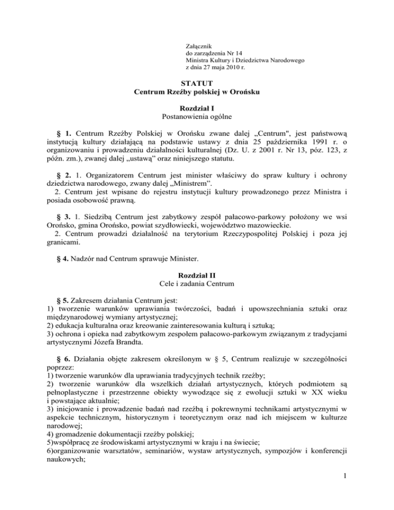 Załącznik do zarządzenia Nr 14 Ministra Kultury i Dziedzictwa Narodowego z dnia 27 maja 2010 r. STATUT Centrum Rzeźby polskiej w Orońsku Rozdział I Postanowienia ogólne § 1. Centrum Rzeźby Polskiej w Orońsku zwane dalej „Centrum", jest państwową instytucją kultury działającą na podstawie ustawy z dnia 25 października 1991 r. o organizowaniu i prowadzeniu działalności kulturalnej (Dz. U. z 2001 r. Nr 13, póz. 123, z późn. zm.), zwanej dalej „ustawą” oraz niniejszego statutu. § 2. 1. Organizatorem Centrum jest minister właściwy do spraw kultury i ochrony dziedzictwa narodowego, zwany dalej „Ministrem”. 2. Centrum jest wpisane do rejestru instytucji kultury prowadzonego przez Ministra i posiada osobowość prawną. § 3. 1. Siedzibą Centrum jest zabytkowy zespół pałacowo-parkowy połoŜony we wsi Orońsko, gmina Orońsko, powiat szydłowiecki, województwo mazowieckie. 2. Centrum prowadzi działalność na terytorium Rzeczypospolitej Polskiej i poza jej granicami. § 4. Nadzór nad Centrum sprawuje Minister. Rozdział II Cele i zadania Centrum § 5. Zakresem działania Centrum jest: 1) tworzenie warunków uprawiania twórczości, badań i upowszechniania sztuki oraz międzynarodowej wymiany artystycznej; 2) edukacja kulturalna oraz kreowanie zainteresowania kulturą i sztuką; 3) ochrona i opieka nad zabytkowym zespołem pałacowo-parkowym związanym z tradycjami artystycznymi Józefa Brandta. § 6. Działania objęte zakresem określonym w § 5, Centrum realizuje w szczególności poprzez: 1) tworzenie warunków dla uprawiania tradycyjnych technik rzeźby; 2) tworzenie warunków dla wszelkich działań artystycznych, których podmiotem są pełnoplastyczne i przestrzenne obiekty wywodzące się z ewolucji sztuki w XX wieku i powstające aktualnie; 3) inicjowanie i prowadzenie badań nad rzeźbą i pokrewnymi technikami artystycznymi w aspekcie technicznym, historycznym i teoretycznym oraz nad ich miejscem w kulturze narodowej; 4) gromadzenie dokumentacji rzeźby polskiej; 5)współpracę ze środowiskami artystycznymi w kraju i na świecie; 6)organizowanie warsztatów, seminariów, wystaw artystycznych, sympozjów i konferencji naukowych; 1 7) promowanie rzeźby polskiej i jej wybitnych twórców w kraju i za granicą; 8) organizowanie stałej ekspozycji tradycji Orońska związanej z Józefem Brandtem; 9) popularyzację kunsztów artystycznych, wiedzy o sztuce oraz wiedzy o Józefie Brandcie i jego epoce; 10) prowadzenie działalności wydawniczej w zakresie określonym celami Centrum; 11) tworzenie warunków integracji róŜnych dziedzin kultury; 12) inicjowanie, prowadzenie i wspieranie projektów badawczych, edukacyjnych, kulturalnych, akcji społecznych realizujących cele Centrum. § 7. Centrum swoje cele realizuje we współpracy ze środowiskiem rzeźbiarzy, innymi środowiskami artystycznymi i naukowymi, a takŜe ze szkołami i uczelniami artystycznymi, instytucjami kultury, państwowymi i prywatnymi podmiotami gospodarczymi oraz społecznym ruchem kulturalnym. Rozdział III Organy zarządzające i doradcze § 8. Organami Centrum są: Dyrektor Centrum, zwany dalej „Dyrektorem” i Rada Programowa. § 9. 1. Dyrektora powołuje i odwołuje Minister w trybie określonym ustawą. 2. Dyrektor zarządza Centrum przy pomocy Zastępców. 3. Zastępców Dyrektora powołuje i odwołuje Dyrektor. § 10. 1. Dyrektor zarządza całokształtem działalności Centrum. Czuwa nad mieniem Centrum i jest za nie odpowiedzialny. 2. Do zakresu działania Dyrektora naleŜy w szczególności: 1) ogólne kierownictwo w sprawach działalności podstawowej i administracyjnej; 2) reprezentowanie Centrum na zewnątrz; 3) przedstawianie właściwym instytucjom i organizatorowi planów rzeczowych i finansowych, sprawozdań oraz wniosków inwestycyjnych; 4) naczelna redakcja wydawnictw Centrum; 5) wydawanie w obowiązującym trybie regulaminów i zarządzeń; 6) sprawowanie ogólnego nadzoru nad kontrolą wewnętrzną; 7) zawieranie i rozwiązywanie umów o pracę z pracownikami Centrum oraz podejmowanie decyzji wynikających ze stosunku pracy. § 11. 1. Organem opiniodawczo - doradczym Dyrektora jest Rada Programowa składająca się z 10 - 15 osób. 2. Do zadań Rady Programowej w szczególności naleŜy: 1) opiniowanie programów i planów Centrum oraz ocena ich realizacji; 2) poszukiwanie nowych form wsparcia organizacyjnego, koncepcyjnego i finansowego działalności Centrum; 3) wyraŜanie opinii i składanie wniosków do Dyrektora we wszystkich istotnych sprawach związanych z działalnością Centrum. 3. Członków Rady Programowej powołuje na okres 3 lat Dyrektor spośród twórców i nauczycieli rzeźby, historyków i krytyków sztuki oraz osób wspierających rozwój sztuki po zasięgnięciu opinii Ministra. 4. Odwołanie członków Rady Programowej następuje w tym samym trybie. 2 5. Szczegółowy tryb działania Rady Programowej określa regulamin ustalony przez Dyrektora. 6. Dyrektor moŜe powoływać inne organy o charakterze doradczym i opiniodawczym. Rozdział IV Organizacja § 12. 1. Organizację wewnętrzną Centrum oraz ramowy zakres działania jego komórek organizacyjnych i samodzielnych stanowisk pracy określa regulamin organizacyjny nadany przez Dyrektora, po zasięgnięciu opinii Ministra oraz opinii działających w niej organizacji związkowych i stowarzyszeń twórców. 2. Wszelkie zmiany regulaminu organizacyjnego są dokonywane w trybie określonym dla jego nadania. Rozdział V Majątek i finanse § 13. 1. Centrum gospodaruje samodzielnie przydzieloną i nabytą częścią mienia oraz prowadzi samodzielną gospodarkę finansową w ramach posiadanych środków, na zasadach określonych w ustawie. 2. Działalność Centrum finansowana jest z dotacji Ministra, z wpływów uzyskanych z prowadzonej działalności, ze środków otrzymywanych z funduszy krajowych i zagranicznych – w tym Unii Europejskiej, od osób prawnych i fizycznych oraz z in