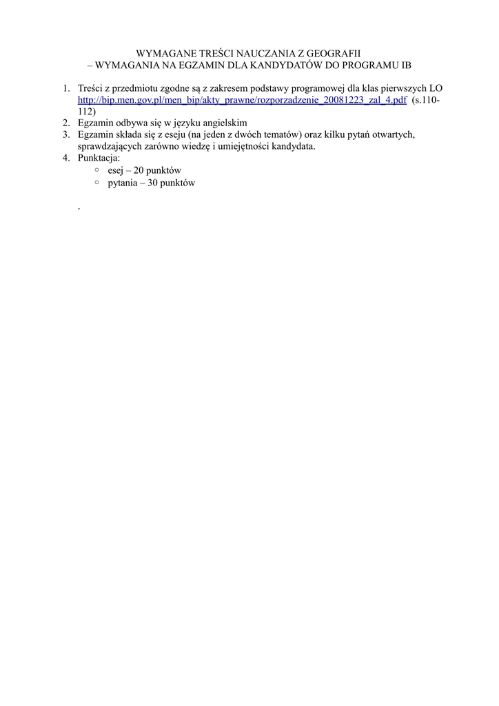 WYMAGANE TREŚCI NAUCZANIA Z GEOGRAFII – WYMAGANIA NA EGZAMIN DLA KANDYDATÓW DO PROGRAMU IB 1. Treści z przedmiotu zgodne są z zakresem podstawy programowej dla klas pierwszych LO http://bip.men.gov.pl/men_bip/akty_prawne/rozporzadzenie_20081223_zal_4.pdf (s.110112) 2. Egzamin odbywa się w języku angielskim 3. Egzamin składa się z eseju (na jeden z dwóch tematów) oraz kilku pytań otwartych, sprawdzających zarówno wiedzę i umiejętności kandydata. 4. Punktacja: ◦ esej – 20 punktów ◦ pytania – 30 punktów .