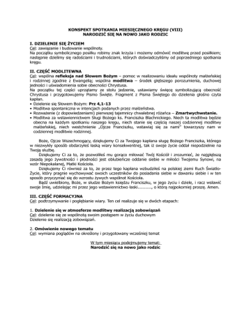KONSPEKT SPOTKANIA MIESIĘCZNEGO KRĘGU (VIII) NARODZIĆ SIĘ NA NOWO JAKO RODZIC ! I. DZIELENIE SIĘ ŻYCIEM Cel: zawiązanie i budowanie wspólnoty. Na początku symbolicznego posiłku robimy znak krzyża i możemy odmówić modlitwę przed posiłkiem; następnie dzielimy się radościami i trudnościami, których doświadczyliśmy od poprzedniego spotkania kręgu. ! II. CZĘŚĆ MODLITEWNA Cel: wspólna refleksja nad Słowem Bożym – pomoc w realizowaniu ideału wspólnoty małżeńskiej i rodzinnej zgodnie z Ewangelią; wspólna modlitwa – środek głębszego porozumienia, duchowej jedności i uświadomienia sobie obecności Chrystusa. Na początku tej części uprzątamy ze stołu jedzenie, ustawiamy święcę symbolizującą obecność Chrystusa i przygotowujemy Pismo Święte. Fragment z Pisma Świętego do dzielenia głośno czyta kapłan. • Dzielenie się Słowem Bożym: Prz 4,1-13 • Modlitwa spontaniczna w intencjach podanych przez małżeństwa. • Rozważenie (z dopowiedzeniami) pierwszej tajemnicy chwalebnej różańca – Zmartwychwstanie. • Modlitwa za wstawiennictwem Sługi Bożego ks. Franciszka Blachnickiego. Niech ta modlitwa będzie obecna na każdym spotkaniu naszego kręgu, niech stanie się częścią naszej codziennej modlitwy małżeńskiej, niech westchnienie „Ojcze Franciszku, wstawiaj się za nami” towarzyszy nam w codziennej modlitwie rodzinnej. ! Boże, Ojcze Wszechmogący, dziękujemy Ci za Twojego kapłana sługę Bożego Franciszka, którego w niezwykły sposób obdarzyłeś łaską wiary konsekwentnej, tak iż swoje życie oddał niepodzielnie na Twoją służbę. Dziękujemy Ci za to, że pozwoliłeś mu gorąco miłować Twój Kościół i zrozumieć, że najgłębszą zasadą jego żywotności i płodności jest oblubieńcze oddanie siebie w miłości Twojemu Synowi, na wzór Niepokalanej, Matki Kościoła. Dziękujemy Ci również za to, że przez tego kapłana wzbudziłeś na polskiej ziemi Ruch ŚwiatłoŻycie, który pragnie wychowywać swoich uczestników do posiadania siebie w dawaniu siebie i w ten sposób przyczyniać się do wzrostu żywych wspólnot Kościoła. Bądź uwielbiony, Boże, w słudze Bożym księdzu Franciszku, w jego życiu i dziele, i racz wsławić swoje Imię, udzielając mi przez jego wstawiennictwo łaski..........., o którą najpokorniej proszę. Amen. ! ! III. CZĘŚĆ FORMACYJNA Cel: podtrzymywanie i pogłębianie wiary. Ten cel realizuje się w dwóch etapach: 1. Dzielenie się w atmosferze modlitwy realizacją zobowiązań Cel: dzielenie się ze wspólnotą swoim postępem w życiu duchowym Dzielenie się realizacją zobowiązań. ! ! ! 2. Omówienie nowego tematu Cel: wymiana poglądów na określony i przygotowany wcześniej temat W tym miesiącu podejmujemy temat: Narodzić się na nowo jako rodzic !! !! !! ! Domowy Kościół dąży do odnowy małżeństwa i rodziny poprzez wdrażanie do postawy służby we wspólnocie Kościoła, według otrzymanych darów. ! !! ! ! Zasady DK, pkt. 11 W okresie Wielkiego Postu staje przed nami KRZYŻ Chrystusa. Tak bowiem Bóg umiłował świat, że Syna swego Jednorodzonego dał, aby każdy, kto w Niego wierzy, nie zginął, ale miał życie wieczne (J 3,16). Myśląc ludzkimi kategoriami nie takiej przyszłości pragnęlibyśmy dla własnych dzieci. Pragniemy, aby dzieci miały lepsze życie niż my sami, aby były zdrowe, wykształcone, kulturalne i wierzyły w Boga tak jak my. Nie zawsze te plany udaje się zrealizować; zdarza się, że dzieci wybierają drogę i styl życia, który nam się nie podoba, czasami cierpimy z tego powodu. Jeśli my ze swej strony zrobiliśmy wszystko, co należało zrobić w ramach katechumenatu rodzinnego: codziennie modliliśmy się wspólnie, czytaliśmy z dziećmi Słowo Boże, dzieliliśmy się wiarą, dawaliśmy świadectwo, kim jest dla nas Jezus i potwierdzaliśmy to świadectwo życiem, ale dzieci żyją jak poganie, odrzucają Boga, odrzucają Kościół i biorą przykład ze świata, to nadal pozostaje nam modlitwa o łaskę wiary dla nich i postawa świadków: uczciwych, potrafiących przebaczać, ufających Bogu w przeciwnościach, niosących swój krzyż. Czasami jednak patrzymy na sukcesy wychowawcze innych rodzin i chcielibyśmy, aby bez wysiłku i poświęcania dzieciom czasu podobnie było u nas, aby dobre relacje rodzinne „spadły nam z nieba”. Jak jednak trzeba systematycznie pracować nad jednością małżeńską, tak też i wychowywanie dzieci to projekt na wiele lat, wymagający naszego czasu i zaangażowania na kilku płaszczyznach. ! ! 1. Wychowywanie dzieci do żywej wiary – bliskiej relacji z Chrystusem. Co powinniśmy zrobić jako rodzice, aby ścieżki wiary były wspólne dla nas i naszych dzieci? Co robić w sytuacji, gdy dzieci/wnuki straciły wiarę i zagubiły się w sprawach doczesnych? Najważniejszym zadaniem rodziców jest przyprowadzenie dziecka do Chrystusa. Dlaczego? Jeśli wierzymy w życie wieczne, nie możemy ograniczać naszej rodzicielskiej troski do spraw ziemskich, takich jak jedzenie, mieszkanie i ubranie. Jeśli nawet zapewnimy dzieciom luksusy tutaj, na ziemi, to jest to niezmiernie krótki czas wobec wieczności. Zatem najpierw trzeba położyć właściwy fundament fundamentu bowiem nikt nie może położyć innego, jak ten, który jest położony, a którym jest Jezus Chrystus (1 Kor 3,11). Ksiądz Franciszek Blachnicki zauważył, że dziecko dochodzi do postaw religijno-moralnych przez uczestnictwo w postawach religijno-moralnych ludzi, z którymi jest związane więzami miłości i sympatii. Dziecko po prostu uczestniczy w sposobie postępowania, wartościowania, praktykowania dorosłych. Katecheza na lekcji religii nie zastąpi przekazu wiary, nie zastąpi modlitwy rodzinnej i regularnego czytania Słowa Bożego. Jeśli w domu dziecko co innego będzie słyszało i widziało niż w kościele i na katechezie, to zwycięży to, co widzi w domu. Np. jeśli byśmy mówi