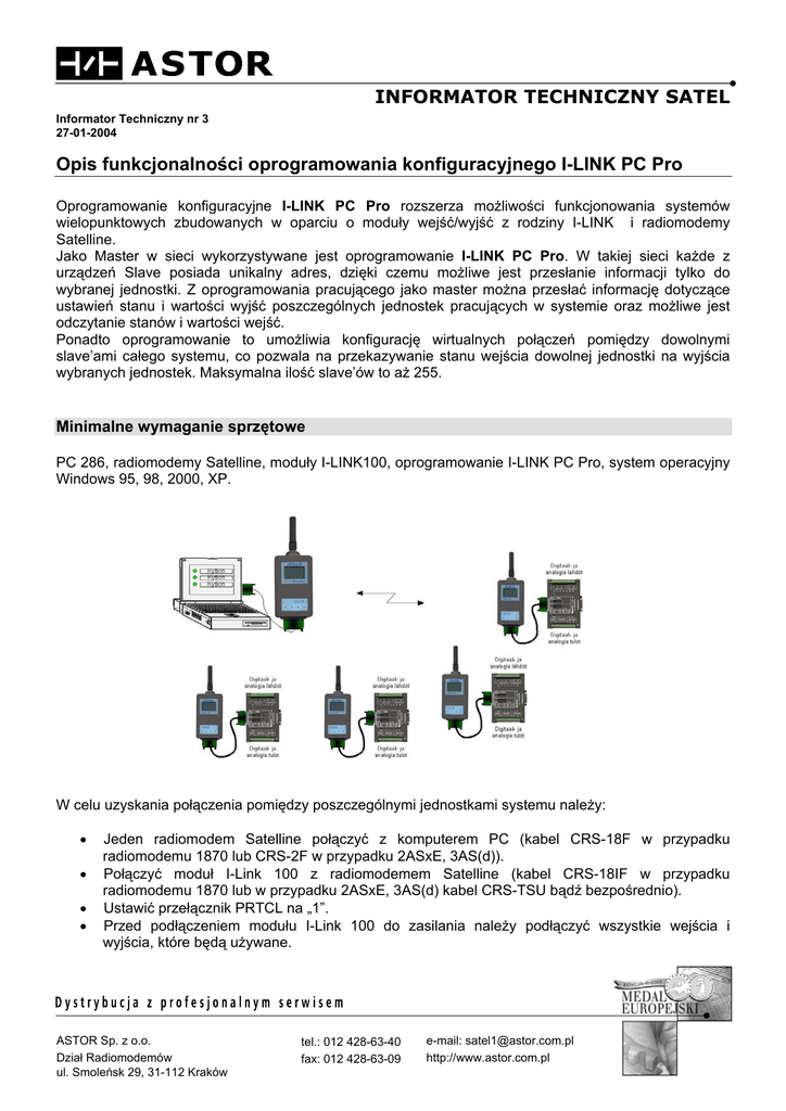 INFORMATOR TECHNICZNY SATEL Informator Techniczny nr 3 27-01-2004 Opis funkcjonalności oprogramowania konfiguracyjnego I-LINK PC Pro Oprogramowanie konfiguracyjne I-LINK PC Pro rozszerza możliwości funkcjonowania systemów wielopunktowych zbudowanych w oparciu o moduły wejść/wyjść z rodziny I-LINK i radiomodemy Satelline. Jako Master w sieci wykorzystywane jest oprogramowanie I-LINK PC Pro. W takiej sieci każde z urządzeń Slave posiada unikalny adres, dzięki czemu możliwe jest przesłanie informacji tylko do wybranej jednostki. Z oprogramowania pracującego jako master można przesłać informację dotyczące ustawień stanu i wartości wyjść poszczególnych jednostek pracujących w systemie oraz możliwe jest odczytanie stanów i wartości wejść. Ponadto oprogramowanie to umożliwia konfigurację wirtualnych połączeń pomiędzy dowolnymi slave’ami całego systemu, co pozwala na przekazywanie stanu wejścia dowolnej jednostki na wyjścia wybranych jednostek. Maksymalna ilość slave’ów to aż 255. Minimalne wymaganie sprzętowe PC 286, radiomodemy Satelline, moduły I-LINK100, oprogramowanie I-LINK PC Pro, system operacyjny Windows 95, 98, 2000, XP. W celu uzyskania połączenia pomiędzy poszczególnymi jednostkami systemu należy: • • • • Jeden radiomodem Satelline połączyć z komputerem PC (kabel CRS-18F w przypadku radiomodemu 1870 lub CRS-2F w przypadku 2ASxE, 3AS(d)). Połączyć moduł I-Link 100 z radiomodemem Satelline (kabel CRS-18IF w przypadku radiomodemu 1870 lub w przypadku 2ASxE, 3AS(d) kabel CRS-TSU bądź bezpośrednio). Ustawić przełącznik PRTCL na „1”. Przed podłączeniem modułu I-Link 100 do zasilania należy podłączyć wszystkie wejścia i wyjścia, które będą używane. ASTOR Sp. z o.o. Dział Radiomodemów ul. Smoleńsk 29, 31-112 Kraków tel.: 012 428-63-40 fax: 012 428-63-09 e-mail: [email protected] http://www.astor.com.pl • • • • Ustawić w module I-Link 100 prędkość transmisji np. na 9600 bit/s. Sprawdzić czy prędkość radiomodemu jest tak samo ustawiona oraz czy pozostałe parametry są „9600-N-8-1”. Ustawić indywidualne adresy wszystkich modułów pracujących jako Slave. Adresy te muszą być różne. Ustawić oprogramowanie I-LINK PC Pro. Dodać nowy Slave (File\New Slave). Klikając prawym klawiszem myszy w oknie dialogowym można zmienić ustawienia. o o o o o o o o o Set name – nadanie nazwy slave’a. Set slave adress – ustawienie adresu wybranego slave’a. Set update time – ustawienia czasu uaktualniania. Set update mode – wybór trybu wykonywania uaktualniania (Manual – ręcznie, Auto – automatycznie, Time – co zadany czas). Set layout style – ustawienie sposobu wyświetlania (Normal – standardowy, Input Only – tylko wejścia, Output only – tylko wyjścia). Set Unit Conversion – zmiana jednostek i przedziału zmiany wartości dla wejść/wyjść analogowych. Load Settings – wczytanie ustawień. Save Settings – zapisanie ustawień. Close – wyjście. 2 Otworzyć odpowiedni port Master’a (Master Config\Open Port) i ustawić właściwą prędkość. Poprzez okno dialogowe można ustawiać, klikając na wybranym wyjściu, stany wyjść binarnych i wartości wyjść analogowych oraz odczytywać stany wejść binarnych i wartości wejść analogowych wybranego Slave’a. 3 Otworzyć okno tworzenia połączeń (Master Config\Route List Editor). Przed otwarciem tego okna należy zdefiniować wszystkie slave’y wchodzące w skład systemu. Jeżeli w skład systemu wchodzą kasety rozszerzeń do modułu I-Link100, w celu ich aktywacji na ekranie, należy przycisnąć przycisk Manual Update. W oknie dialogowym można: • • • • • Utworzyć nowe połączenie (przycisk New), a następnie wybrać z rozwijanego menu wejście odpowiedniego modułu (Source Port) i wyjście wybranego modułu (Target Port). Po dodaniu nowego połączenia do listy na oknach dialogowych wybranych Slave’ów powinno pojawić się R (przy wybranym wejściu lub wyjściu). Edytować utworzone połączenie (przycisk Edit). Wykasować dane połączenie (przycisk Delete). Wwykasować wszystkie zdefiniowane połączenia (przycisk Clear All). Zapisać listę połączeń (przycisk Save as Text) w formie pliku tekstowego lub jako plik excel’a. Należy przechowywać listę połączeń w formie pliku jako back-up. UWAGA! W przypadku wyłączenia komputera lista połączeń znika i konieczne jest zdefiniowanie połączeń od nowa. • Zamknąć okno tworzenia połączeń (przycisk Close). Zdefiniowane połączenia pozostają aktywne dopóki komputer jest uruchomiony. 4