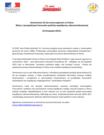 Seminarium 25 lat samorządności w Polsce Bilans i perspektywy francusko-polskiej współpracy zdecentralizowanej 18 listopada 2015r. W 2015 roku Polska obchodzi 25. rocznicę przyjęcia przez parlament ustawy o samorządzie gminnym (8 marca 1990). Przekazując samorządom gminnym odpowiednie kompetencje i gwarantując niezależność finansową, rozpoczęła ona proces decentralizacji w Polsce. Z tej okazji Ambasada Francji w Polsce oraz Związek Miast Polskich, mają zaszczyt zaprosić na seminarium, które - pod patronatem Kancelarii Prezydenta RP - odbędzie się 18 listopada 2015 roku w Warszawie. Tematami spotkania będą: rola Fundacji Francja - Polska we wspieraniu procesu decentralizacji w Polsce oraz modele współpracy terytorialnej. Seminarium ma na celu dokonanie bilansu i określenie perspektyw polskiej decentralizacji 25 lat po przyjęciu ustawy, a także przedstawienie możliwych kierunków rozwoju modelu finansowania i zarządzania w samorządach terytorialnych, na przykładzie francuskich doświadczeń we współpracy międzygminnej i "kontraktów miejskich". Seminarium może też sprzyjać zdynamizowaniu wymiany pomiędzy samorządami francuskimi i polskimi oraz promowaniu nowej współpracy między naszymi krajami w sferze polityki miejskiej. Współdziałanie w tym zakresie ma na celu ożywienie polsko-francuskiej współpracy zdecentralizowanej, definiując jej nowe, średnioterminowe kierunki (2015-20) i umożliwiając poszerzenie zdolności administracyjnych miast polskich w tym zakresie. Zgłoszenie uczestnictwa na seminarium prosimy kierować na adres: [email protected] SEMINAIRE « 25 ans de décentralisation en Pologne : Bilan et perspectives de la coopération décentralisée franco-polonaise » Le 18 novembre 2015 La Pologne célèbre en 2015 le 25e anniversaire de son processus de décentralisation, entamé officiellement en 1990 avec le vote de la loi sur l’autonomie territoriale des communes (8 mars 1990), attribuant à ces dernières des compétences propres et une autonomie financière. A cette occasion, l’Ambassade de France en Pologne et l’Association des villes de Pologne (ZMP), avec le soutien de la Présidence de la République de Pologne, organisent le 18 novembre 2015 un séminaire consacré au rôle de la fondation France-Pologne dans l’appui au processus de décentralisation en Pologne et aux modèles de coopération territoriale. Ce séminaire doit permettre de dresser le bilan et les perspectives de la décentralisation polonaise 25 ans après l’introduction de la loi, mais aussi d’aborder les possibles évolutions des modèles de financement et de gestion des communautés territoriales, notamment à l’appui du modèle français d’intercommunalité et de la présentation des « contrats de ville ». Enfin, le séminaire aura pour objectif de dynamiser les échanges entre collectivités françaises et polonaises et d’impulser une coopération nouvelle entre nos deux pays, autour de la question de la ville. Cette coopération vise également à relancer la coopération décentralisée franco-polonaise en définissant des nouveaux axes de travail à moyen terme (2015-2020) et en offrant une possibilité de renforcer la capacité administrative des villes polonaises dans ce domaine. Informations et inscription : [email protected]