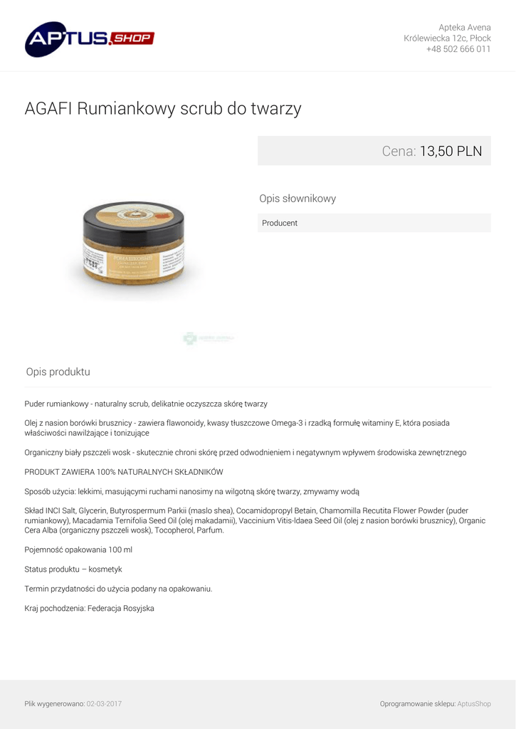 Apteka Avena Królewiecka 12c, Płock +48 502 666 011 AGAFI Rumiankowy scrub do twarzy Cena: 13,50 PLN Opis słownikowy Producent Opis produktu Puder rumiankowy - naturalny scrub, delikatnie oczyszcza skórę twarzy Olej z nasion borówki brusznicy - zawiera flawonoidy, kwasy tłuszczowe Omega-3 i rzadką formułę witaminy E, która posiada właściwości nawilżające i tonizujące Organiczny biały pszczeli wosk - skutecznie chroni skórę przed odwodnieniem i negatywnym wpływem środowiska zewnętrznego PRODUKT ZAWIERA 100% NATURALNYCH SKŁADNIKÓW Sposób użycia: lekkimi, masującymi ruchami nanosimy na wilgotną skórę twarzy, zmywamy wodą Skład INCI Salt, Glycerin, Butyrospermum Parkii (maslo shea), Cocamidopropyl Betain, Chamomilla Recutita Flower Powder (puder rumiankowy), Macadamia Ternifolia Seed Oil (olej makadamii), Vaccinium Vitis-ldaea Seed Oil (olej z nasion borówki brusznicy), Organic Cera Alba (organiczny pszczeli wosk), Tocopherol, Parfum. Pojemność opakowania 100 ml Status produktu – kosmetyk Termin przydatności do użycia podany na opakowaniu. Kraj pochodzenia: Federacja Rosyjska Plik wygenerowano: 02-03-2017 Powered by TCPDF (www.tcpdf.org) Oprogramowanie sklepu: AptusShop