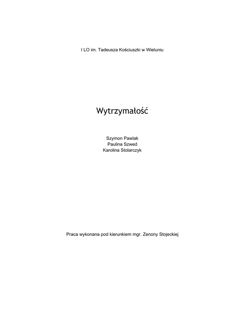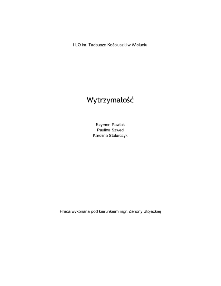 I LO im. Tadeusza Kościuszki w Wieluniu Wytrzymałość Szymon Pawlak Paulina Szwed Karolina Stolarczyk Praca wykonana pod kierunkiem mgr. Zenony Stojeckiej W poniższej pracy przedstawiamy kilka eksperymentów pokazujących wytrzymałe konstrukcje z materiałów mało wytrzymałych, takich jak papier czy makaron. Przeanalizujemy od czego zależy wytrzymałość materiałów, a także proces rozchodzenia się pęknięć. Prezentujemy linę z papieru toaletowego, makaronowe konstrukcje oparte na kratownicach, a także wykonany z makaronu “spaghettimost”. Dodatkowo zamieszczamy przykłady bardzo wytrzymałych materiałów. Lina z papieru Opis doświadczenia: Poprzez zawieszanie obciążników, ciężarków na linkach oraz całej linie skręconej z papieru toaletowego będziemy sprawdzać ich wytrzymałość. Cała lina składa się z czterech modułów, a każdy z modułów z szesnastu linek, natomiast każda linka skręcona została z dwóch pasm papieru o długości 4,5 metra każdy. Linka wytrzymuje obciążenie ok. 5 do 8 kg w zależności od siły skręcenia i jakości papieru. W pracy wykorzystany został papier, który nie jest podzielony na kostki. Linkę można bez dużych problemów zerwać w rękach, czując już przy tym opór stawiany przez papier. Cały modół (¼ liny) wytrzymałuje obciążenie 35kg. Cała lina utrzymała ciężar człowieka o masie ok. 70kg. Celem doświadczenia było pokazanie wytrzymałości pozornie nietrwałej rzeczy – papieru toaletowego i pokazanie jego nietypowego użycia. Wniosek: Zauważamy, że wytrzymałość na rozrywanie (siła potrzebna do naddarcia krawędzi papieru) i rozciąganie (długość, na jaką rozciągnie się papier przed ostatecznym zerwaniem) rosną wraz ze wzrostem ilości warstw, czyli ilości linek. Widzimy także, że im mocniej papier jest skręcony, tym mocniejsza jest lina. Duże znaczenie ma także to, że papier nie był dzielony na kostki. Papier składa się z włókien, które nakładają się na siebie i krzyżują w kierunku poprzecznym (kierunek poprzeczny wyznaczają włókna ułożone obok siebie). Tak duża wytrzymałość została uzyskana dzięki skręceniu włókien papieru prostopadle do kierunku podłużnego (włókna ułożone wzdłuż, jedne za drugimi) Gdybyśmy skręcili papier równolegle do położenia włókien, to łatwo byłoby go rozerwać, ponieważ w kierunku podłużnym papier jest słabszy, niż w poprzecznym. Kratownice Kratownica to układ złożony z prętów, których końce połączone są przegubowo, mający niezmienną postać geometryczną. Wykorzystywane są w wielu konstrukcjach ze względu na lekkość i prostotę wykonania. Prezentuje oparte na kratownicach konstrukcje, które ze względu na materiały, z których są wykonane pozornie są mało wytrzymałe, ale dzięki zastosowaniu kratownic wytrzymują duże obciążenia. Wieże z makaronu Opis doświadczenia: Z makaronu spaghetti przy pomocy kleju na gorąco budujemy wieże złożone z czterech ścianek będących kratownicami. Każda z wieżyczek ma masę około 120 g. Wieżyczki obciążamy, badając maksymalny ciężar, pod wpływem którego nie następuje pęknięcie. Dwie wieżyczki utrzymują obciążniki o masie 29 kg! 9 wieżyczek utrzymało dorosłego człowieka. Most z makaronu Opis doświadczenia: Przygotowujemy projekt mostu na podstawie obserwacji struktur często wykorzystywanych w architekturze. Następnie sklejamy most wykorzystując klej na gorąco. Most obciążamy badając ciężar, jaki może on utrzymać. Most o masie około 200 gram utrzymał obciążenie ponad 3,5 kg. Wniosek: Zastosowanie kratownic znacznie zwiększyło wytrzymałość makaronowych konstrukcji, dzięki rozkładowi sił na poszczególne pręty kratownicy. Scenariusz czasowy 1. 2. 3. 4. 5. Wprowadzenie teoretyczne do problemu wytrzymałości i peknięć. 4 min Zaprezentowanie papierowej liny 2 min Objaśnienie pojęcia kratownicy 1 min Obciążenie mostu z makaronu 1 min Obciążenie makaronowych wież 12 min Pokaz nie zawiera elementów niebezpiecznych (materiałów wybuchowych, substancji żrących, wysokich lub niskim temperatur itp).