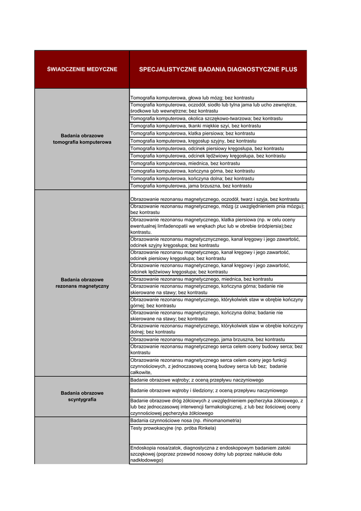 ŚWIADCZENIE MEDYCZNE SPECJALISTYCZNE BADANIA DIAGNOSTYCZNE PLUS Tomografia komputerowa, głowa lub mózg; bez kontrastu Tomografia komputerowa, oczodół, siodło lub tylna jama lub ucho zewnętrze, środkowe lub wewnętrzne; bez kontrastu Tomografia komputerowa, okolica szczękowo-twarzowa; bez kontrastu Tomografia komputerowa, tkanki miękkie szyi, bez kontrastu Badania obrazowe tomografia komputerowa Tomografia komputerowa, klatka piersiowa; bez kontrastu Tomografia komputerowa, kręgosłup szyjny, bez kontrastu Tomografia komputerowa, odcinek piersiowy kręgosłupa, bez kontrastu Tomografia komputerowa, odcinek lędźwiowy kręgosłupa, bez kontrastu Tomografia komputerowa, miednica, bez kontrastu Tomografia komputerowa, kończyna górna, bez kontrastu Tomografia komputerowa, kończyna dolna; bez kontrastu Tomografia komputerowa, jama brzuszna, bez kontrastu Obrazowanie rezonansu magnetycznego, oczodół, twarz i szyja, bez kontrastu Obrazowanie rezonansu magnetycznego, mózg (z uwzględnieniem pnia mózgu); bez kontrastu Obrazowanie rezonansu magnetycznego, klatka piersiowa (np. w celu oceny ewentualnej limfadenopatii we wnękach płuc lub w obrebie śródpiersia);bez kontrastu. Obrazowanie rezonansu magnetycznycznego, kanał kręgowy i jego zawartość, odcinek szyjny kręgosłupa; bez kontrastu Obrazowanie rezonansu magnetycznego, kanał kręgowy i jego zawartość, odcinek piersiowy kręgosłupa; bez kontrastu Obrazowanie rezonansu magnetycznego, kanał kręgowy i jego zawartość, odcinek lędźwiowy kręgosłupa; bez kontrastu Badania obrazowe rezonans magnetyczny Obrazowanie rezonansu magnetycznego, miednica, bez kontrastu Obrazowanie rezonansu magnetycznego, kończyna górna; badanie nie skierowane na stawy; bez kontrastu Obrazowanie rezonansu magnetycznego, którykolwiek staw w obrębie kończyny górnej; bez kontrastu Obrazowanie rezonansu magnetycznego, kończyna dolna; badanie nie skierowane na stawy; bez kontrastu Obrazowanie rezonansu magnetycznego, którykolwiek staw w obrębie kończyny dolnej; bez kontrastu Obrazowanie rezonansu magnetycznego, jama brzuszna, bez kontrastu Obrazowanie rezonansu magnetycznego serca celem oceny budowy serca; bez kontrastu Obrazowanie rezonansu magnetycznego serca celem oceny jego funkcji czynnościowych, z jednoczasową oceną budowy serca lub bez; badanie całkowite, Badanie obrazowe wątroby; z oceną przepływu naczyniowego Badania obrazowe scyntygrafia Badanie obrazowe wątroby i śledziony; z oceną przepływu naczyniowego Badanie obrazowe dróg żółciowych z uwzględnieniem pęcherzyka żółciowego, z lub bez jednoczasowej interwencji farmakologicznej, z lub bez ilościowej oceny czynnościowej pęcherzyka żółciowego Badania czynnościowe nosa (np. rhinomanometria) Testy prowokacyjne (np. próba Rinkela) Endoskopia nosa/zatok, diagnostyczna z endoskopowym badaniem zatoki szczękowej (poprzez przewód nosowy dolny lub poprzez nakłucie dołu nadkłodowego) Endoskopia nosa/zatok, diagnostyczna z endoskopowym badaniem zatoki klinowej (poprzez nakłucie powierzchni klinowej lub poprzez nakłucie ujścia) Znieczulenie do procedur endoskopowych w obrębie górnego odcinka przewodu pokarmowego, endoskop wprowadzony proksymalnie w stosunku do dwunastnicy Znieczulenie do procedur endoskopowych w obrębie dolnego odcinka przewodu pokarmowego, endoskop wprowadzony dystalnie w stosunku do dwunastnicy Laryngoskopia, bezpośrednia, z tracheoskopią lub bez; w celu aspiracji Laryngoskopia, fiberoskop giętki lub sztywny; ze stroboskopią Badanie endoskopowe przełyku, sztywnym lub giętkim endoskopem; diagnostyczne, z pobraniem próbek metodą szczoteczkową lub popłuczyn (oddzielna procedura) lub bez Badanie endoskopowe przełyku, sztywnym lub giętkim endoskopem; z biopsją, pojedynczą lub wielokrotną Badanie endoskopowe górnego odcinka przewodu pokarmowego, proste badanie pierwotne (np. za pomocą giętkiego endoskopu o małej średnicy) (oddzielna procedura) Inne badania diagnostyczne Badanie endoskopowe górnego odcinka przewodu pokarmowego obejmujące przełyk, żołądek, a także dwunastnicę i/lub jelito czcze w razie potrzeby; diagnostyczne, z pobraniem próbki (próbek) metodą szczoteczkową lub popłuczyn lub bez (oddzielna procedura) Badanie endoskopowe górnego odcinka przewodu pokarmowego obejmujące przełyk, żołądek, a także dwunastnicę i/lub jelito czcze w razie potrzeby; z biopsją, pojedynczą lub wielokrotną Proktosigmoidoskopia, sztywnym wziernikiem; diagnostyczna, z pobraniem materiału do badania metodą szczoteczkową lub popłuczyn (oddzielna procedura) lub bez Proktosigmoidoskopia, sztywnym wziernikiem; z biopsją, pojedynczą lub wielokrotną Sigmoidoskopia, giętkim endoskopem; diagnostyczna, z pobraniem materiału do badania metodą szczoteczkową lub popłuczyn (oddzielna procedura) lub bez Sigmoidoskopia, giętkim endoskopem; z biopsją, pojedynczą lub wielokrotną Kolonoskopia, giętki endoskop, proksymalnie od zagięcia śledzionowego okrężnicy; diagnostyczna, z pobraniem materiału do badania metodą szczoteczkową lub popłuczyn (oddzielna procedura) lub bez, z odbarczeniem jelita grubego (oddzielna procedura) lub bez Kolonoskopia, giętki endoskop, proksymalnie od zagięcia śledzionowego okrężnicy; z biopsją, pojedynczą lub wielokrotną Kolposkopia całej pochwy, oraz szyjki macicy, o ile jest obecna Kolposkopia całej pochwy, oraz szyjki macicy, o ile jest obecna z biopsją (biopsjami) Kolposkopia szyjki macicy obejmująca górną/przylegajacą część pochwy;