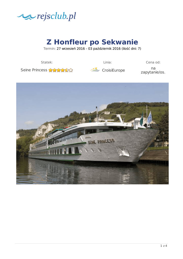 Z Honfleur po Sekwanie Termin: 27 wrzesień 2016 - 03 październik 2016 (ilość dni: 7) Statek: Seine Princess Linia: CroisiEurope Cena od: na zapytanie/os. 1 z4 TRASA REJSU dzień 1 Data Port wtorek 27.09.2016 Honfleur Francja Wpłynięcie Wypłynięcie Legenda --:-- --:-- Zaokrętowanie pomiędzy godziną 18 a 19. P rezentacja załogi i koktajl powitalny. P o kolacji wolny wieczór. dzień 2 środa 28.09.2016 Honfleur Francja --:-- --:-- P o śniadaniu możliwość skorzystania z wycieczki z przewodnikiem po Honfleur. To leżące u podnóża C ôte de Grace miasto oczaruje nas portem rybackim, malowniczymi uliczkami ze starymi domami oraz kościołem św. Katarzyny, który w całości zbudowany jest z drewna. P o południu możliwość skorzystania z wycieczki do C ote Fleurie”, Trouville i Deauville w trakcie której wizyta w destylarni, gdzie produkują słynnego C alvadosa. Ewentualnie: Możliwość skorzystania z całodniowej wycieczki z lunchem na plażę, gdzie odbyło się „Lądowanie w Normandii” (rezerwacja przed rejsem, minimum 30 uczestników). P rzejazd autokarem przez P ointe du Hoc, plażę Omaha i C oleville sur Mer. P o lunchu zatrzymamy się w Arromanches, gdzie obejrzymy film „C ena wolności”. dzień 3 czwartek 29.09.2016 Duclair Francja --:-- --:-- P o śniadaniu możliwość skorzystania z wycieczki fakultatywnej z przewodnikiem po okolicznych opactwach. Zobaczymy opactwo w Saint-Wandrille (z zewnątrz) oraz Jumièges, jedno z najpiękniejszych we Francji. Następnie popłyniemy w kierunku Rouen wzdłuż pięknej doliny, która była natchnieniem dla wielu poetów i malarzy impresjonizmu. P o przepłynięciu pod pięknym Mostem Normandzki dotrzemy na miejsce. dzień 4 piątek 30.09.2016 Rouen Francja --:-- --:-- Możliwość skorzystania z wycieczki z przewodnikiem po starym mieście – dawnej stolicy Normandii. Zwiedzimy historyczne dzielnice m.in. „P lace du Vieux Marche”, gdzie Joanna d'Arc spłonęła na stosie. Wypłynięcie w kierunku Vernon, gdzie zatrzymamy się na noc. Kolacja galowa. dzień 5 sobota 01.10.2016 Vernon Francja --:-- --:-- P o śniadaniu popłyniemy w kierunku Mantes-la-Jolie, opcjonalnie wycieczka do P ałacu Wersalskiego (wymagana rezerwacja przed rejsem). W poniedziałki P ałac jest zamkniety i wtedy można skorzystać z wycieczki do Zamku w Malmaison. P o południu przepłyniemy przez dystrykt La Defense i dotrzemy do P aryza. dzień 6 niedziela 02.10.2016 Paryż Francja --:-- --:-- P o śniadaniu możliwość skorzystania z wycieczki fakultatywnej po stolicy Francji w trakcie której odwiedzimy jej najsłynniejsze miejsca: Wieżę Eiffla, katedrę Notre Dame, Łuk Triumfalny oraz P ola Elizejskie. P o lunchu czas wolny na popołudniowy spacer po P aryżu. P o kolacji natomiast możliwość wybrania się do paryskiego kabaretu. dzień 7 poniedziałek 03.10.2016 Paryż Francja --:-- --:-- 2 z4 Wyokrętowanie 3 z4 CENNIK Cena katalogowa Kabina zewnętrzna z oknem od €1 176.00 3 osoba dorosła w kabinie zniżka 30% dziecko od 2 do 9 lat zniżka 20% Opłaty portowe Cena promocyjna w cenie Uwaga! Ceny za osobę w kabinie dwuosobowej. Cena zawiera: 7-dniowy (6 noclegów) rejs po Sekwanie; zakwaterowanie w kabinie dwuosobowej z klimatyzacją, prysznicem oraz WC; pełne wyżywienie od kolacji dnia pierwszego do śniadania dnia ostatniego; napoje w tym wodę, wino, piwo, soki owocowe i kawę serwowane podczas posiłków na pokładzie, napoje serwowane w barze (za wyjątkiem szampana oraz win z karty); opiekę hostessy na pokładzie; koktajl powitalny oraz uroczysty wieczór galowy; opłaty portowe. Cena nie zawiera: kosztów dojazdu do portu i transferów; ubezpieczenia KL, NNW i bagaż; wycieczek fakultatywnych; win z karty, szampana oraz napojów podczas wycieczek fakultatywnych; wydatków osobistych. 4 z4