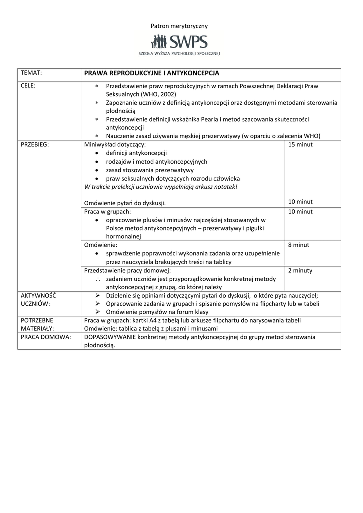 Patron merytoryczny TEMAT: CELE: PRZEBIEG: AKTYWNOŚĆ UCZNIÓW: POTRZEBNE MATERIAŁY: PRACA DOMOWA: PRAWA REPRODUKCYJNE I ANTYKONCEPCJA Przedstawienie praw reprodukcyjnych w ramach Powszechnej Deklaracji Praw Seksualnych (WHO, 2002) Zapoznanie uczniów z definicją antykoncepcji oraz dostępnymi metodami sterowania płodnością Przedstawienie definicji wskaźnika Pearla i metod szacowania skuteczności antykoncepcji Nauczenie zasad używania męskiej prezerwatywy (w oparciu o zalecenia WHO) Miniwykład dotyczący: 15 minut definicji antykoncepcji rodzajów i metod antykoncepcyjnych zasad stosowania prezerwatywy praw seksualnych dotyczących rozrodu człowieka W trakcie prelekcji uczniowie wypełniają arkusz notatek! 10 minut Omówienie pytań do dyskusji. Praca w grupach: 10 minut opracowanie plusów i minusów najczęściej stosowanych w Polsce metod antykoncepcyjnych – prezerwatywy i pigułki hormonalnej Omówienie: 8 minut sprawdzenie poprawności wykonania zadania oraz uzupełnienie przez nauczyciela brakujących treści na tablicy Przedstawienie pracy domowej: 2 minuty zadaniem uczniów jest przyporządkowanie konkretnej metody antykoncepcyjnej z grupą, do której należy Dzielenie się opiniami dotyczącymi pytań do dyskusji, o które pyta nauczyciel; Opracowanie zadania w grupach i spisanie pomysłów na flipcharty lub w tabeli Omówienie pomysłów na forum klasy Praca w grupach: kartki A4 z tabelą lub arkusze flipchartu do narysowania tabeli Omówienie: tablica z tabelą z plusami i minusami DOPASOWYWANIE konkretnej metody antykoncepcyjnej do grupy metod sterowania płodnością. Patron merytoryczny M I N I W Y K Ł A D I. PRAWO DO PODEJMOWANIA ODPOWIEDZIALNYCH DECYZJI DOT. POSIADANIA POTOMSTWA Prawa seksualne (opracowane przez Światową Organizację Zdrowia w 2002 roku) stanowią fundamentalne i uniwersalne prawa człowieka i muszą być uznane, akceptowane i szanowane we wszystkich społeczeństwach. Wśród tych praw znajdują się miedzy innymi: A. Prawo do podejmowania wolnych i odpowiedzialnych decyzji dot. posiadania potomstwa- obejmuje możliwość podejmowania decyzji o posiadaniu lub nieposiadaniu potomstwa, jego liczbie, różnicy wieku między potomstwem oraz prawo do pełnego dostępu do środków regulacji płodności. B. Prawo do seksualnej opieki zdrowotnej. Uczniowie uzupełniają kartę notatek wpisując prawa reprodukcyjne – tak, jak je rozumieją. II. ANTYKONCEPCJA łac. anty= przeciw, conceptio= poczęcie; polega na świadomym przeciwdziałaniu niepożądanej ciąży. Nowoczesne metody planowania rodziny służą planowaniu liczby dzieci i momentu ich urodzenia bez konieczności rezygnacji z intymnej, seksualnej bliskości. Głównym celem antykoncepcji jest wytworzenie świadomej chęci posiadania potomka oraz zapobieganie sztucznym poronieniom (aborcji), jak również przychodzeniu na świat dzieciom niechcianym. Wybór odpowiedniej metody antykoncepcyjnej zależy od wielu czynników: wieku, stanu zdrowia, wykształcenia kobiety, religijności, liczby przebytych ciąż i porodów. Najważniejsze, żeby metoda, na którą zdecyduje się dana osoba była skuteczna i bezpieczna dla zdrowia. Zgodnie z wytycznymi WHO idealna metoda to metoda: 1. maksymalnie skuteczna, 2. w 100% bezpieczna tzn. nie powoduje skutków ubocznych, 3. łatwa w stosowaniu, 4. w 100% odwracalna – po zaprzestaniu jej stosowania kobieta może zajść w ciążę. Czynniki, które wpływają na niepowodzenia w stosowaniu antykoncepcji to między innymi: nieumiejętność stosowania, niewłaściwy dobór metody, zły stan zdrowia. Niezależnie od wyboru metody antykoncepcyjnej zawsze należy skonsultować swoją decyzję z lekarzem. III. WSPÓŁCZYNNIK PEARLA Aby móc oceniać i porównywać różne metody antykoncepcyjne, lekarze opracowali tzw. wskaźnik Pearla – za pomocą tego współczynnika wyrażana jest skuteczność danej metody. Określa on liczbę ciąż wśród setki kobiet stosujących daną metodę antykoncepcyjną w ciągu roku. Im niższa wartość wskaźnika Pearla, tym pewniejsza metoda antykoncepcji. Patron merytoryczny IV. METODY OKRESOWEJ ABSTYNENCJI TZW. NATURALNE METODY PLANOWANIA RODZINY Tzw. naturalne metody służą sterowaniu płodnością i nie zaliczają się do metod antykoncepcyjnych. Polegają na powstrzymywaniu się od współżycia (czasowej wstrzemięźliwości) podczas dni płodnych. Do naturalnych metod antykoncepcyjnych zalicza się: metodę kalendarzową, termiczną, owulacji Billingsów, mieszaną (objawowo-termiczna). Aby prawidłowo stosować naturalne metody planowania rodziny, należy umieć wyznaczać dni płodne, co u wielu nastolatek jest trudne. V. METODY ANTYKONCEPCYJNE Nauczyciel powinien omówić różne metody antykoncepcyjne, podając ich przykłady i ew. pokazać stosowane środki. Zalety i wady każdej z grup metod omawiane są po zakończeniu pracy w grupach. Patron merytoryczny RODZAJ METODY MECHANICZNA OPIS Mechaniczna bariera dla plemników, aby nie wniknęły do pochwy lub macicy kobiety RODZAJE prezerwatywa prezerwatywa damska kapturki, krążki dopochwowe + Bezpieczeństwo Brak działań ubocznych Zapobieganie chorobom przenoszonym drogą płciową Powszechna dostępność i przystępna cena Ograniczona skuteczność (np. pęknięcia) Obniżona intensywność doznań seksualnych Mała elastyczność Łatwość stosowania CHEMICZNA Substancje bezpośrednio uszkadzające plemniki i ich zdolność do zapłodnienia; stanowią barierę nie dopuszczając do przeniknięcia plemników w głąb ciała kobiety Hormonalne blokowanie owulacji, które uniemożliwia zapłodnienie HORMONALNA o o o środki plemnikobójcze: żele globulki pianki tabletki plastry zastrzyki pierścienie dopochwowe wkładka hormonalna Zwiększa zwilżenie pochwy Niska skuteczność Są obojętne hormonalnie Mogą powodować pieczenie, świąd, dyskomfort Zmniejszone ryzyko zakażenia bakteryjnego i wirusowego Może wystąpić uczulenie na składniki p