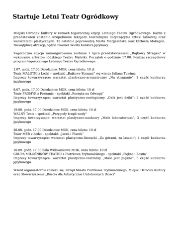 Startuje Letni Teatr Ogródkowy Miejski Ośrodek Kultury w ramach tegorocznej edycji Letniego Teatru Ogródkowego. Każde z przedstawień zostanie uzupełnione lekcjami teatralnymi dotyczącymi sztuki lalkowej oraz warsztatami plastycznymi. Te ostatnie poprowadzą Marta Margasińska oraz Elżbieta Makagon. Niewątpliwą atrakcją będzie również Wielki Konkurs Językowy. Tegoroczna edycja zainaugurowana zostanie 1 lipca przedstawieniem „Bajkowy Stragan” w wykonaniu artystów łódzkiego Teatru Malutki. Początek o godzinie 17.00. Poniżej szczegółowy program tegorocznego Letniego Teatru Ogródkowego: 1.07. godz. 17.00 Dziedziniec MOK, cena biletu: 10 zł Teatr MALUTKI z Łodzi – spektakl „Bajkowy Stragan” wg wierzy Juliana Tuwima Imprezy towarzyszące: warsztat plastyczno-aromatyczny „Na straganie”; 1 część konkursu językowego 8.07. godz. 17.00 Dziedziniec MOK, cena biletu: 10 zł Teatr PROMYK z Poznania – spektakl „Recepta na Odwagę” Imprezy towarzyszące: warsztat plastyczno-zoologiczny „Dzik jest dziki”; 2 część konkursu językowego 19.08. godz. 17.00 Dziedziniec MOK, cena biletu: 10 zł WALNY Teatr – spektakl „Przygody kropli wody” Imprezy towarzyszące: warsztat plastyczno-naukowy „Małe laboratorium”; 3 część konkursu językowego 26.08. godz. 17.00 Dziedziniec MOK, cena biletu: 10 zł Teatr MER z Łodzi – spektakl: „Jacek i Placek” Imprezy towarzyszące: warsztat plastyczno-literacki „Za górami, za lasami”; 4 część konkursu językowego 16.09. godz. 17.00 Sala Widowiskowa MOK, cena biletu: 10 zł GRUPA MIŁOŚNIKÓW TEATRU z Piotrkowa Trybunalskiego – spektakl „Piękna i Bestia” Imprezy towarzyszące: warsztat plastyczno-teatralny „Małe jest piękne”, 5 część konkursu językowego. Wśród organizatorów znaleźli się: Urząd Miasta Piotrkowa Trybunalskiego, Miejski Ośrodek Kultury oraz Stowarzyszenie „Busola dla Artystycznie Uzdolnionych Dzieci”.