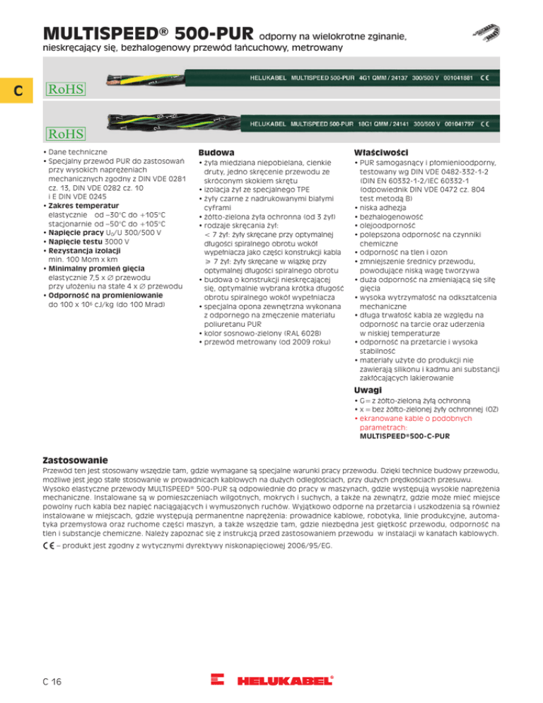MULTISPEED® 500-PUR odporny na wielokrotne zginanie, nieskręcający się, bezhalogenowy przewód łańcuchowy, metrowany C •Dane techniczne •Specjalny przewód PUR do zastosowań przy wysokich naprężeniach mechanicznych zgodny z DIN VDE 0281 cz. 13, DIN VDE 0282 cz. 10 i E DIN VDE 0245 •Zakres temperatur elastycznie od –30°C do +105°C stacjonarnieod –50°C do +105°C •Napięcie pracy U0/U 300/500 V •Napięcie testu 3000 V •Rezystancja izolacji min. 100 Mom x km •Minimalny promień gięcia elastycznie 7,5 x ∅ przewodu przy ułożeniu na stałe 4 x ∅ przewodu •Odporność na promieniowanie do 100 x 106 cJ/kg (do 100 Mrad) Budowa Właściwości •żyła miedziana niepobielana, cienkie druty, jedno skręcenie przewodu ze skróconym skokiem skrętu •izolacja żył ze specjalnego TPE •żyły czarne z nadrukowanymi białymi cyframi •żółto-zielona żyła ochronna (od 3 żył) •rodzaje skręcania żył: < 7 żył: żyły skręcane przy optymalnej długości spiralnego obrotu wokół wypełniacza jako części konstrukcji kabla ≥ 7 żył: żyły skręcane w wiązkę przy optymalnej długości spiralnego obrotu •budowa o konstrukcji nieskręcającej się, optymalnie wybrana krótka długość obrotu spiralnego wokół wypełniacza •specjalna opona zewnętrzna wykonana z odpornego na zmęczenie materiału poliuretanu PUR •kolor sosnowo-zielony (RAL 6028) •przewód metrowany (od 2009 roku) •PUR samogasnący i płomienioodporny, testowany wg DIN VDE 0482-332-1-2 (DIN EN 60332-1-2/IEC 60332-1 (odpowiednik DIN VDE 0472 cz. 804 test metodą B) •niska adhezja •bezhalogenowość •olejoodporność •polepszona odporność na czynniki chemiczne •odporność na tlen i ozon •zmniejszenie średnicy przewodu, powodujące niską wagę tworzywa •duża odporność na zmieniającą się siłę gięcia •wysoka wytrzymałość na odkształcenia mechaniczne •długa trwałość kabla ze względu na odporność na tarcie oraz uderzenia w niskiej temperaturze •odporność na przetarcie i wysoka stabilność •materiały użyte do produkcji nie zawierają silikonu i kadmu ani substancji zakłócających lakierowanie Uwagi •G=z żółto-zieloną żyłą ochronną •x=bez żółto-zielonej żyły ochronnej (OZ) •ekranowane kable o podobnych parametrach: MULTISPEED®500-C-PUR Zastosowanie Przewód ten jest stosowany wszędzie tam, gdzie wymagane są specjalne warunki pracy przewodu. Dzięki technice budowy przewodu, możliwe jest jego stałe stosowanie w prowadnicach kablowych na dużych odległościach, przy dużych prędkościach przesuwu. Wysoko elastyczne przewody MULTISPEED® 500-PUR są odpowiednie do pracy w maszynach, gdzie występują wysokie naprężenia mechaniczne. Instalowane są w pomieszczeniach wilgotnych, mokrych i suchych, a także na zewnątrz, gdzie może mieć miejsce powolny ruch kabla bez napięć naciągających i wymuszonych ruchów. Wyjątkowo odporne na przetarcia i uszkodzenia są również instalowane w miejscach, gdzie występują permanentne naprężenia: prowadnice kablowe, robotyka, linie produkcyjne, automatyka przemysłowa oraz ruchome części maszyn, a także wszędzie tam, gdzie niezbędna jest giętkość przewodu, odporność na tlen i substancje chemiczne. Należy zapoznać się z instrukcją przed zastosowaniem przewodu w instalacji w kanałach kablowych. C – produkt jest zgodny z wytycznymi dyrektywy niskonapięciowej 2006/95/EG. C 16 Nr kat. 24119 24120 24121 24122 24123 24124 24125 24126 24127 24128 24129 24130 24131 24132 24133 24134 24135 24136 24137 24138 Liczba żył x przekrój [mm²] Śred. zew. w mm 2 x 0,5 3 G 0,5 4 G 0,5 5 G 0,5 7 G 0,5 12 G 0,5 18 G 0,5 25 G 0,5 3 G 0,75 4 G 0,75 5 G 0,75 7 G 0,75 12 G 0,75 18 G 0,75 25 G 0,75 36 G 0,75 42 G 0,75 3G1 4G1 5G1 4,3 4,6 5,0 5,4 8,9 9,7 11,8 13,9 5,2 5,6 6,3 10,3 11,0 13,9 15,9 19,6 21,5 5,4 5,9 6,7 Waga Cu Waga ok. kg/km kg/km 9,6 14,4 19,0 24,0 33,6 58,0 86,0 120,0 21,6 29,0 36,0 50,0 86,0 130,0 180,0 260,0 302,0 29,0 38,0 48,0 41,0 48,0 62,0 70,0 88,0 131,0 204,0 266,0 51,0 68,0 73,0 92,0 170,0 257,0 280,0 411,0 608,0 59,0 71,0 84,0 Nr AWG 20 20 20 20 20 20 20 20 18 18 18 18 18 18 18 18 18 17 17 17 Nr kat. 24139 24140 24141 24142 24143 24144 24145 24146 24147 24148 24149 24150 24151 24152 24153 24154 24155 Liczba żył x przekrój [mm²] Śred. zew. w mm 7G1 12 G 1 18 G 1 25 G 1 3 G 1,5 4 G 1,5 5 G 1,5 7 G 1,5 12 G 1,5 18 G 1,5 25 G 1,5 4 G 2,5 5 G 2,5 7 G 2,5 12 G 2,5 18 G 2,5 25 G 2,5 11,1 12,0 14,8 17,2 6,4 7,0 7,8 13,0 14,2 17,5 20,1 8,8 9,8 16,1 17,8 21,8 24,4 Waga Cu Waga ok. kg/km kg/km 67,0 115,0 173,0 240,0 43,0 58,0 72,0 101,0 173,0 259,0 360,0 86,0 120,0 168,0 288,0 432,0 600,0 111,0 200,0 286,0 370,0 81,0 102,0 121,0 164,0 293,0 450,0 631,0 173,0 220,0 290,0 504,0 719,0 940,0 Nr AWG 17 17 17 17 16 16 16 16 16 16 16 14 14 14 14 14 14 Wymiary oraz dane techniczne mogą ulec zmianie bez uprzedzenia. C 17 C