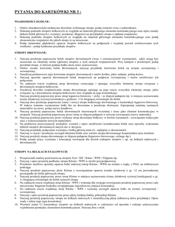 PYTANIA DO KARTKÓWKI NR 3 : WIADOMOŚCI OGÓLNE: 1. 2. 3. 4. Omów charakterystyki techniczne dowolnie wybranego stropu, podaj wartości wraz z jednostkami.. Dokonaj podziału stropów belkowych ze względu na materiał głównego elementu konstrukcyjnego oraz opisz zasady doboru belek głównych ( wymiary, przekroje, długości) na przykładzie stropu o Ŝądanej rozpiętości. Dokonaj podziału stropów belkowych ze względu na materiał głównego elementu konstrukcyjnego oraz podaj ekonomiczne rozpiętości do jakich stropy te są stosowane. Podaj minimalne głębokości oparcia stropów belkowych na podporach i wyjaśnij powód zróŜnicowania tych wielkości - podaj konkretne przykłady stropów. STROPY DREWNIANE: 1. 2. 3. 4. 5. 6. 7. 8. 9. 10. 11. 12. 13. 14. 15. Narysuj przekroje poprzeczne belek stropów drewnianych (wraz z orientacyjnymi wymiarami), jakie mogą być stosowane na elementy nośne (główne) stropów o tych samych rozpiętościach. Przy kaŜdym z przekrojów podaj przykład stropu, w którym podana belka moŜe mieć zastosowanie. Omów zasady kotwienia belek drewnianych, narysuj przykłady kotwienia belek na ścianie zewnętrznej i wewnętrznej. Naszkicuj podstawowe typy kotwienia stropów drewnianych i omów krótko, jakie zadania pełnią kotwy. Narysuj sposoby oparcia drewnianych belek stropowych na podporze wewnętrznej i omów moŜliwości ich połączenia. Na zadanym rzucie rozplanuj strop drewniany oznaczając i opisując wszystkie elementy stropu związane z drewnianym stropem belkowym. Naszkicuj dowolne rozplanowanie stropu drewnianego opisując na jego rzucie wszystkie elementy stropu, jakie związane są z drewnianym stropem belkowym ( bez względu na jego konstrukcję). Narysuj przekrój poprzeczny przez strop legarowo-listwowy / cichy / ze ślepym pułapem itp. w miejscu usytuowania ściany działowej wyŜszej konstrukcji o grubości 1/2c biegnącej równolegle do belek. Narysuj dwa przekroje poprzeczne (stary i nowy) stropu belkowego drewnianego o konstrukcji legarowo-listwowej. W trakcie remontu wymieniono belki lite na drewniane o przekroju złoŜonym. Zaproponuj zamianę zastanych materiałów na nowe, podaj nazwy handlowe. Narysuj przekrój poprzeczny belek drewnianych stosowanych wcześniej i teraz jako element konstrukcyjny w stropach. Narysuj przekrój poprzeczny przez strop ze ślepym pułapem w nowym rozwiązaniu (nowe materiały). Narysuj przekrój poprzeczny przez wybrany strop drewniany belkowy w dwóch wariantach - rozwiązanie tradycyjne oraz z wykorzystaniem nowych materiałów. Na podstawie przeczytanych artykułów wymień i opisz moŜliwości kształtowania belek oraz sposoby wykonania lekkich stropów drewnianych innych niŜ w skrypcie. Narysuj przykłady połączenia wymianu z belką główną (min.2) - najlepiej w aksonometrii. Narysuj w rzucie i przekroju szczegół ułoŜenia belek oraz warstw stropu drewnianego bezpośrednio przy kominie. Narysuj przekrój stropu drewnianego ze ślepym pułapem (legarowo-listwowego, cichego itp.). Podaj zasady pracy wymianu i koncepcję rozwiązań dla dwóch rodzajów stropów ( np. na belkach stalowych i drewnianych). STROPY NA BELKACH STALOWYCH: 1. 2. 3. Przeprowadź analizę porównawczą stropów Fert / DZ / Klein / WPS / Filigram itp. Narysuj i opisz przekrój podłuŜny stropu Kleina / WPS w strefie przypodporowej. Przedstaw moŜliwe sposoby oparcia belki stalowej (strop Kleina / WPS) na ścianie z cegły, z PGS, na Ŝelbetowym podciągu. 4. Narysuj przekrój poprzeczny płyty Kleina z rozwiązaniem oparcia ścianki działowej o gr. 12 cm prowadzonej prostopadle do belek głównych stropu. 5. Narysuj przekrój poprzeczny przez strop Kleina w miejscu usytuowania ściany działowej wyŜszej kondygnacji o gr. 1c biegnącej równolegle do belek nośnych stropu. 6. Na zadanym rzucie rozplanuj strop Kleina / WPS i wykonaj dla swojego rozwiązania przekrój poprzeczny przez cały narysowany fragment budynku uwzględniając najciekawsze miejsca konstrukcji. 7. Na zadanym rzucie rozplanuj strop Kleina / WPS i wykonaj szczegół oparcia belki na ścianie zewnętrznej / wewnętrznej. 8. Narysuj i opisz przekrój poprzeczny przez płytę średnią (lekką, półcięŜką) Kleina. 9. Narysuj przekrój poprzeczny stropu na belkach stalowych z monolityczną płytą Ŝelbetową (dwa przykłady). Opisz wady i zalety tego typu konstrukcji. 10. Wymień znane Ci konstrukcje stropów na belkach stalowych w zaleŜności od sposobu i rodzaju umieszczenia wypełnienia pomiędzy elementem konstrukcyjnym. Narysuj dwa z nich. STROPY GĘSTOśEBROWE: 1. 2. 3. 4. 5. 6. 7. 8. 9. 10. 11. 12. 13. 14. 15. 16. 17. 18. 19. 20. Dokonaj podziału stropów gęstoŜebrowych w zaleŜności od materiałów z jakich wykonane są elementy stropu (belki, pustaki), podaj konkretne przykłady stropów. Na podstawie artykułów omów moŜliwe rozwiązania wypełnień (pustaków) stropów gęstoŜebrowych. Podaj konkretne przykłady przy poszczególnych typach. Na podstawie przeczytanych artykułów omów (naszkicuj i opisz) konstrukcje stropów gęstoŜebrowych wykonanych z prefabrykatów betonowych. Wymień stropy przedstawione w artykułach (inne niŜ w skrypcie) oraz omów konstrukcję i technologię dwóch z nich. Na podstawie przeczytanych artykułów omów (naszkicuj i opisz) konstrukcje gęstoŜebrowych stropów ceramicznoŜelbetowych. Na podstawie przeczytanych artykułów naszkicuj i opisz nowe rozwiązania stropów obecnie stosowanych w domach jednorodzinnych. Dokonaj podziału stropów gęstoŜebrowych na trzy grupy w zaleŜności od technologii montaŜu stropu (jego zmonolityzowania), do kaŜdej grupy podaj konkretne przykłady stropów. Na zadanym rzucie rozplanuj strop DZ / Fert / Akerman / Teriva i wykonaj dla swojego rozwiązania przekrój poprzeczny przez cały narysowany fragment budynku uwzględniając najciekawsze miejsca w konstrukcji. Na podstawie stropu Fert / Teriva omów (naszkicuj) róŜne sposoby rozwiąza