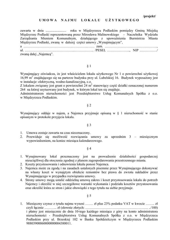 /projekt/ UMOWA NAJMU LOKALU UŻYTKOWEGO zawarta w dniu ........................ roku w Międzyrzecu Podlaskim pomiędzy Gminą Miejską Międzyrzec Podlaski reprezentowaną przez Mirosława Malinowskiego - Naczelnika Wydziału Zarządzania Mieniem Komunalnym, działającego z upoważnienia Burmistrza Miasta Międzyrzec Podlaski, zwaną w dalszej części umowy „Wynajmującym”, a …………………………………….…………..…… zam. ………………………………………., ul. ……………………………………..…………….. /PESEL ……………….., NIP ……………/ zwaną dalej „Najemcą”. §1 Wynajmujący oświadcza, że jest właścicielem lokalu użytkowego Nr 1 o powierzchni użytkowej 16,99 m2 znajdującego się na parterze budynku przy ul. Lubelskiej 16. Budynek wyposażony jest w instalacje: elektryczną, wodno-kanalizacyjną, c.o. Z lokalem związany jest grunt o powierzchni 24 m2 stanowiący część działki oznaczonej numerem 264 na której usytuowany jest budynek, w którym lokal ten się znajduje. Administratorem nieruchomości jest Przedsiębiorstwo Usług Komunalnych Spółka z o.o. w Międzyrzecu Podlaskim. §2 Wynajmujący oddaje w najem, a Najemca przyjmuje opisaną w § 1 nieruchomość w stanie opisanym w protokole przyjęcia lokalu. §3 1. 2. Umowa zostaje zawarta na czas nieoznaczony. Przewiduje się możliwość rozwiązania umowy za wypowiedzeniem, na koniec miesiąca kalendarzowego. uprzednim 3 – miesięcznym §4 1. Wynajmowany lokal przeznaczony jest na prowadzenie działalności gospodarczej nieuciążliwej dla otoczenia zgodnej z planem zagospodarowania przestrzennego miasta. 2. Koszty przystosowania i odnowienia lokalu ponosi Najemca. 3. Najemca może za zgodą i na zasadach ustalonych pisemnie przez Wynajmującego dokonywać na własny koszt w wynajętym obiekcie remontów bez prawa do zwrotu nakładów przez Wynajmującego w przypadku rozwiązania umowy. 4. Strony umowy mogą ustalić oddzielną umową zakres i koszt przystosowania lokalu do potrzeb Najemcy i określić w niej szczegółowe warunki wykonania i podziału kosztów przystosowania oraz określić która ze stron i jakie obowiązki z tego tytułu na siebie przyjmuje. §5 1. Miesięczny czynsz z tytułu najmu wynosi ……. zł plus 23% podatku VAT w kwocie …….. zł czyli łącznie ……….. zł (słownie złotych: ………………………………………………. ../100) i płatny jest miesięcznie do dnia 10-tego każdego miesiąca z góry na konto administratora nieruchomości - Przedsiębiorstwa Usług Komunalnych Spółka z o.o. w Międzyrzecu Podlaskim przy ul. Brzeskiej 102 w Banku Spółdzielczym w Międzyrzecu Podlaskim 98803900060000000004380011. 2. 3. 4. 5. 6. 7. Po zaliczeniu wpłaconego przez Najemcę wadium do przetargu w kwocie 400,00 zł Najemca zobowiązany jest dopłacić kwotę …………. zł brutto tytułem czynszu za najem za okres …………………………… r. w terminie do dnia 10-tego ……………………….. roku. Od niezapłaconych w terminie należności naliczane będą odsetki za zwłokę w wysokości ustawowej. Wysokość czynszu będzie waloryzowana corocznie po zakończeniu każdego roku kalendarzowego na rok następny, w/g średniorocznego wskaźnika cen towarów i usług konsumpcyjnych po opublikowaniu tego wskaźnika przez Prezesa GUS z mocą od 1 stycznia danego roku. Zmiana wysokości czynszu nie powoduje konieczności zmiany umowy w formie aneksu. Najemca ponosił będzie wszelkie opłaty eksploatacyjne związane z najmem lokalu. W terminach płatności czynszu wnoszone będą opłaty według otrzymanych faktur: za wodę i ścieki naliczane ryczałtem w zależności od ilości zatrudnianych osób w/g norm zużycia wody lub zgodnie z faktycznym zużyciem w/g wskazań wodomierza; za centralne ogrzewanie wnoszone będą comiesięczne zaliczki naliczane proporcjonalnie do powierzchni użytkowej lokalu, a ostateczne coroczne rozliczenie kosztów nastąpi zgodnie z odczytami podzielników ciepła centralnego ogrzewania. Koszty energii elektrycznej ponoszone będą na podstawie umowy zawartej z zakładem energetycznym lub w/g wskazań licznika na podstawie otrzymanych faktur. Najemca ponosił będzie podatki i opłaty lokalne związane z najmowanym lokalem w wysokości i w terminach wynikających z powszechnie obowiązujących przepisów. Jakakolwiek zmiana stawki VAT (zwiększenie lub zmniejszenie) wynikająca z przepisów powszechnie obowiązujących nie wymaga zmiany treści umowy. Należność brutto zostanie każdorazowo ustalona w oparciu o stawki VAT obowiązujące w dniu powstania obowiązku podatkowego. §6 1. Jeżeli najemca dopuszcza się zwłoki z zapłatą czynszu i dodatkowych świadczeń Wynajmujący ma prawo wypowiedzieć umowę najmu bez zachowania terminu wypowiedzenia, uprzedzając Najemcę na piśmie, udzielając mu jednocześnie dodatkowego terminu miesięcznego do zapłaty zaległego czynszu wraz z ustawowymi odsetkami za zwłokę. 2. W przypadku rozwiązania umowy przez Wynajmującego zgodnie z ust. 1, Najemca zobowiązany jest do zwolnienia lokalu w terminie 1 miesiąca na koszt własny. §7 1. Najemca zobowiązany jest do korzystania z przedmiotu umowy zgodnie z zasadami prawidłowej gospodarki, utrzymywać lokal we właściwym stanie technicznym i sanitarnym, aby po zakończeniu trwania umowy zwrócić nieruchomość w stanie nie pogorszonym, utrzymania porządku i czystości w wynajętym lokalu oraz w tych częściach wspólnych budynku, które służą do użytku wspólnego oraz ubezpieczenia mienia wniesionego do wynajmowanego lokalu we własnym zakresie. 2. Najemca ponosił będzie pełną odpowiedzialność cywilną wobec Wynajmującego i osób trzecich za ewentualne szkody i wszelkie zdarzenia powstałe w wyniku zarówno zawinionego działania i zaniechania własnego, jak i osób trzecich w szczególności w przypadku niedopełnienia obowiązków określo