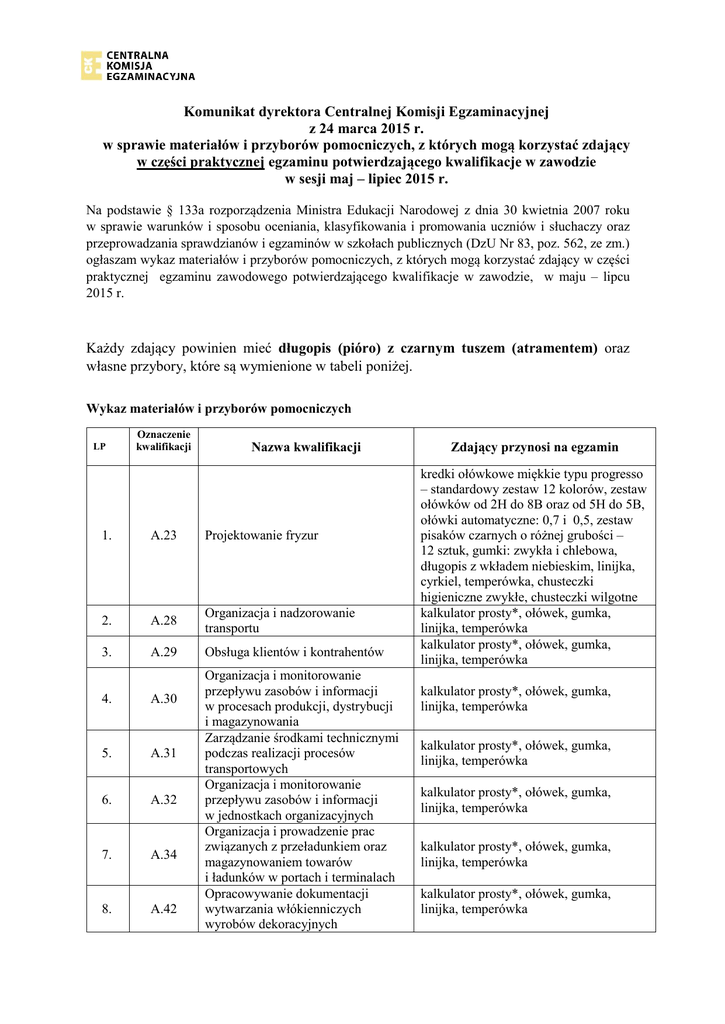Komunikat dyrektora Centralnej Komisji Egzaminacyjnej z 24 marca 2015 r. w sprawie materiałów i przyborów pomocniczych, z których mogą korzystać zdający w części praktycznej egzaminu potwierdzającego kwalifikacje w zawodzie w sesji maj – lipiec 2015 r. Na podstawie § 133a rozporządzenia Ministra Edukacji Narodowej z dnia 30 kwietnia 2007 roku w sprawie warunków i sposobu oceniania, klasyfikowania i promowania uczniów i słuchaczy oraz przeprowadzania sprawdzianów i egzaminów w szkołach publicznych (DzU Nr 83, poz. 562, ze zm.) ogłaszam wykaz materiałów i przyborów pomocniczych, z których mogą korzystać zdający w części praktycznej egzaminu zawodowego potwierdzającego kwalifikacje w zawodzie, w maju – lipcu 2015 r. Każdy zdający powinien mieć długopis (pióro) z czarnym tuszem (atramentem) oraz własne przybory, które są wymienione w tabeli poniżej. Wykaz materiałów i przyborów pomocniczych LP Oznaczenie kwalifikacji Nazwa kwalifikacji 1. A.23 Projektowanie fryzur 2. A.28 Organizacja i nadzorowanie transportu 3. A.29 Obsługa klientów i kontrahentów 4. A.30 5. A.31 6. A.32 7. A.34 8. A.42 Organizacja i monitorowanie przepływu zasobów i informacji w procesach produkcji, dystrybucji i magazynowania Zarządzanie środkami technicznymi podczas realizacji procesów transportowych Organizacja i monitorowanie przepływu zasobów i informacji w jednostkach organizacyjnych Organizacja i prowadzenie prac związanych z przeładunkiem oraz magazynowaniem towarów i ładunków w portach i terminalach Opracowywanie dokumentacji wytwarzania włókienniczych wyrobów dekoracyjnych Zdający przynosi na egzamin kredki ołówkowe miękkie typu progresso – standardowy zestaw 12 kolorów, zestaw ołówków od 2H do 8B oraz od 5H do 5B, ołówki automatyczne: 0,7 i 0,5, zestaw pisaków czarnych o różnej grubości – 12 sztuk, gumki: zwykła i chlebowa, długopis z wkładem niebieskim, linijka, cyrkiel, temperówka, chusteczki higieniczne zwykłe, chusteczki wilgotne kalkulator prosty*, ołówek, gumka, linijka, temperówka kalkulator prosty*, ołówek, gumka, linijka, temperówka kalkulator prosty*, ołówek, gumka, linijka, temperówka kalkulator prosty*, ołówek, gumka, linijka, temperówka kalkulator prosty*, ołówek, gumka, linijka, temperówka kalkulator prosty*, ołówek, gumka, linijka, temperówka kalkulator prosty*, ołówek, gumka, linijka, temperówka 9. A.44 10. A.48 11. A.49 12. A.56 13. A.61 14. A.63 15. A.64 16. A.66 17. A.67 18. A.68 19. A.69 20. A.70 21. B.27 22. B.29 23. B.32 24. B.33 25. B.36 26. E.20 27. E.22 28. M.10 29. M.34 Organizacja i prowadzenie ruchu pociągów Projektowanie wyrobów odzieżowych Organizacja procesów wytwarzania wyrobów odzieżowych Organizacja i kontrolowanie procesów technologicznych w przemyśle chemicznym Wykonywanie zabiegów kosmetycznych twarzy Organizacja i prowadzenie archiwum Opracowywanie materiałów archiwalnych Świadczenie usług pocztowych, finansowych i kurierskich oraz w zakresie obrotu towarowego Wykonywanie zadań rozdzielczoekspedycyjnych w usługach pocztowych i kurierskich Obsługa klienta w jednostkach administracji Eksploatacja środków transportu drogowego Organizacja przewozu środkami transportu drogowego Organizacja robót związanych z budową i eksploatacją sieci komunalnych oraz instalacji sanitarnych Organizacja robót związanych z budową i utrzymaniem obiektów mostowych Organizacja robót związanych z budową i utrzymaniem dróg i obiektów mostowych Organizacja i kontrolowanie robót budowlanych Wykonywanie prac geodezyjnych związanych z katastrem i gospodarką nieruchomościami Eksploatacja urządzeń elektronicznych Eksploatacja instalacji i urządzeń do wytwarzania i przesyłania energii cieplnej Eksploatacja złóż metodą odkrywkową Organizacja i prowadzenie prac wiertniczych kalkulator prosty*, ołówek, gumka, linijka, temperówka kalkulator prosty*, ołówek, gumka, linijka, temperówka ołówek, gumka, linijka, temperówka kalkulator prosty*, ołówek, gumka, linijka, temperówka ołówek, gumka, linijka, temperówka kalkulator prosty*, ołówek, gumka, linijka, temperówka kalkulator prosty*, ołówek, gumka, linijka, temperówka kalkulator prosty*, ołówek, gumka, linijka, temperówka kalkulator prosty*, ołówek, gumka, linijka, temperówka kalkulator prosty*, ołówek, gumka, linijka, temperówka kalkulator prosty*, ołówek, gumka, linijka, ekierka, temperówka kalkulator prosty*, ołówek, gumka, linijka, ekierka, temperówka kalkulator prosty*, ołówek, gumka, linijka, temperówka kalkulator z funkcjami trygonometrycznymi, ołówek, gumka, linijka, temperówka kalkulator prosty*, ołówek, gumka, linijka, temperówka kalkulator prosty*, ołówek, gumka, linijka, temperówka kalkulator z funkcjami trygonometrycznymi, ołówek, gumka, linijka 20 cm, ekierka, długopisy z czerwonym i zielonym tuszem, temperówka, kalkulator z funkcjami trygonometrycznymi kalkulator prosty*, ołówek, gumka, linijka, temperówka kalkulator prosty*, ołówek, gumka, linijka, temperówka kalkulator prosty*, ołówek, gumka, linijka, temperówka Prowadzenie procesu przeróbki kopalin stałych Organizacja procesu przeróbki kopalin stałych Organizacja i prowadzenie eksploatacji złóż podziemnych Organizacja i prowadzenie eksploatacji złóż metodą odkrywkową Organizacja prac związanych z eksploatacją środków technicznych stosowanych w rolnictwie Organizacja i prowadzenie przedsiębiorstwa w agrobiznesie 30. M.35 31. M.36 32. M.39 33. M.41 34. M.43 35. R.06 36. R.07 37. R.09 38. R.13 39. R.16 40. R.17 41. R.18 42. R.19 43. R.22 44. R.23 45. R.25 Wykonywanie prac geologicznych 46. S.09 Przygotowanie i organizacja produkcji filmowej/telewizyjnej 47. T.07 Prowadzenie działalności turystycznej na obszarach wiejskich 48. T.08 49. T.11 50. T.12 51. T.13 52. T.14 53. T.15 54. Z.03 Ocena stanu środowiska Prowadzenie chowu, hodowli i inseminacji zwierząt Ochrona i zagos