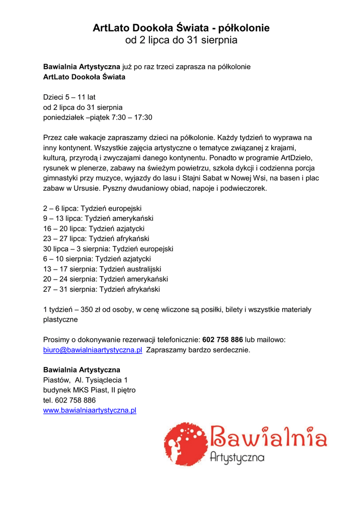 ArtLato Dookoła Świata - półkolonie od 2 lipca do 31 sierpnia Bawialnia Artystyczna już po raz trzeci zaprasza na półkolonie ArtLato Dookoła Świata Dzieci 5 – 11 lat od 2 lipca do 31 sierpnia poniedziałek –piątek 7:30 – 17:30 Przez całe wakacje zapraszamy dzieci na półkolonie. Każdy tydzień to wyprawa na inny kontynent. Wszystkie zajęcia artystyczne o tematyce związanej z krajami, kulturą, przyrodą i zwyczajami danego kontynentu. Ponadto w programie ArtDzieło, rysunek w plenerze, zabawy na świeżym powietrzu, szkoła dykcji i codzienna porcja gimnastyki przy muzyce, wyjazdy do lasu i Stajni Sabat w Nowej Wsi, na basen i plac zabaw w Ursusie. Pyszny dwudaniowy obiad, napoje i podwieczorek. 2 – 6 lipca: Tydzień europejski 9 – 13 lipca: Tydzień amerykański 16 – 20 lipca: Tydzień azjatycki 23 – 27 lipca: Tydzień afrykański 30 lipca – 3 sierpnia: Tydzień europejski 6 – 10 sierpnia: Tydzień azjatycki 13 – 17 sierpnia: Tydzień australijski 20 – 24 sierpnia: Tydzień amerykański 27 – 31 sierpnia: Tydzień afrykański 1 tydzień – 350 zł od osoby, w cenę wliczone są posiłki, bilety i wszystkie materiały plastyczne Prosimy o dokonywanie rezerwacji telefonicznie: 602 758 886 lub mailowo: [email protected] Zapraszamy bardzo serdecznie. Bawialnia Artystyczna Piastów, Al. Tysiąclecia 1 budynek MKS Piast, II piętro tel. 602 758 886 www.bawialniaartystyczna.pl