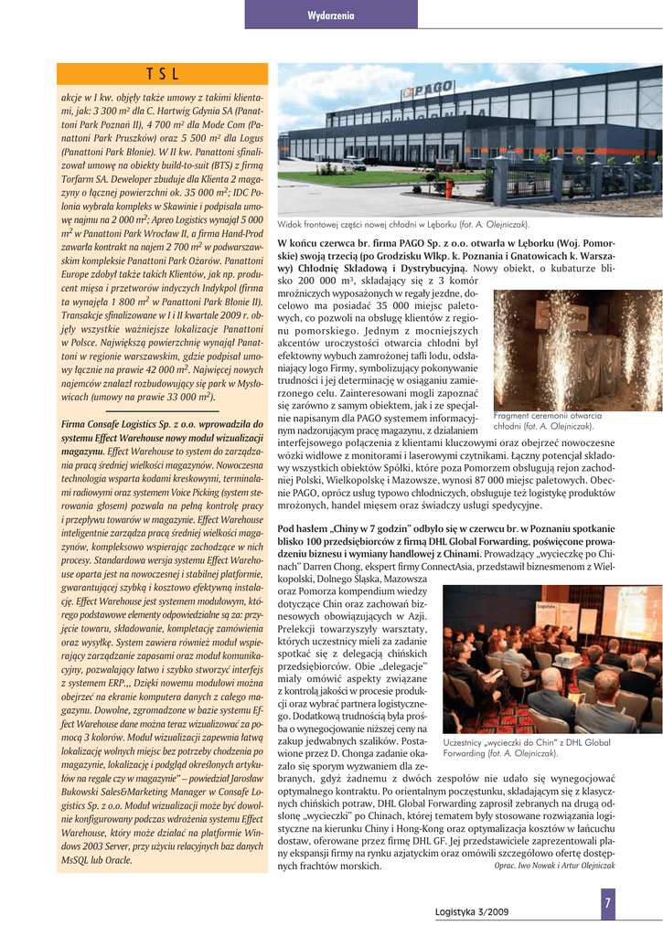 Wydarzenia TSL akcje w I kw. objęły także umowy z takimi klientami, jak: 3 300 m² dla C. Hartwig Gdynia SA (Panattoni Park Poznań II), 4 700 m² dla Mode Com (Panattoni Park Pruszków) oraz 5 500 m² dla Logus (Panattoni Park Błonie). W II kw. Panattoni sfinalizował umowę na obiekty build-to-suit (BTS) z firmą Torfarm SA. Deweloper zbuduje dla Klienta 2 magazyny o łącznej powierzchni ok. 35 000 m2; IDC Polonia wybrała kompleks w Skawinie i podpisała umowę najmu na 2 000 m2; Apreo Logistics wynajął 5 000 m2 w Panattoni Park Wrocław II, a firma Hand-Prod zawarła kontrakt na najem 2 700 m2 w podwarszawskim kompleksie Panattoni Park Ożarów. Panattoni Europe zdobył także takich Klientów, jak np. producent mięsa i przetworów indyczych Indykpol (firma ta wynajęła 1 800 m2 w Panattoni Park Błonie II). Transakcje sfinalizowane w I i II kwartale 2009 r. objęły wszystkie ważniejsze lokalizacje Panattoni w Polsce. Największą powierzchnię wynajął Panattoni w regionie warszawskim, gdzie podpisał umowy łącznie na prawie 42 000 m2. Najwięcej nowych najemców znalazł rozbudowujący się park w Mysłowicach (umowy na prawie 33 000 m2). Firma Consafe Logistics Sp. z o.o. wprowadziła do systemu Effect Warehouse nowy moduł wizualizacji magazynu. Effect Warehouse to system do zarządzania pracą średniej wielkości magazynów. Nowoczesna technologia wsparta kodami kreskowymi, terminalami radiowymi oraz systemem Voice Picking (system sterowania głosem) pozwala na pełną kontrolę pracy i przepływu towarów w magazynie. Effect Warehouse inteligentnie zarządza pracą średniej wielkości magazynów, kompleksowo wspierając zachodzące w nich procesy. Standardowa wersja systemu Effect Warehouse oparta jest na nowoczesnej i stabilnej platformie, gwarantującej szybką i kosztowo efektywną instalację. Effect Warehouse jest systemem modułowym, którego podstawowe elementy odpowiedzialne są za: przyjęcie towaru, składowanie, kompletację zamówienia oraz wysyłkę. System zawiera również moduł wspierający zarządzanie zapasami oraz moduł komunikacyjny, pozwalający łatwo i szybko stworzyć interfejs z systemem ERP.,, Dzięki nowemu modułowi można obejrzeć na ekranie komputera danych z całego magazynu. Dowolne, zgromadzone w bazie systemu Effect Warehouse dane można teraz wizualizować za pomocą 3 kolorów. Moduł wizualizacji zapewnia łatwą lokalizację wolnych miejsc bez potrzeby chodzenia po magazynie, lokalizację i podgląd określonych artykułów na regale czy w magazynie” – powiedział Jarosław Bukowski Sales&Marketing Manager w Consafe Logistics Sp. z o.o. Moduł wizualizacji może być dowolnie konfigurowany podczas wdrożenia systemu Effect Warehouse, który może działać na platformie Windows 2003 Server, przy użyciu relacyjnych baz danych MsSQL lub Oracle. Widok frontowej części nowej chłodni w Lęborku (fot. A. Olejniczak). W końcu czerwca br. firma PAGO Sp. z o.o. otwarła w Lęborku (Woj. Pomorskie) swoją trzecią (po Grodzisku Wlkp. k. Poznania i Gnatowicach k. Warszawy) Chłodnię Składową i Dystrybucyjną. Nowy obiekt, o kubaturze blisko 200 000 m³, składający się z 3 komór mroźniczych wyposażonych w regały jezdne, docelowo ma posiadać 35 000 miejsc paletowych, co pozwoli na obsługę klientów z regionu po mor skie go. Jed nym z moc niej szych akcentów uroczystości otwarcia chłodni był efektowny wybuch zamrożonej tafli lodu, odsłaniający logo Firmy, symbolizujący pokonywanie trudności i jej determinację w osiąganiu zamierzonego celu. Zainteresowani mogli zapoznać się zarówno z samym obiektem, jak i ze specjalnie napisanym dla PAGO systemem informacyj- Fragment ceremonii otwarcia nym nadzorującym pracę magazynu, z działaniem chłodni (fot. A. Olejniczak). interfejsowego połączenia z klientami kluczowymi oraz obejrzeć nowoczesne wózki widłowe z monitorami i laserowymi czytnikami. Łączny potencjał składowy wszystkich obiektów Spółki, które poza Pomorzem obsługują rejon zachodniej Polski, Wielkopolskę i Mazowsze, wynosi 87 000 miejsc paletowych. Obecnie PAGO, oprócz usług typowo chłodniczych, obsługuje też logistykę produktów mrożonych, handel mięsem oraz świadczy usługi spedycyjne. Pod hasłem „Chiny w 7 godzin” odbyło się w czerwcu br. w Poznaniu spotkanie blisko 100 przedsiębiorców z firmą DHL Global Forwarding, poświęcone prowadzeniu biznesu i wymiany handlowej z Chinami. Prowadzący „wycieczkę po Chinach” Darren Chong, ekspert firmy ConnectAsia, przedstawił biznesmenom z Wielkopolski, Dolnego Śląska, Mazowsza oraz Pomorza kompendium wiedzy dotyczące Chin oraz zachowań biznesowych obowiązujących w Azji. Prelekcji towarzyszyły warsztaty, których uczestnicy mieli za zadanie spotkać się z delegacją chińskich przedsiębiorców. Obie „delegacje” miały omówić aspekty związane z kontrolą jakości w procesie produkcji oraz wybrać partnera logistycznego. Dodatkową trudnością była prośba o wynegocjowanie niższej ceny na zakup jedwabnych szalików. PostaUczestnicy „wycieczki do Chin” z DHL Global wione przez D. Chonga zadanie oka- Forwarding (fot. A. Olejniczak). zało się sporym wyzwaniem dla zebranych, gdyż żadnemu z dwóch zespołów nie udało się wynegocjować optymalnego kontraktu. Po orientalnym poczęstunku, składającym się z klasycznych chińskich potraw, DHL Global Forwarding zaprosił zebranych na drugą odsłonę „wycieczki” po Chinach, której tematem były stosowane rozwiązania logistyczne na kierunku Chiny i Hong-Kong oraz optymalizacja kosztów w łańcuchu dostaw, oferowane przez firmę DHL GF. Jej przedstawiciele zaprezentowali plany ekspansji firmy na rynku azjatyckim oraz omówili szczegółowo ofertę dostępOprac. Iwo Nowak i Artur Olejniczak nych frachtów morskich. Logistyka 3/2009 7