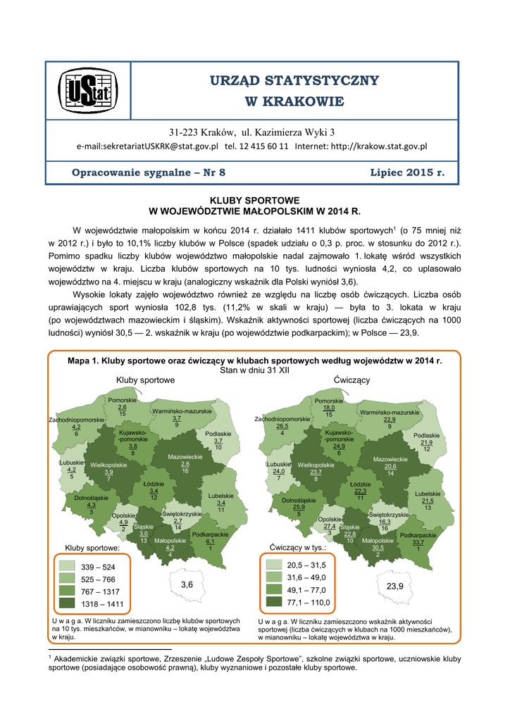 URZĄD STATYSTYCZNY W KRAKOWIE 31-223 Kraków, ul. Kazimierza Wyki 3 e‐mail:[email protected] tel. 12 415 60 11 Internet: http://krakow.stat.gov.pl Opracowanie sygnalne – Nr 8 Lipiec 2015 r. KLUBY SPORTOWE W WOJEWÓDZTWIE MAŁOPOLSKIM W 2014 R. W województwie małopolskim w końcu 2014 r. działało 1411 klubów sportowych1 (o 75 mniej niż w 2012 r.) i było to 10,1% liczby klubów w Polsce (spadek udziału o 0,3 p. proc. w stosunku do 2012 r.). Pomimo spadku liczby klubów województwo małopolskie nadal zajmowało 1. lokatę wśród wszystkich województw w kraju. Liczba klubów sportowych na 10 tys. ludności wyniosła 4,2, co uplasowało województwo na 4. miejscu w kraju (analogiczny wskaźnik dla Polski wyniósł 3,6). Wysokie lokaty zajęło województwo również ze względu na liczbę osób ćwiczących. Liczba osób uprawiających sport wyniosła 102,8 tys. (11,2% w skali w kraju) — była to 3. lokata w kraju (po województwach mazowieckim i śląskim). Wskaźnik aktywności sportowej (liczba ćwiczących na 1000 ludności) wyniósł 30,5 — 2. wskaźnik w kraju (po województwie podkarpackim); w Polsce — 23,9. Mapa 1. Kluby sportowe oraz ćwiczący w klubach sportowych według województw w 2014 r. Stan w dniu 31 XII Kluby sportowe Ćwiczący Pomorskie 2,6 15 Warmińsko-mazurskie 3,7 Zachodniopomorskie 9 4,2 KujawskoPodlaskie 6 -pomorskie 3,7 3,8 10 8 Mazowieckie Lubuskie Wielkopolskie 2.6 4,2 16 3,9 5 7 Łódzkie 3,4 Lubelskie 12 Dolnośląskie 3,4 4,3 11 3 Świętokrzyskie Opolskie 2,7 4,9 14 2 Śląskie 3,0 Podkarpackie 13 Małopolskie 6,1 4,2 Kluby sportowe: 1 4 767 – 1317 Lubuskie 24,0 7 Kujawsko-pomorskie 24,9 6 Wielkopolskie 23,7 8 Dolnośląskie 25,9 5 Ćwiczący w Warmińsko-mazurskie 22,9 9 Podlaskie 21,9 12 Mazowieckie 20,6 14 Łódzkie 22,3 11 Lubelskie 21,5 13 Świętokrzyskie Opolskie 16,3 27,4 Śląskie 16 3 22,8 Podkarpackie 10 Małopolskie 33,7 30,5 tys.: 1 2 20,5 – 31,5 339 – 524 525 – 766 Zachodniopomorskie 26,5 4 Pomorskie 18,0 15 3,6 1318 – 1411 U w a g a. W liczniku zamieszczono liczbę klubów sportowych na 10 tys. mieszkańców, w mianowniku – lokatę województwa w kraju. 31,6 – 49,0 49,1 – 77,0 23,9 77,1 – 110,0 U w a g a. W liczniku zamieszczono wskaźnik aktywności sportowej (liczba ćwiczących w klubach na 1000 mieszkańców), w mianowniku – lokatę województwa w kraju. 1 Akademickie związki sportowe, Zrzeszenie „Ludowe Zespoły Sportowe”, szkolne związki sportowe, uczniowskie kluby sportowe (posiadające osobowość prawną), kluby wyznaniowe i pozostałe kluby sportowe. –2– W końcu 2014 r. najwięcej klubów sportowych działało w Krakowie (162, tj. 11,5% wszystkich klubów w województwie; spadek udziału o 0,7 p. proc.) oraz w powiatach nowosądeckim (111) i krakowskim (108). W porównaniu do stanu sprzed dwóch lat, w 5 powiatach liczba klubów wzrosła (najwięcej w powiatach miechowskim i myślenickim — w każdym o 6), a w pozostałych — spadła. Największy spadek liczby klubów wystąpił w Krakowie (o 20) oraz powiecie tarnowskim (o 14). Najmniej klubów zarejestrowanych było — podobnie jak dwa lata wcześniej — w powiecie proszowickim (8). Mapa 2. Kluby sportowe według powiatów w 2014 r. Stan w dniu 31 XII Olkuski 3,9 0,0 4,2 -0,2 Kraków 2,1 Wielicki -0,3 4,7 -0,4 Oświęcimski 4,1 +0,2 Wadowicki 4,5 -0,3 Myślenicki 5,5 +0,5 Suski 3,7 -0,5 8 – 39 Dąbrowski 3,7 -0,2 Proszowicki 1,8 -0,5 Krakowski 4,0 -0,3 Chrzanowski 3,2 -0,2 Kluby sportowe: Miechowski 6,4 +1,2 Tarnów 3,6 -0,3 Brzeski 6,4 Bocheński +0,4 5,3 -0,3 Nowy Sącz 4,9 -0,6 Limanowski 6,3 -0,3 Nowosądecki 5,2 -0,3 Nowotarski 5,6 -0,5 40 – 57 58 – 78 79 – 162 Tarnowski 5,1 -0,7 Gorlicki 6,6 -0,8 Tatrzański 5,2 +0,6 U w a g a. W liczniku zamieszczono liczbę klubów sportowych na 10 tys. mieszkańców, w mianowniku — zmianę (wzrost/spadek) w porównaniu z 2012 r. W TABL. 1. KLUBY SPORTOWE Stan w dniu 31 XII WYSZCZEGÓLNIENIE 13 powiatach liczba klubów sportowych na 10 tys. ludności była wyższa niż 2012 2014 w liczbach 2012= bezwzględnych =100 Kluby ............................................... 1486 Sekcje ............................................. 2701 Członkowie ...................................... 105659 Ćwiczący ......................................... 105615 w tym do lat 18 ............................ 75548 w tym kobiety ................................ 25198 Trenerzy .......................................... 1492 klasy mistrzowskiej ........................ 123 klasy I ............................................ 252 klasy II ........................................... 1117 Instruktorzy sportowi ....................... 2516 Inne osoby prowadzące zajęcia sportowe ......................................... 1111 1411 2570 105956 102780 69355 24096 1544 137 284 1123 2369 95,0 95,1 100,3 97,3 91,8 95,6 103,5 111,4 112,7 100,5 94,2 966 86,9 średnio w województwie, a w 9 — niższa. Najwyższy wskaźnik odnotowano w powiecie gorlickim, a najniższy — w proszowickim. W 5 powiatach odnotowano wzrost wskaźnika (największy w powiecie miechowskim), w 16 — spadek (największy w powiecie gorlickim), a w 1 powiecie — pozostał bez zmian. Do 563 spadła liczba klubów sportowych uczestniczących, w kategoriach juniorskich lub wyższych, we współzawodnictwie sportowym na poziomie ogólnopolskim — stanowiły one 39,9% klubów w województwie (w 2012 r. — 616, tj. 41,5%). –3– W końcu 2014 r. w małopolskich klubach sportowych ćwiczyło 102,8 tys. osób (mniej o 2,8 tys., tj. o 2,7% niż w 2012 r.). Wśród nich było 67,5% osób do lat 18 włącznie (spadek o 4,0 p. proc. w porównaniu z 2012 r.); analogiczny udział kobiet wyniósł 23,4% (spadek o 0,5 p. proc.). W wyniku spadku liczby ćwiczących, o 1,0 obniżył się wskaźnik aktywności sportowej w województwie (ćwiczący w klubach sportowych na 1000 mieszkańców). Wskaźnikiem powyżej średniej wojewódzkiej charakteryz