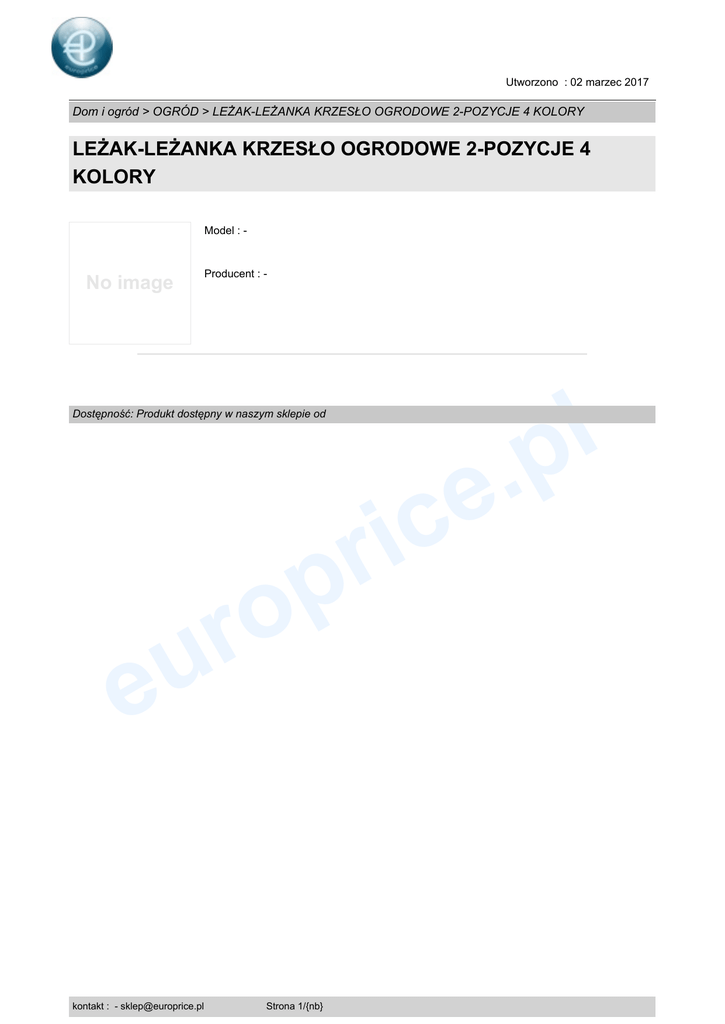 Utworzono : 02 marzec 2017 Dom i ogród > OGRÓD > LEŻAK-LEŻANKA KRZESŁO OGRODOWE 2-POZYCJE 4 KOLORY LEŻAK-LEŻANKA KRZESŁO OGRODOWE 2-POZYCJE 4 KOLORY Model : - No image Producent : - l .p Dostępność: Produkt dostępny w naszym sklepie od o r u e kontakt : - [email protected] r p e ic Strona 1/{nb}