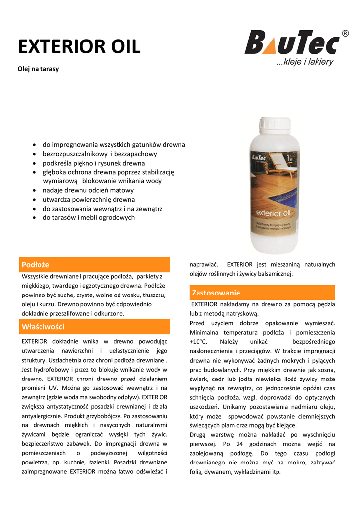 EXTERIOR OIL Olej na tarasy do impregnowania wszystkich gatunków drewna bezrozpuszczalnikowy i bezzapachowy podkreśla piękno i rysunek drewna głęboka ochrona drewna poprzez stabilizację wymiarową i blokowanie wnikania wody nadaje drewnu odcień matowy utwardza powierzchnię drewna do zastosowania wewnątrz i na zewnątrz do tarasów i mebli ogrodowych Podłoże Wszystkie drewniane i pracujące podłoża, parkiety z miękkiego, twardego i egzotycznego drewna. Podłoże powinno być suche, czyste, wolne od wosku, tłuszczu, oleju i kurzu. Drewno powinno być odpowiednio dokładnie przeszlifowane i odkurzone. Właściwości EXTERIOR dokładnie wnika w drewno powodując utwardzenia nawierzchni i uelastycznienie jego struktury. Uszlachetnia oraz chroni podłoża drewniane . Jest hydrofobowy i przez to blokuje wnikanie wody w drewno. EXTERIOR chroni drewno przed działaniem promieni UV. Można go zastosować wewnątrz i na zewnątrz (gdzie woda ma swobodny odpływ). EXTERIOR zwiększa antystatyczność posadzki drewnianej i działa antyalergicznie. Produkt grzybobójczy. Po zastosowaniu na drewnach miękkich i nasyconych naturalnymi żywicami będzie ograniczać wysięki tych żywic. bezpieczeństwo zabawek. Do impregnacji drewna w pomieszczeniach o podwyższonej wilgotności powietrza, np. kuchnie, łazienki. Posadzki drewniane zaimpregnowane EXTERIOR można łatwo odświeżać i naprawiać. EXTERIOR jest mieszaniną naturalnych olejów roślinnych i żywicy balsamicznej. Zastosowanie EXTERIOR nakładamy na drewno za pomocą pędzla lub z metodą natryskową. Przed użyciem dobrze opakowanie wymieszać. Minimalna temperatura podłoża i pomieszczenia +10C. Należy unikać bezpośredniego nasłonecznienia i przeciągów. W trakcie impregnacji drewna nie wykonywać żadnych mokrych i pylących prac budowlanych. Przy miękkim drewnie jak sosna, świerk, cedr lub jodła niewielka ilość żywicy może wypłynąć na zewnątrz, co jednocześnie opóźni czas schnięcia podłoża, wzgl. doprowadzi do optycznych uszkodzeń. Unikamy pozostawiania nadmiaru oleju, który może spowodować powstanie ciemniejszych świecących plam oraz mogą być klejące. Drugą warstwę można nakładać po wyschnięciu pierwszej. Po 24 godzinach można wejść na zaolejowaną podłogę. Do tego czasu podłogi drewnianego nie można myć na mokro, zakrywać folią, dywanem, wykładzinami itp. Narzędzia Zużyte szmatki, ściereczki lub pady, pył szlifierski nasączone olejem należy przechowywać w szczelnych metalowych pojemnikach lub zalać wodą i usunąć. Przestrzegać zaleceń zawartych w Karcie Charakterystyki wyrobu. Pędzel Czyszczenie Terpentyna lub specjalny rozpuszczalnik OIL THINNER Czyszczenie i ponowna impregnacja Raz w roku należy przeprowadzić ponowne czyszczenie tarasu i ponowną impregnację . Za pomocą zraszacza ogrodowego nanosimy rozcieńczony z wodą INTENSIV ( 1:5 ) . Po ok 15 minutach rozmiękczony stary olej z zabrudzeniami usuwamy strumieniem wodnym z Karchera. Po wyschnięciu drewna nanosimy ponownie dwa razy olej. Bezpieczeństwo i ochrona Podczas pracy używać gumowych rękawic. Po zakończeniu prac przewietrzyć pomieszczenie. Resztek produktu w opakowaniu nie wyrzucać tylko odpowiednio i bezpiecznie utylizować H226: Łatwopalna ciecz i pary. EUH066: Powtarzające się narażenie może powodować wysuszanie lub pękanie skóry. P301+P310: W przypadku połknięcia natychmiast skontaktować się z Ośrodkiem zatruć lub lekarzem. P331: NIE wywoływać wymiotów. P405: Przechowywać pod zamknięciem. P501: Zawartość/ Pojemnik usuwać w licencjonowanym przedsiębiorstwie utylizacji odpadów.. Ważne wskazówki Dane techniczne Skład: Olej lniany, alkidowa żywica balsamiczna w roztworze izoparafiny Kolor: mleczno-miodowy Konsystencja: płynna Usuwanie: Nie wylewać do kanalizacji, płynne resztki zabezpieczyć i utylizować jako odpad niebezpieczny. Temperatura stosowania: od +10°C do +27°C Zużycie przy 1 warstwie Zużycie przy 2 warstwach Maksymalne zużycie dla jednej warstwy ok. 30-50 ml/m2 ok. 60 - 100 ml/m2 max. 70 ml/m2 Czas schnięcia: Czas pełnego utwardzenia: ok. 12 godzin na warstwę po 8 dniach Stosowanie Nie rozcieńczać Składowanie temp. powyżej +5°C Magazynowanie 12 miesięcy w suchych i chłodnych pomieszczeniach, w szczelnym opakowaniu. Powyższe dane, przygotowanie i zastosowanie produktu oparto na naszej wiedzy i doświadczeniu. Niższe temperatury wydłużają czasy zastosowań, a wyższe skracają. Z powodu różnych niezależnych od nas czynników np. nietypowe podłoża, warunki zewnętrzne, jakość pracy, zalecamy przeprowadzenie własnych prób, aby stwierdzić, czy nasz produkt nadaje się do danego postępowania. Firma Bautec Polska nie ponosi odpowiedzialności z tego powodu. Przed użyciem należy zapoznać się z instrukcją techniczną i kartą charakterystyki produktu. Prace należy wykonywać zgodnie z zasadami BHP. Aktualizacja 30.01.2015 Ostrzeżenie przed samozapłonem BAUTEC POLSKA SP. Z O.O. UL. STYSIA 33A, 53-525 WROCŁAW TEL./FAX 71 796 26 02, +48 722-142-403 www.bautec.pl * [email protected]