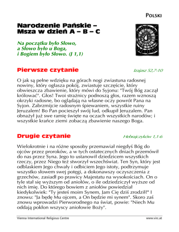 Polski Na początku było Słowo, a Słowo było u Boga, i Bogiem było Słowo. (J 1,1) O jak są pełne wdzięku na górach nogi zwiastuna radosnej nowiny, który ogłasza pokój, zwiastuje szczęście, który obwieszcza zbawienie, który mówi do Syjonu: "Twój Bóg zaczął królować". Głos! Twoi strażnicy podnoszą głos, razem wznoszą okrzyki radosne, bo oglądają na własne oczy powrót Pana na Syjon. Zabrzmijcie radosnym śpiewaniem, wszystkie ruiny Jeruzalem! Bo Pan pocieszył swój lud, odkupił Jeruzalem. Pan obnażył już swe ramię święte na oczach wszystkich narodów; i wszystkie krańce ziemi zobaczą zbawienie naszego Boga. Wielokrotnie i na różne sposoby przemawiał niegdyś Bóg do ojców przez proroków, a w tych ostatecznych dniach przemówił do nas przez Syna. Jego to ustanowił dziedzicem wszystkich rzeczy, przez Niego też stworzył wszechświat. Ten Syn, który jest odblaskiem Jego chwały i odbiciem Jego istoty, podtrzymuje wszystko słowem swej potęgi, a dokonawszy oczyszczenia z grzechów, zasiadł po prawicy Majestatu na wysokościach. On o tyle stał się wyższym od aniołów, o ile odziedziczył wyższe od nich imię. Do którego bowiem z aniołów powiedział kiedykolwiek: "Ty jesteś moim Synem, Jam Cię dziś zrodził?" I znowu: "Ja będę Mu ojcem, a On będzie mi synem". Skoro zaś znowu wprowadzi Pierworodnego na świat, powie: "Niech Mu oddają pokłon wszyscy aniołowie Boży". Vienna International Religious Centre www.virc.at Na początku było Słowo, a Słowo było u Boga, i Bogiem było Słowo. Ono było na początku u Boga. Wszystko przez Nie się stało, a bez Niego nic się nie stało, co się stało. W Nim było życie, a życie było światłością ludzi, a światłość w ciemności świeci i ciemność jej nie ogarnęła. Była Światłość prawdziwa, która oświeca każdego człowieka, gdy na świat przychodzi. Na świecie było Słowo, a świat stał się przez Nie, lecz świat Go nie poznał. Przyszło do swojej własności, a swoi Go nie przyjęli. Wszystkim tym jednak, którzy Je przyjęli, dało moc, aby się stali dziećmi Bożymi, tym, którzy wierzą w imię Jego, którzy ani z krwi, ani z żądzy ciała, ani z woli męża, ale z Boga się narodzili. Słowo stało się ciałem i zamieszkało między nami. I oglądaliśmy Jego chwałę, chwałę, jaką Jednorodzony otrzymuje od Ojca, pełen łaski i prawdy. W środku nocy, gdy wszystko pogrążone było jeszcze w głębokim śnie, Słowo, "które było u Boga i jest Bogiem", stało się Człowiekiem. Wszystkim, którzy Go – wcielone Słowo – przyjęli "dał moc stania się Dziećmi Boga" (por. J 1,12). To właśnie stanowi centrum tajemnicy, którą świętujemy w Boże Narodzenie. W tej centralnej wypowiedzi nie chodzi ani o mit, ani o wyrażenie ideologiczne. Wiemy, że Mesjasz, Wybawca i Pan, narodził się określonego dnia, w określonym miejscu. O samych narodzinach nie ma przekazu. Widzimy tylko Maryję zatroskaną o dziecko. Zarówno osłona tajemnicy wokół narodzin, jak i jedyności pierworodnego, który jest jednocześnie Bogiem i człowiekiem, nie została naruszona. Jedno jest niemniej widoczne: sympatia Boga do maluczkich i pokornych. Oni są celem Jego dobroci. W postaciach ubogich pasterzy na polach betlejemskich byli pierwszymi, którym ogłoszona została wiadomość o narodzeniu prawdziwego i dobrego Pasterza. Znak, który został im dany był jednoznaczny. Dziecko i okoliczności jego narodzin ucieleśniały ubóstwo całkowicie. Nowina przekazana przez anioła musiała wywołać głębokie echo w ich sercach. Pośpiesznie biegną, by zbadać prawdziwość tej wiadomości. Rzeczywiście znajdują to, czego szukali w swoim wnętrzu: dziecko, ucieleśnienie znaku Boga. Dla nich znak ten jest wystarczająco przekonywujący. Przyjmują Wybawcę i natychmiast stają się pierwszymi głosicielami Radosnej Nowiny poprzez opowiadanie w swoim środowisku o tym szczęśliwym wydarzeniu. Czy realnym jest Boży znak dla nas? Nie wystarcza, gdy wzruszeni pochylamy się nad żłóbkiem. Podobnie, jak pasterze, jesteśmy wezwani, by z głębi serca okazać wdzięczność, zaufać i w oparciu o to zaufanie żyć. Wzorem dla nas może być Maryja. Ona pozwala prowadzić się przez Boga i zachowuje wszelkie wydarzenia w swoim sercu, aby modlić się nimi wraz ze swoim Stwórcą. Vienna International Religious Centre [email protected] Na początku było Słowo, a Słowo było u Boga, i Bogiem było Słowo. (J 1,1) O jak są pełne wdzięku na górach nogi zwiastuna radosnej nowiny, który ogłasza pokój, zwiastuje szczęście, który obwieszcza zbawienie, który mówi do Syjonu: "Twój Bóg zaczął królować". Głos! Twoi strażnicy podnoszą głos, razem wznoszą okrzyki radosne, bo oglądają na własne oczy powrót Pana na Syjon. Zabrzmijcie radosnym śpiewaniem, wszystkie ruiny Jeruzalem! Bo Pan pocieszył swój lud, odkupił Jeruzalem. Pan obnażył już swe ramię święte na oczach wszystkich narodów; i wszystkie krańce ziemi zobaczą zbawienie naszego Boga. Wielokrotnie i na różne sposoby przemawiał niegdyś Bóg do ojców przez proroków, a w tych ostatecznych dniach przemówił do nas przez Syna. Jego to ustanowił dziedzicem wszystkich rzeczy, przez Niego też stworzył wszechświat. Ten Syn, który jest odblaskiem Jego chwały i odbiciem Jego istoty, podtrzymuje wszystko słowem swej potęgi, a dokonawszy oczyszczenia z grzechów, zasiadł po prawicy Majestatu na wysokościach. On o tyle stał się wyższym od aniołów, o ile odziedziczył wyższe od nich imię. Do którego bowiem z aniołów powiedział kiedykolwiek: "Ty jesteś moim Synem, Jam Cię dziś zrodził?" I znowu: "Ja będę Mu ojcem, a On będzie mi synem". Skoro zaś znowu wprowadzi Pierworodnego na świat, powie: "Niech Mu oddają pokłon wszyscy aniołowie Boży". Vienna International Religious Centre [email protected] Na początku było Słowo, a Słowo było u Boga, i Bogi
