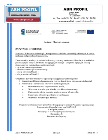 ABN PROFIL 37-400 Nisko Racławice ul. Lubelska 9 tel./ fax. +48 (15) 841 24 42 , (15) 841 66 56 www.abnprofil.pl e-mail: [email protected] Dostawcy Maszyn i urządzeń ZAPYTANIE OFERTOWE Dotyczy : Wdrożenie technologii „Kompleksowa obróbka konstrukcji okiennych w czasie realizacji połączeń konstrukcyjnych „ Zwracam się z prośbą o przedstawienie oferty cenowej na dostawę i instalację w zakładzie produkcyjnym firmy ABN Profil następujących maszyn i urządzeń, będących częścią planowanej do wdrożenia nowej technologii: - zgrzewarka czterogłowicowa - automatyczna oczyszczarka naroży - sekcja obróbcza Moduł 1 - sekcja obróbcza Moduł 2 Urządzenia powinny realizować opisany poniżej proces technologiczny. 1. Łączenie profili metodą zgrzewania tworząc konstrukcje okienne ram i skrzydeł, 2. Frezowanie i nawiercanie otworów technologicznych: • Odwodnienia oraz odpowietrzenia profili, • Wiercenie otworów pod klamkę oraz kieszeń zasuwnicy, • Znakowanie miejsc montażu słupka w ramie lub skrzydle, • Frezowanie otworów pod kratkę wentylacyjna, • Wiercenie otworów pod zawiasy, …………………………………………………………………………………………………... Projekt współfinansowany przez Unię Europejską w ramach Programu Operacyjnego Innowacyjna Gospodarka na lata 2007-2013 4. Oś priorytetowa: Inwestycje w innowacyjne przedsięwzięcia Działanie 4.3: Kredyt technologiczny ABN PRODUKCJA Strona 1 2012-03-15 Opis szczegółowy procesu: Uprzednio przygotowany profil mocowany jest w zgrzewarce i uruchamia się cykl zgrzewania. Po zgrzaniu gotowy element przekazywany jest na stanowisko chłodzenia. Podczas chłodzenia następuje obróbka elementów pionowych ( lub poziomych ,w zależności od konfiguracji) ramy lub skrzydła. Operacja chłodzenia trwa 2 minuty dla każdej konstrukcji. Wykonywana jest operacja obróbcza. Następuje jednocześnie chłodzenie ramy i pierwsza część operacji obróbczej. Wykonywane jest wówczas część operacji związanych z frezowaniem i nawierceniem otworów technologicznych –odwodnienia i odpowietrzenia profili, wiercenie otworów pod klamkę oraz kieszeń zasuwnicy, wiercenie otworów montażowych elementów okuć , znakowanie miejsc montażu słupka w ramie lub skrzydle, wiercenie otworów pod nawietrzaki, frezowanie otworów pod kratkę wentylacyjna, znakowanie miejsc mocowań zaczepów obwodowych, wiercenie otworów pod zawiasy, tak aby zrezygnować z późniejszego użycia mało precyzyjnych szablonów. Po obróbce konstrukcja przekazywana jest do automatycznej zaczyszczarki CNC, gdzie obrabiane są 4 zgrzewy ( połączenia krawędzi profili ) na całej linii zgrzewająco-czyszczącej. Przekazanie konstrukcji następuje już w pozycji gotowej do obróbki tak aby nie było potrzebne dodatkowe pozycjonowanie ramy bądź skrzydła. W ten sposób konstrukcja obracana jest za pomocą automatu 3, a nie 4 razy jak to ma miejsce w rozwiązaniach do tej pory stosowanych. Pozwala to zaoszczędzić czas i nie opóźniać cyklu produkcyjnego. Następnie element okienny jest przekazywany do drugiego centrum obróbczego także w pozycji gotowej do obróbki. Obrabiane są elementy płaszczyzny pominiętej podczas obróbki przez pierwsze centrum obróbcze. Proces montażu słupka staje się nieporównywalnie szybszy oraz mniej pracochłonny ze względu na zastosowanie nowych technologii. Otwory montażowe są już wykonane przez centrum obróbki na linii zgrzewająco-czyszczącej , nie ma potrzeby korzystania z szablonów. …………………………………………………………………………………………………... Projekt współfinansowany przez Unię Europejską w ramach Programu Operacyjnego Innowacyjna Gospodarka na lata 2007-2013 4. Oś priorytetowa: Inwestycje w innowacyjne przedsięwzięcia Działanie 4.3: Kredyt technologiczny ABN PRODUKCJA Strona 2 2012-03-15 Termin i miejsce złożenia oferty: 26.03.2012 godz. 15.00 – siedziba firmy ABN PROFIL w Racławicach przy ul. Lubelskiej 9. Ofertę można dostarczyć osobiście, faksem, pocztą elektroniczną lub listownie- liczy się data otrzymania oferty. Złożona oferta powinna zawierać co najmniej: • Nazwę i adres Oferenta oraz nazwę i adres Zamawiającego • Opis nawiązujący do parametrów wyszczególnionych w zapytaniu ofertowym. • Proponowane warunki płatności. • Wartość oferty netto oraz brutto. • Datę opracowania oferty oraz termin jej ważności • Podpis osoby upoważnionej do składaniu ofert w imieniu Oferenta. Wybór najkorzystniejszej oferty nastąpi w oparciu o kryterium najniższej ceny ofertowejwaga kryterium 100 %. …………………………………………………………………………………………………... Projekt współfinansowany przez Unię Europejską w ramach Programu Operacyjnego Innowacyjna Gospodarka na lata 2007-2013 4. Oś priorytetowa: Inwestycje w innowacyjne przedsięwzięcia Działanie 4.3: Kredyt technologiczny ABN PRODUKCJA Strona 3 2012-03-15