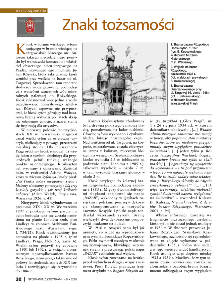 TO TEŻ SĄ ZABYTKI 1648 2008 Znaki tożsamości ROK WARSZAWSKIEJ PRAGI iosk w formie wielkiego syfonu stojącego w bramie wiodącej na targowisko? Dlaczego nie. Autorem takiego niecodziennego pomysłu był warszawski farmaceuta i właściciel obszernego placu targowego na Pradze, nazwanego jego imieniem, Julian Różycki, który taki właśnie kiosk wzniósł przy wejściu na bazar od ul. Targowej. Sprzedawano tam tandetne słodycze i wody gazowane, pochodzące z wytwórni sztucznych wód mineralnych należącej do Różyckiego. Kiosk reklamował więc jedno z wielu przedsięwzięć pomysłowego aptekarza. Różycki zapewne nie przypuszczał, że kiosk-syfon górujący nad bazarową bramą wzbudzi po latach skrajnie odmienne emocje, a nawet stanie się inspiracją dla artystów. W pierwszej połowie lat trzydziestych XX w. warszawski magistrat uznał wielki syfon za estetyczny wybryk, nielicujący z powagą przestrzeni miejskiej stolicy. Dla mieszkańców Pragi osobliwy kiosk stanowił już wtedy jeden z symboli dzielnicy; dla przyjezdnych pełnił funkcję ważnego punktu orientacyjnego. Kiosk-syfon był rysowany i opisywany. Zaistniał m.in. w twórczości Adama Ważyka, który w wierszu Syfon na Pradze pisał: „Na Pradze mówi niezgrabny syfon / Idziemy słuchamy go wszyscy / Idą trzy kościoły gotyckie / jak trzej królowie nubijscy” (Adam Ważyk, Oczy i usta, Warszawa 1926, s. 41). Nietypowy kiosk wybudowano na przełomie XIX i XX w. We wrześniu 1897 r. praskiego syfonu jeszcze nie było: budowla taka nie została naniesiona na planie Lindleya (zob. plan Lindleya w zbiorach Archiwum Państwowego m.st. Warszawy, sygn. L 734/12). Kiosk uwidoczniony jest natomiast na planie z 1905 r. (plan Lindleya, Praga, blok 53, zarys 6). Wielki syfon pojawił się zapewne w 1901 lub 1902 r. w związku z ostatecznym uporządkowaniem bazaru Różyckiego, istniejącego faktycznie od połowy lat siedemdziesiątych XIX stulecia i rozwijającego się terytorialnie do 1886 r. 1. Brama bazaru Różyckiego i kiosk-syfon, 1916 r. (rys. B. Kopczyńskiego w zbiorach Muzeum Historycznego m.st. Warszawy) K 32 SPOTKANIA Z ZABYTKAMI nr 8 • 2008 2. Wejście na bazar Różyckiego, październik 1935 r. (fot. w zbiorach prywatnych S. Kazikowskiego) 3. Brama bazaru Dzierżanowskiego przy ul. Targowej 66, około 1948 r. (fot. L. Jabrzemskiego w zbiorach Muzeum Warszawskiej Pragi) 1 Korpus kiosku-syfonu zbudowany był z drewna pokrytego cynkową blachą, pomalowaną na kolor niebieski. Głowicę syfonu wykonano z cynkowej blachy, lutując poszczególne części. Nad wejściem od ul. Targowej, na korpusie, zainstalowana została elektryczna lampa z kulistym, mlecznym kloszem na wysięgniku. Średnica podstawy kiosku wynosiła 2,5 m (obliczenie na podstawie planu Lindleya z 1905 r.), całkowita wysokość – około 7 m, w tym wysokość blaszanej głowicy – około 2 m. Kiosk przylegał do żelaznej bramy targowiska, pochodzącej zapewne z 1883 r. Między dwoma żeliwnymi słupkami znajdował się napis: „BAZAR”, wykonany w językach rosyjskim i polskim; poniżej – dekoracja skomponowana z motywów esownic. Rosyjski i polski napis rozdzielał wizerunek syreny. Bramę wieńczyły dwa dekoracyjne proporczyki osadzone na kulach. W 1916 r. rosyjski napis był już usunięty, co widać na reprodukowanym rysunku Bronisława Kopczyńskiego. Efekt asymetrii usunięto w okresie międzywojennym, likwidując wizerunek syreny i przesuwając polski napis „BAZAR” centralnie nad wejście. Kiosk-syfon rozebrano na krótko przed wybuchem drugiej wojny światowej. Piotr Kulesza przytacza fragment artykułu pt. Bogacz Różycki da- je zły przykład („Głos Pragi”, nr 1 z 26 sierpnia 1934 r.), w którym dziennikarz ubolewał: „[...] Władze administracyjno-sanitarne nie ustają w pracy, aby poprawić stan sanitarny bazarów, które do niedawna przypominały swym wyglądem prawdziwe śmietniska”. [...] Jeden tylko p. Różycki (szczególnie Wacław), bogacz, prawdziwy krezus nie tylko w skali praskiej [...] ograniczył się wyłącznie do wykonania – i to pod przymusem – tego, co mu nakazały wykonać władze. Ile to trudu zadały sobie władze, nim p. Różyckiego skłoniły do zdjęcia groteskowego syfonu?!” [...] „Tak więc wspaniały, błękitno-niebieski symbol świetności bazaru wylądował na śmietniku” – stwierdzał Kulesza (P. Kulesza, Niebieski syfon. Z dziejów bazaru Różyckiego, Warszawa 2004, s. 94). Wbrew informacji zawartej we fragmencie przytoczonego artykułu, kiosk-syfon nie został jednak usunięty w 1934 r. W zbiorach prawnuka Juliana Różyckiego, Stanisława Kazikowskiego, zachowało się reprodukowane tu zdjęcie wykonane w październiku 1935 r. Syfon stoi nadal, a w jego wnętrzu widać handlujących. Kiosk usunięto więc dopiero między 1935 a 1939 r. Możliwe, że w tym samym czasie wywieziona została na złom żelazna ozdobna brama bazaru, mocno odbiegająca swym wyglądem TO TEŻ SĄ ZABYTKI ści” – pisał Yi-Fu Tuan w pracy Przestrzeń i miejsce (Warszawa 1987, s. 206). Ów świat wyobrażeń i emocji staje się podstawowym czynnikiem skłaniającym określone zbiorowości do przywracania niegdyś unicestwionych, charakterystycznych elementów krajobrazu. Nie ma przy tym większego znaczenia, czy chodzi tu o budowle istotne w skali ogólnonarodowej (np. odbudowa Zamku Królewskiego w Warszawie) czy o symbole ważne dla lokalnych społeczności, a nawet grup. Wracający pomysł przywrócenia praskiego kiosku-syfonu potwierdza tę zasadę. Wyróżniająca się w szczególny sposób budowla lub dowolna charakterystyczna konstrukcja ułatwia ludności napływowej identyfikowanie się z danym obszarem. Rodowitym mieszkańcom określonego terenu daje poczucie związku z historią miejsca, występując jako znak tożsamości pojawiający się we wspomnieniach ich dziadków i rodziców. W takim wypadku kwestia oryginalności obiektu nie jest najistotniejsza, liczy się b