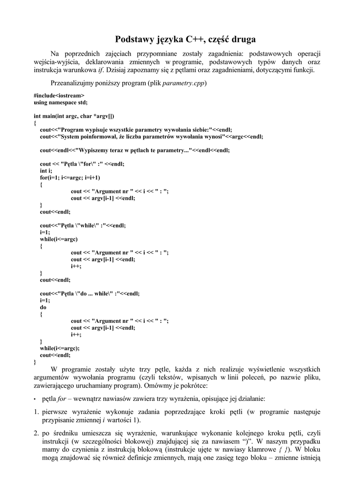 komend – ilość tych parametrów zawarta jest w zmiennej argc. W deklaracji pętli for można opuścić