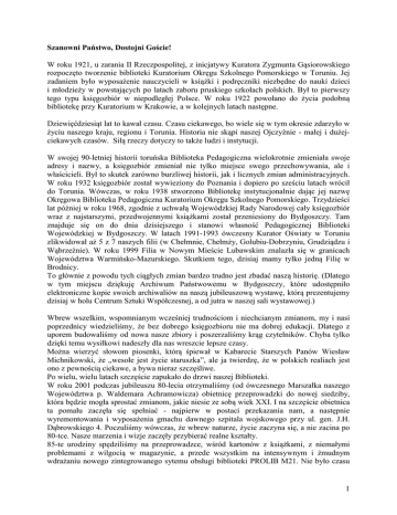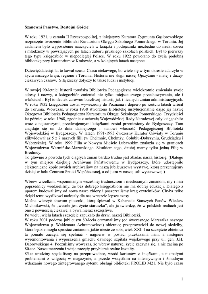 Szanowni Państwo, Dostojni Goście! W roku 1921, u zarania II Rzeczpospolitej, z inicjatywy Kuratora Zygmunta Gąsiorowskiego rozpoczęto tworzenie biblioteki Kuratorium Okręgu Szkolnego Pomorskiego w Toruniu. Jej zadaniem było wyposażenie nauczycieli w książki i podręczniki niezbędne do nauki dzieci i młodzieży w powstających po latach zaboru pruskiego szkołach polskich. Był to pierwszy tego typu księgozbiór w niepodległej Polsce. W roku 1922 powołano do życia podobną bibliotekę przy Kuratorium w Krakowie, a w kolejnych latach następne. Dziewięćdziesiąt lat to kawał czasu. Czasu ciekawego, bo wiele się w tym okresie zdarzyło w życiu naszego kraju, regionu i Torunia. Historia nie skąpi naszej Ojczyźnie - małej i dużejciekawych czasów. Siłą rzeczy dotyczy to także ludzi i instytucji. W swojej 90-letniej historii toruńska Biblioteka Pedagogiczna wielokrotnie zmieniała swoje adresy i nazwy, a księgozbiór zmieniał nie tylko miejsce swego przechowywania, ale i właścicieli. Był to skutek zarówno burzliwej historii, jak i licznych zmian administracyjnych. W roku 1932 księgozbiór został wywieziony do Poznania i dopiero po sześciu latach wrócił do Torunia. Wówczas, w roku 1938 stworzono Bibliotekę instytucjonalnie dając jej nazwę Okręgowa Biblioteka Pedagogiczna Kuratorium Okręgu Szkolnego Pomorskiego. Trzydzieści lat później w roku 1968, zgodnie z uchwałą Wojewódzkiej Rady Narodowej cały księgozbiór wraz z najstarszymi, przedwojennymi książkami został przeniesiony do Bydgoszczy. Tam znajduje się on do dnia dzisiejszego i stanowi własność Pedagogicznej Biblioteki Wojewódzkiej w Bydgoszczy. W latach 1991-1993 ówczesny Kurator Oświaty w Toruniu zlikwidował aż 5 z 7 naszych filii (w Chełmnie, Chełmży, Golubiu-Dobrzyniu, Grudziądzu i Wąbrzeźnie). W roku 1999 Filia w Nowym Mieście Lubawskim znalazła się w granicach Województwa Warmińsko-Mazurskiego. Skutkiem tego, dzisiaj mamy tylko jedną Filię w Brodnicy. To głównie z powodu tych ciągłych zmian bardzo trudno jest zbadać naszą historię. (Dlatego w tym miejscu dziękuję Archiwum Państwowemu w Bydgoszczy, które udostępniło elektroniczne kopie swoich archiwaliów na naszą jubileuszową wystawę, którą prezentujemy dzisiaj w holu Centrum Sztuki Współczesnej, a od jutra w naszej sali wystawowej.) Wbrew wszelkim, wspomnianym wcześniej trudnościom i niechcianym zmianom, my i nasi poprzednicy wiedzieliśmy, że bez dobrego księgozbioru nie ma dobrej edukacji. Dlatego z uporem budowaliśmy od nowa nasze zbiory i poszerzaliśmy krąg czytelników. Chyba tylko dzięki temu wysiłkowi nadeszły dla nas wreszcie lepsze czasy. Można wierzyć słowom piosenki, którą śpiewał w Kabarecie Starszych Panów Wiesław Michnikowski, że „wesołe jest życie staruszka”, ale ja twierdzę, że w polskich realiach jest ono z pewnością ciekawe, a bywa nieraz szczęśliwe. Po wielu, wielu latach szczęście zapukało do drzwi naszej Biblioteki. W roku 2001 podczas jubileuszu 80-lecia otrzymaliśmy (od ówczesnego Marszałka naszego Województwa p. Waldemara Achramowicza) obietnicę przeprowadzki do nowej siedziby, która będzie mogła sprostać zmianom, jakie niesie ze sobą wiek XXI. I na szczęście obietnica ta pomału zaczęła się spełniać - najpierw w postaci przekazania nam, a następnie wyremontowania i wyposażenia gmachu dawnego szpitala wojskowego przy ul. gen. J.H. Dąbrowskiego 4. Poczuliśmy wówczas, że wbrew naturze, życie zaczyna się, a nie zacina po 80-tce. Nasze marzenia i wizje zaczęły przybierać realne kształty. 85-te urodziny spędziliśmy na przeprowadzce, wśród kartonów z książkami, z niemałymi problemami z wilgocią w magazynie, a przede wszystkim na intensywnym i żmudnym wdrażaniu nowego zintegrowanego sytemu obsługi biblioteki PROLIB M21. Nie było czasu 1 na świętowanie. We wrześniu 2007 r., po szczęśliwym pokonaniu trudności, Marszałek Województwa Kujawsko-Pomorskiego Piotr Całbecki wraz z Kujawsko-Pomorską Kurator Oświaty Bożeną Adamską w obecności licznych gości uroczyście otworzyli nową siedzibę Biblioteki, a Biskup Toruński Andrzej Suski dokonał aktu jej poświęcenia. Od 2009 roku patronuje nam niezwykła Polka i Torunianka – pani generał brygady, profesor Elżbieta Zawacka. Jesteśmy przekonani, że na taką patronkę warto było czekać aż 88 lat. Każdy jubileusz odsyła do początków i do dróg przebytych. Doceniamy wkład wszystkich naszych bibliotekarzy w budowanie księgozbioru, jego opracowanie i udostępnianie. Wiemy, że w ciągu tych lat wszyscy mieliśmy swój niemały wkład w kształcenie i doskonalenie zawodowe nauczycieli. W ten sposób mieliśmy też pośredni udział w edukacji i wychowaniu wielu pokoleń uczniów szkół wszystkich szczebli i typów. Ogromnie cenimy sobie naszą przeszłość, ale tak naprawdę najważniejsza jest dla nas teraźniejszość i przyszłość. Z tą myślą podejmowaliśmy w ostatnich latach wiele działań, które miały zapewnić bibliotece rozwój na miarę oczekiwań czytelników i czasów nam współczesnych. Myśląc o teraźniejszości i przyszłości starannie kształtujemy nasz księgozbiór starając się utrzymać jego specjalistyczny charakter. Wykorzystujemy najnowsze technologie informatyczne we wszystkich procesach bibliotecznych. Dzięki tym technologiom szybko komunikujemy się ze światem, a świat z nami. Cieszymy się, że dzięki temu czytelnicy szybciej docierają do niezbędnych im dokumentów i informacji. Modyfikujemy naszą ofertę edukacyjną i tradycyjne szkolenia biblioteczne uzupełniamy szkoleniami e-lerningowymi. Wykorzystujemy też możliwości, jakie daje nam nasza nowa siedziba i organizujemy wiele imprez o charakterze kulturalnym i oświatowym. Dzięki temu zyskaliśmy szeroki krąg przyjaciół, szczególnie wśród licznych placówek oświatowych i kulturalnych, stowarzyszeń i organizacji pozarz