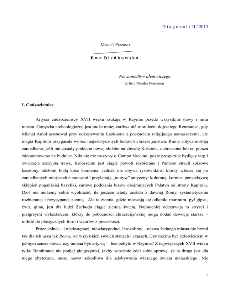 D i a g o n a l i II / 2013 MONSÙ PUSSINO Ewa Bieńkowska Nie zaniedbywałem niczego. (z listu Nicolas Poussina) I. Cudzoziemiec Artyści cudzoziemscy XVII wieku szukają w Rzymie przede wszystkim sławy i mitu miasta. Gorączka archeologiczna jest może mniej żarliwa niż w stuleciu dojrzałego Renesansu, gdy Michał Anioł asystował przy odkopywaniu Laokoona z poczuciem religijnego namaszczenia, ale magia Kapitolu przygasała wobec majestatycznych budowli chrześcijaństwa. Ruiny antyczne stoją zaniedbane, jeśli nie zostały poddane nowej służbie na chwałę Kościoła, ochrzczone lub co gorsza zdemontowane na budulec. Nikt się nie troszczy o Campo Vaccino, gdzie prosperuje bydlęcy targ i zwierzęta szczypią trawę, Kolosseum jest ciągle powoli rozbierane i Panteon stracił spiżowe kasetony, odsłonił białą kość kamienia. Jednak nie ubywa rysowników, którzy włóczą się po zaniedbanych miejscach z notesami i przyłapują „motyw” antyczny: kolumnę, kornisz, perspektywę sklepień pogańskiej bazyliki, surowe podcienia łuków obejmujących Palatyn od strony Kapitolu. Dziś nie możemy sobie wyobrazić, ile jeszcze wtedy zostało z dawnej Romy, systematycznie rozbieranej i przysypanej ziemią. Ale ta ziemia, gdzie mieszają się odłamki marmuru, pył gipsu, żwir, glina, jest dla ludzi Zachodu ciągle ziemią świętą. Najmocniej odczuwają to artyści i pielgrzymi wykształceni, którzy do pobożności chrześcijańskiej mogą dodać dewocję starszą – miłość do plastycznych form i wzorów z przeszłości. Prócz jednej – i niedostępnej, niewiarygodnej Jerozolimy – nazwa żadnego miasta nie brzmi tak dla ich uszu jak Roma, we wszystkich swoich stanach i czasach. Czy można być człowiekiem w pełnym sensie słowa, czy można być artystą – bez pobytu w Rzymie? Z największych XVII wieku tylko Rembrandt nie podjął pielgrzymki, jakby wcześnie zdał sobie sprawę, że ta droga jest dla niego zbyteczna, może nawet szkodliwa dla zdobywania własnego świata malarskiego. Nie 1 D i a g o n a l i II / 2013 interesuje go obraz Rzymu ani wzór formy klasycznej, nie jest wrażliwy na wielką falę „antykizującego” humanizmu, który szukał ocalenia w świecie piękna: równowagi i pojednania. Nie obchodzą go Arkadie, nawet gdy są obciążone świadomością utraty. Dramat życia – więc i dramat kultury – rozgrywał się dla Rembrandta gdzie indziej. Sławę też można było zdobyć poza Rzymem, na dworach królewskich czy książęcych. Pewnie to brzmiało jak dyplom wyższego stopnia – ten czy ów był we Włoszech, spędził lata w Wiecznym Mieście! Zwłaszcza artyści francuscy XVII w. masowo wyjeżdżają za Alpy, nawet gdy król i jego ministrowie proponują dobrze płatną pracę w pałacach i kościołach. Do Rzymu przyciąga wielość warunków, które się tu spotykają i tworzą jedyną w swym rodzaju atmosferę. Ślady antyczne, oczywiście; nikt nie ośmieli się pomyśleć, że są zbyteczne dla artystycznego wykształcenia. Słońce – niekończące się pochwały intensywności, przejrzystości światła tutejszego, które ujawnia samą istotę formy i gęstość materialności, w promiennych powierzchniach i ostro oddzielonych cieniach. (Dla Goethego i jeszcze potem dla Corota będzie to podobne doświadczenie). Włochy są krajem widzialności doprowadzonej do pełni, do nec plus ultra, kiedy przeżycie estetyczne przechodzi w metafizyczne wtajemniczenie; kiedy przestrzeń otwiera się inaczej – zamieszkiwana przez ucieleśnionego ducha. Niemniej ważne jest rzymskie życie artystyczne, w osobach najznakomitszych mistrzów oraz mecenasów. Nigdzie chyba sztuki plastyczne nie odgrywają tak dużej roli, nie wiążą się z taką pasją budowania i zdobienia, z taką świadomością prawideł piękna. Kardynałowie nierzadko są zleceniodawcami, z którymi można dyskutować o rzeczach zasadniczych. Król francuski i hiszpański też budują, naśladując mecenasów rzymskich, można mówić o szybkim wychwytywaniu przydatności i poczuciu hierarchii talentów. Na co liczy malarz francuski, który około trzydziestki zaczyna być doceniany w Paryżu i właśnie wtedy decyduje się na wieloletni pobyt w Rzymie? Zapewne tak jak inni żyje mitem miasta, bez którego znajomości artysta nie zostanie prawdziwym sztuk-mistrzem. W życiu Nicolas Poussina ten pobyt był poprzedzony dwiema próbami, niedoprowadzonymi do końca. Zew Rzymu dotarł do niego wcześniej – dwa razy Poussin wyjeżdżał z tym zamiarem i dwukrotnie nie powiodło mu się. Raz musiał zatrzymać się w Lyonie, drugi raz we Florencji – i wracał do Paryża. Nie wiemy, czy chodziło o chorobę, czy o brak pieniędzy. Był z rodziny ubogiej i zarabiał pędzlem. Brak zamówień i niewykonywanie rzemiosła, spowodowane podróżą lub chorobą, były katastrofą. Ale i pobyt rzymski zaczął się pod tym względem pod niedobrym znakiem. Trzecią podróż, doprowadzoną do celu, rozpoczął pod koniec roku 1623 i przez zimę 2 D i a g o n a l i II / 2013 przebywał w Wenecji. To ważne, bo potem nie ruszał się z Rzymu (za wyjątkiem wymuszonej podróży do Francji). Wenecja to było przede wszystkim spotkanie z obrazami Tycjana – rzeczywisty szok, który na kilka lat zrobił z niego czciciela i naśladowcę weneckiego mistrza. Naśladował jego wielkie płótna – bachanalie, pochody amorków – ale szybko przestał się interesować jego kolorystyką i metodą malowania; zwłaszcza z ostatniego okresu, gdy o Wenecjaninie mówiono, że posługuje się manierą fatta di macchie: czyli zaciera rysunek na korzyść koloru. To dla epoki ogromnie ważna dyskusja, trzeba będzie do niej wracać. Dziś wydaje się nam jałowa, jak wszelkie teoretyzowanie na temat sztuki. Wtedy była również debatą filozoficzną o sposobach przejawiania się ducha ludzkiego. O czym myślał, zbliżając się do Rzymu (konno, w powozie, piechotą)? Przemierzał stary szla