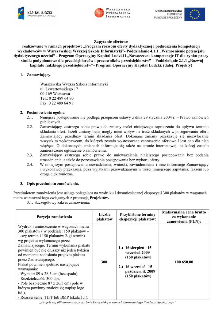 Zapytanie ofertowe realizowane w ramach projektów: „Program rozwoju oferty dydaktycznej i podnoszenia kompetencji wykładowców w Warszawskiej Wyższej Szkole Informatyki”- Poddziałanie 4.1.1 „Wzmocnienie potencjału dydaktycznego uczelni” - Program Operacyjny Kapitał Ludzki i „Nowoczesne kompetencje IT dla rynku pracy - studia podyplomowe dla przedsiębiorców i pracowników przedsiębiorstw” – Poddziałąnie 2.1.1 „Rozwój kapitału ludzkiego przedsiębiorstw"- Program Operacyjny Kapitał Ludzki. (dalej: Projekty) 1. Zamawiający. Warszawska Wyższa Szkoła Informatyki ul. Lewartowskiego 17 00-169 Warszawa Tel.: 0 22 489 64 90 Fax: 0 22 489 64 91 2. Postanowienia ogólne. 2.1. Niniejsze postępowanie nie podlega przepisom ustawy z dnia 29 stycznia 2004 r. – Prawo zamówień publicznych. 2.2. Zamawiający zastrzega sobie prawo do zmiany treści niniejszego zaproszenia do upływu terminu składania ofert. Jeżeli zmiany będą mogły mieć wpływ na treść składanych w postępowaniu ofert, Zamawiający przedłuży termin składania ofert. Dokonane zmiany przekazuje się niezwłocznie wszystkim wykonawcom, do których zostało wystosowane zaproszenie ofertowe i jest ono dla nich wiążące. O dokonanych zmianach informuje się także na stronie internetowej, na której zostało zamieszczone ogłoszenie o zamówieniu. 2.3. Zamawiający zastrzega sobie prawo do unieważnienia niniejszego postępowania bez podania uzasadnienia, a także do pozostawienia postępowania bez wyboru oferty. 2.4. W niniejszym postępowaniu oświadczenia, wnioski, zawiadomienia i inne informacje Zamawiający i wykonawcy przekazują, poza wyjątkami przewidzianymi w treści niniejszego zapytania, faksem lub drogą elektroniczną. 3. Opis przedmiotu zamówienia. Przedmiotem zamówienia jest usługa polegająca na wydruku i dwumiesięcznej ekspozycji 300 plakatów w wagonach metra warszawskiego związanych z promocją Projektów. 3.1. Szczegółowy zakres zamówienia: Pozycja zamówienia Wydruk i umieszczenie w wagonach metra 300 plakatów ( w podziale: 150 plakatów – 1-szy termin i 150 plakatów 2-gi termin) wg projektu wykonanego przez Zamawiającego. Termin wykonania plakatu powinien być nie dłuższy niż jeden tydzień od momentu nadesłania projektu plakatu przez Zamawiającego. Plakat powinien spełniać następujące wymagania: - Wymiar: 89 x 28,5 cm (bez spadu), - Rozdzielczość: 300 dpi, - Pole bezpieczne 87 x 26,5 cm (pole w którym powinny znaleźć się napisy logo itd.), - Rozszerzenie: TIFF lub BMP (skala 1:1), Liczba plakatów Przybliżone terminy ekspozycji plakatów: Maksymalna cena brutto za wykonanie zamówienia (PLN): 1.) 16 sierpień –15 wrzesień 2009 (150 plakatów) 300 100 650,00 2.) 16 wrzesień- 15 październik 2009 (150 plakatów) „Projekt współfinansowany przez Unię Europejską w ramach Europejskiego Funduszu Społecznego” pliki typu TIFF bez kompresji LZW oraz zapisane jako jedna warstwa, - Kolorystyka: CMYK. 3.2. 3.3. Zamawiający nie dopuszcza możliwości składania ofert częściowych ani wariantowych. Projekt plakatu będą przekazane wykonawcy wybranemu do realizacji zamówienia po zawarciu umowy. 4. Warunki wymagane od wykonawców. O udzielenie niniejszego zamówienia mogą ubiegać się wykonawcy, którzy: 1. Są uprawnieni do występowania w obrocie prawnym zgodnie z wymogami ustawowymi, 2. Posiadają niezbędną wiedzę i doświadczenie, potencjał ekonomiczny i techniczny, a także dysponują pracownikami zdolnymi do wykonania zamówienia, 3. Znajdują się sytuacji ekonomicznej i finansowej zapewniającej prawidłowe wykonanie zamówienia. Wykonawcy nie spełniający ww. warunków zostaną wykluczeni z postępowania. 5. Sposób porozumiewania się wykonawców z Zamawiającym. 5.1 Wykonawca może zwrócić się do Zamawiającego w formie elektronicznej o wyjaśnienie treści zapytania ofertowego. Ze strony Zamawiającego uprawnionym do udzielania wyjaśnień jest Pani Agata Sroczyńska adres internetowy: [email protected]. Informacja zostanie udzielona w terminie 2 dni, chyba, że prośba o wyjaśnienie wpłynęła do zleceniodawcy na mniej niż 4 dni przed terminem otwarcia ofert lub pytanie wykonawcy nie ma w ocenie Zamawiającego wpływu na treść oferty. 5.2 Zamawiający jednocześnie przesyła treść wyjaśnienia wszystkim wykonawcom, którym doręczono zapytanie ofertowe, bez ujawniania źródła zapytania, a także umieszcza ją na stronie internetowej zamawiającego. 6. Sposób przygotowania ofert; miejsce i termin ich składania: 6.1. Oferty powinny zostać złożone w języku polskim i w formie pisemnej pod rygorem nieważności według wzoru oferty będącego załącznikiem do niniejszego zapytania w terminie do dnia 4 sierpnia 2009 r. do godz. 14.00. 6.2. Złożone oferty muszą uwzględniać wszystkie zobowiązania, obejmować wszystkie koszty i składniki związane w wykonaniem zamówienia. 6.3. Podana cena będzie obowiązującą przez cały okres ważności oferty. 6.4. Do oferty wykonawcy dołączają następujące dokumenty pod rygorem wykluczenia z postępowania: a) oświadczenie o spełnianiu warunków wzięcia udziału w postępowaniu, o których mowa w pkt. 4 niniejszego zapytania – wzór stanowi załącznik nr 2 do niniejszego zapytania, b) aktualny odpis z właściwego rejestru albo aktualne zaświadczenie o wpisie do ewidencji działalności gospodarczej, jeżeli odrębne przepisy wymagają wpisu do rejestru lub zgłoszenia do ewidencji działalności gospodarczej, wystawiony nie wcześniej niż 6 miesięcy przed upływem terminu składania ofert, c) pełnomocnictwo do złożenia oferty w niniejszym postępowaniu, jeśli wykonawca posługuje się w celu złożenia oferty pełnomocnikiem, 6.5. Dokumenty składa się w oryginale albo kopii poświadczonej za zgodność z oryginałem przez wykonawcę z wyjątkiem pełnomocnictwa, które składa się w oryginale albo kopii poświadczonej notarialnie. 6.6. Zamawiający