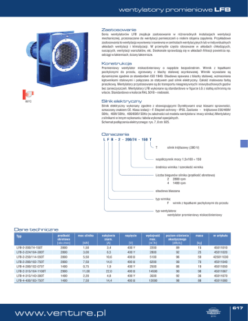 wentylatory promieniowe LFB Zastosowanie Seria wentylatorów LFB znajduje zastosowanie w różnorodnych instalacjach wentylacji mechanicznej, przeznaczone do wentylacji pomieszczeń o niskim stopniu zapylenia. Przykładowe zastosowania to wentylacja wywiewna i nawiewna w centralach wentylacyjnych lub w indywidualnych układach wentylacji i klimatyzacji. W przemyśle często stosowane w układach chłodzących, suszących, wentylacji warsztatów, etc. Doskonale sprawdzają się w układach filtracji powietrza np. odciągi w lakierniach, ściany lakiernicze. Konstrukcja Promieniowy wentylator niskociśnieniowy o napędzie bezpośrednim. Wirnik z łopatkami pochylonymi do przodu, zgrzewany z blachy stalowej ocynkowanej. Wirniki wyważane są dynamicznie zgodnie ze standardem ISO 1940. Obudowa spawana z blachy stalowej, wzmocniona kątownikami stalowymi i połączona ze statywem pod silnik elektryczny. Całość malowana farbą proszkową. Wentylatory przystosowane są do transportu nieagresywnych i niewybuchowych gazów bez zanieczyszczeń. Wentylatory LFB wykonane są standardowo w figurze LG z siatką ochronną na wlocie. Standardowo w kolorze RAL 5010 – niebieski. Silnik elektryczny 80oC Silnik elektryczny wykonany zgodnie z obowiązującymi Dyrektywami oraz klasami sprawności, oznaczony znakiem CE. Klasa izolacji – F. Stopień ochrony - IP55. Zasilanie - trójfazowe 230/400V 50Hz, 400V 50Hz, 400/690V 50Hz (w zależności od modelu wentylatora i mocy silnika).Wentylatory z silnikami w innym wykonaniu: tabela wykonań specjalnych. Schemat podłączenia elektrycznego: rys. 7, 8 str. 925. Oznaczenia L F B - 2 - 200/74 - 150 T T silnik trójfazowy (380 V) współczynnik mocy 1,5x100 = 150 średnica wirnika / szerokość wirnika Liczba biegunów silnika (prędkość obrotowa) 2 2800 rpm 4 1400 rpm obudowa blaszana typ wirnika: F wirnik z łopatkami pochylonymi do przodu typ wentylatora: wentylator promieniowy niskociśnieniowy Dane techniczne Typ prędkość obrotowa [obr./min] moc silnika [kW] natężenie znam. [A] napięcie [V] wydajność max. [m3/h] poziom ciśnienia akustycznego [dB(A)] masa nr artykułu [kg] LFB-2-200/74-150T 2800 1,50 3,4 400 Y 2200 89 15 LFB-2-224/104-300T 2800 3,00 6,5 400 Y 2800 92 25 45011020 LFB-2-250/114-550T 2800 5,50 10,6 400 5100 96 59 425011030 LFB-2-280/102-750T 2800 7,50 14,0 400 6200 99 70 45011040 LFB-4-280/102-075T 1400 0,75 1,9 400 Y 2500 86 19 45011050 LFB-2-315/104-1100T 2900 11,00 22,0 400 14500 90 98 45011067 LFB-4-315/143-300T 1400 2,20 4,8 400 Y 3500 92 36 45011070 LFB-4-400/183-750T 1400 7,50 14,4 400 12000 98 88 45011080 www.venture.pl 45011010 617 wentylatory promieniowe LFB Charakterystyki pracy Wymiary [mm] LFB-2-200/74-150 D pst [Pa] 1600 1,5 kW 383 335 1200 O 167 800 138 600 168 394 1000 227 Ciśnienie statyczne 1400 25 141 200 15 400 128 178 0 0 500 1000 1500 2000 2500 3000 3500 [m3/h] Wydajność LFB-2-224/104-300 Dpst [Pa] 451 335 O 187 kW 25 141 168 15 138 227 394 1000 148 198 1000 2000 3000 4000 [m3/h] LFB-2-250/114-550 D pst [Pa] 2500 5,5 kW ~113 ~414 191 500 175 410 0 0 1000 2000 3000 4000 Wydajność 5000 6000 194 1000 224 153 478 1500 2 65 Ciśnienie statyczne 2000 225 7000 [m3/h] 618 Venture Industries Sp. z o.o. ul. Mokra 27, 05-092 Łomianki - Kiełpin tel. +48 22 751 95 50, 751 20 31 fax +48 22 751 22 59, 751 12 02 e-mail: [email protected] wentylatory promieniowe LFB Charakterystyki pracy Wymiary [mm] LFB-2-280/102-750 Dpst [Pa] 563 415 O 228 26 182 182 192 15 160 261 468 kW 235 3 [m /h] LFB-2-315/104-1100 Dpst [Pa] 5000 600 504 4000 O257 11 kW 291 1000 170 45 255 2000 25 205 396 610 3000 260 2000 4000 6000 8000 10000 12000 14000 [m3/h] LFB-4-280/102-075 Dpst [Pa] 700 437 410 600 O 236 0,75 kW 300 160 190 470 400 262 Ciśnienie statyczne 500 180 100 25 182 15 200 232 0 0 500 1000 1500 Wydajność 2000 2500 3000 [m3/h] www.venture.pl 619 wentylatory promieniowe LFB Charakterystyki pracy Wymiary [mm] LFB-4-315/143-220 Dpst [Pa] 1000 900 575 504 800 O 251 500 240 400 280 600 600 356 Ciśnienie statyczne 2,2 kW 700 200 27 213 230 100 18,5 300 284 0 0 1000 2000 3000 4000 5000 6000 7000 8000 [m3/h] Wydajność LFB-4-400/183-750 Dpst [Pa] 1600 739 649 1400 O 334 800 276 600 306 764 1000 440 Ciśnienie statyczne 1200 270 200 25 289 15 400 339 0 0 2000 4000 6000 Wydajność 8000 10000 12000 [m3/h] 620 Venture Industries Sp. z o.o. ul. Mokra 27, 05-092 Łomianki - Kiełpin tel. +48 22 751 95 50, 751 20 31 fax +48 22 751 22 59, 751 12 02 e-mail: [email protected]