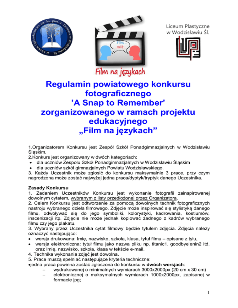Regulamin powiatowego konkursu fotograficznego ’A Snap to Remember’ zorganizowanego w ramach projektu edukacyjnego „Film na językach” 1.Organizatorem Konkursu jest Zespół Szkół Ponadgimnazjalnych w Wodzisławiu Śląskim. 2.Konkurs jest organizowany w dwóch kategoriach:  dla uczniów Zespołu Szkół Ponadgimnazjalnych w Wodzisławiu Śląskim  dla uczniów szkół gimnazjalnych Powiatu Wodzisławskiego. 3. Każdy Uczestnik może zgłosić do konkursu maksymalnie 3 prace, przy czym nagrodzona może zostać najwyżej jedna praca/dyptyk/tryptyk danego Uczestnika. Zasady Konkursu 1. Zadaniem Uczestników Konkursu jest wykonanie fotografii zainspirowanej dowolnym cytatem, wybranym z listy przedłożonej przez Organizatora. 2. Celem Konkursu jest odtworzenie za pomocą dowolnych technik fotograficznych nastroju wybranego dzieła filmowego. Zdjęcie może inspirować się stylistyką danego filmu, odwoływać się do jego symboliki, kolorystyki, kadrowania, kostiumów, inscenizacji itp. Zdjęcie nie może jednak kopiować żadnego z kadrów wybranego filmu czy jego plakatu. 3. Wybrany przez Uczestnika cytat filmowy będzie tytułem zdjęcia. Zdjęcia należy oznaczyć następująco:  wersja drukowana: Imię, nazwisko, szkoła, klasa, tytuł filmu – opisane z tyłu,  wersja elektroniczna: tytuł filmu jako nazwa pliku np. titanic1, goodbyelenin2 itd. oraz Imię, nazwisko, szkoła, klasa w tekście e-mail. 4. Technika wykonania zdjęć jest dowolna. 5. Prace muszą spełniać następujące kryteria techniczne: jedna praca powinna zostać zgłoszona do konkursu w dwóch wersjach: – wydrukowanej o minimalnych wymiarach 3000x2000px (20 cm x 30 cm) – elektronicznej o maksymalnych wymiarach 1000x2000px, zapisanej w formacie jpg; 1 Nadsyłanie prac 1. Wydrukowane prace konkursowe należy składać do dnia 16.02.2015 u p. Anety Buczak lub wysyłać/dostarczyć pod adres: Zespół Szkół Ponadgimnazjalnych ul. Wyszyńskiego 41 44-300 Wodzisław Śląski, a ich elektroniczne wersje nadsyłać w załączniku na adres [email protected]. 2. Uczestnik drukuje pracę/prace na własny koszt, dlatego wydruk/i stanowią własność Uczestnika, a po zakończeniu konkursu i zamknięciu wystawy pokonkursowej zostaną przez niego odebrane. 3. Oceny nadesłanych prac dokona Jury powołane przez Dyrekcję ZSP. 4. Jury zastrzega sobie prawo do dyskwalifikacji zdjęć nie realizujących tematu Konkursu lub nie spełniających innych zasad Konkursu. 5. Z udziału w Konkursie mogą zostać wykluczone prace zdradzające wady formalne (słaba jakość zdjęć, zbyt mała rozdzielczość itp.). Odrzuceniu podlegają zdjęcia, na których znajdują się znaki, cyfry (daty, znaki wodne, podpisy, ramki), a także kopiujące cudzą pracę. 6. Wyniki Konkursu zostaną ogłoszone w czasie podsumowania projektu Film na językach, które będzie miało miejsce 25.02.2015 w siedzibie ZSP w Wodzisławiu Śląskim. 7. Uczestnik Konkursu z chwilą nadesłania prac na Konkurs oświadcza, że:  akceptuje niniejszy Regulamin;  jest autorem zdjęć oraz posiada zgodę osób biorących udział przy powstawaniu pracy. 8. Uczestnik Konkursu wyraża zgodę na:  przetwarzanie swoich danych osobowych na potrzeby konkursu  publikację swojej pracy/swoich prac na stronie internetowej Szkoły w celu promocji konkursu/projektu oraz w celach ogłoszenia wyników konkursu. Lista cytatów: 1. Les temps sont durs pour les reveurs Czasy są ciężkie dla marzycieli („Amelia”) 2. ¿Qué quieres hacer con tu vida? Libertad Czego chcesz od życia? Być wolnym. (“Desperado 2”) 3. I'm the king of the world! Jestem panem świata! (“Titanic”) 4. Nach dem Spiel ist vor dem Spiel. Koniec gry to początek gry („Biegnij Lola, biegnij”) 5. Die Zukunft lag ungewiss in unseren Händen. ungewiss und verheissungsvoll. Przyszłość leżała w naszych rękach, niepewna i obiecująca. („Goodbye, Lenin”) 2 Wodzisław Śl., 20.01.2015 r. 3