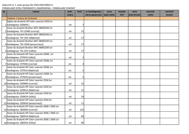 Załacznik nr 1, znak sprawy DG-2501/4367/802/11 FORMULARZ OPISU PRZEDMIOTU ZAMÓWIENIA - FORMULARZ CENOWY lp. nazwa jedn. ilość nr katalogowy/ cena miary okres gwarancji jedn.netto Zadanie 1 tonery do drukarek bęben do drukarki HP Color LaserJet 2550 (nr szt 7 1 katalogowy: Q3964A ) toner do drukarki Brother MFC-9840CDW (nr szt 21 2 katalogowy: TN-135BK (czarny)) toner do drukarki Brother MFC-9840CDW (nr szt 17 3 katalogowy: TN-135C (błękitny)) toner do drukarki Brother MFC-9840CDW (nr szt 17 4 katalogowy: TN-135M (purpurowy)) toner do drukarki Brother MFC-9840CDW (nr szt 17 5 katalogowy: TN-135Y (żółty)) toner do drukarki HP Color LaserJet 2500L (nr szt 2 6 katalogowy: C9702A (żółty)) toner do drukarki HP Color LaserJet 2500L (nr szt. 2 7 katalogowy: C9700A (czarny)) toner do drukarki HP Color LaserJet 2500L (nr szt. 2 8 katalogowy: C9701A (błękitny)) toner do drukarki HP Color LaserJet 2500L (nr szt. 2 9 katalogowy: C9703A (purpurowy)) toner do drukarki HP Color LaserJet 2550 (nr szt 15 10 katalogowy: Q3960A (czarny)) toner do drukarki HP Color LaserJet 2550 (nr szt 11 11 katalogowy: Q3961A (błękitny)) toner do drukarki HP Color LaserJet 2550 (nr szt 10 12 katalogowy: Q3962A (żółty)) toner do drukarki HP Color LaserJet 2550 (nr szt 11 13 katalogowy: Q3963A (purpurowy)) toner do drukarki HP Color LaserJet 2600 / 2605 (nr szt 125 14 katalogowy: Q6000A (czarny)) toner do drukarki HP Color LaserJet 2600 / 2605 (nr szt 83 15 katalogowy: Q6001A (błękitny)) toner do drukarki HP Color LaserJet 2600 / 2605 (nr szt 85 16 katalogowy: Q6002A (żółty)) stawka VAT cena jedn.brutto wartość netto wartość brutto 17 18 19 20 21 22 23 24 25 26 27 28 29 30 31 32 33 toner do drukarki HP Color LaserJet 2600 / 2605 (nr katalogowy: Q6003A (purpurowy)) toner do drukarki HP Color LaserJet 3550 (nr katalogowy: Q2670A (czarny)) toner do drukarki HP Color LaserJet 3550 (nr katalogowy: Q2671A (błękitny)) toner do drukarki HP Color LaserJet 3550 (nr katalogowy: Q2672A (żółty)) toner do drukarki HP Color LaserJet 3550 (nr katalogowy: Q2673A (purpurowy)) toner do drukarki HP Color LaserJet 3600 (nr katalogowy: Q6470A (czarny)) toner do drukarki HP Color LaserJet 3600 (nr katalogowy: Q6471A (błękitny)) toner do drukarki HP Color LaserJet 3600 (nr katalogowy: Q6472A (żółty)) toner do drukarki HP Color LaserJet 3600 (nr katalogowy: Q6473A (purpurowy)) toner do drukarki HP Color LaserJet 8500 (nr katalogowy: C4149A (czarny)) toner do drukarki HP Color LaserJet 8500 (nr katalogowy: C4150A (błękitny)) toner do drukarki HP Color LaserJet 8500 (nr katalogowy: C4151A (purpurowy)) toner do drukarki HP Color LaserJet 8500 (nr katalogowy: C4152A (żółty)) toner do drukarki HP Color LaserJet CM1312nfi MFP / CP2025N / CM2320fxi MFP (nr katalogowy: HP CC530A (czarny)) toner do drukarki HP Color LaserJet CM1312nfi MFP / CP2025N / CM2320fxi MFP (nr katalogowy: CC531A (błękitny)) toner do drukarki HP Color LaserJet CM1312nfi MFP / CP2025N / CM2320fxi MFP (nr katalogowy: HP CC532A (żółty)) toner do drukarki HP Color LaserJet CM1312nfi MFP / CP2025N / CM2320fxi MFP (nr katalogowy: HP CC533A (purpurowy)) szt 84 szt 3 szt 2 szt 2 szt 2 szt 22 szt 14 szt 14 szt 13 szt 2 szt 2 szt 2 szt 2 szt 37 szt 26 szt 26 szt 26 34 35 36 37 38 39 40 41 42 43 44 45 46 47 48 49 50 51 52 toner do drukarki HP LaserJet 1000 / 1005 (nr katalogowy: C7115A (czarny)) toner do drukarki HP LaserJet 1015 / 1018 / 1020 (nr katalogowy: Q2612A (czarny)) toner do drukarki HP LaserJet 1100 / 1100A (nr katalogowy: C4092A (czarny)) toner do drukarki HP LaserJet 1150 (nr katalogowy: Q2624A (czarny)) toner do drukarki Hp LaserJet 1200 (nr katalogowy: C7115X (czarny)) toner do drukarki HP LaserJet 1300 (nr katalogowy: Q2613X (czarny)) toner do drukarki HP LaserJet 1320 (nr katalogowy: Q5949X (czarny)) toner do drukarki HP LaserJet 2100M (nr katalogowy: C4096A (czarny)) toner do drukarki HP LaserJet 2300 (nr katalogowy: Q2610A (czarny)) toner do drukarki HP LaserJet 4L / 4P (nr katalogowy: 92274A (czarny)) toner do drukarki HP LaserJet 5 / 5M (nr katalogowy: 92298X (czarny)) toner do drukarki HP LaserJet 5100 (nr katalogowy: C4129X (czarny)) toner do drukarki HP LaserJet 5200n (nr katalogowy: Q7516A (czarny)) toner do drukarki HP LaserJet 5P / MP, 6P / MP (nr katalogowy: C3903A (czarny)) toner do drukarki HP LaserJet CP1515 (nr katalogowy: HP CB540A (czarny)) toner do drukarki HP LaserJet CP1515 (nr katalogowy: HP CB541A (błękitny)) toner do drukarki HP LaserJet CP1515 (nr katalogowy: HP CB542A (żółty)) toner do drukarki HP LaserJet CP1515 (nr katalogowy: HP CB543A (purpurowy)) toner do drukarki HP LaserJet P2014 / P2015 (nr katalogowy: Q7553X (czarny)) szt 17 szt 36 szt 4 szt 6 szt 34 szt 14 szt 40 szt. 2 szt 13 szt 2 szt 6 szt 8 szt 2 szt 2 szt 31 szt 21 szt 21 szt 21 szt 56 53 54 55 56 57 58 59 60 61 62 63 64 65 66 67 68 69 70 71 toner do drukarki HP LaserJet P2055 (nr katalogowy: CE505X (czarny)) toner do drukarki LaserJet 2420 (nr katalogowy: Q6511X) toner do drukarki Lexmark C500 (nr katalogowy: C500S2KG (czarny)) toner do drukarki Lexmark C500 (nr katalogowy: C500S2CG (błękitny)) toner do drukarki Lexmark C500 (nr katalogowy: C500S2MG (purpurowy)) toner do drukarki Lexmark C500 (nr katalogowy: C500S2YG (żółty)) toner do drukarki Lexmark C510 (nr katalogowy: 20K1403 (czarny)) toner do drukarki Lexmark C510 (nr katalogowy: 20K1400 (błękitny)) toner do drukarki Lexmark C510 (nr katalogowy: 20K1401 (purpurowy)) toner do drukarki Lexmark C510 (nr katalogowy: 20K1402 (żółty)) toner do drukarki Lexmark C770 (nr katalogowy: C7700KH (czarny)) toner do drukarki Lexmark C770 (nr katalogowy: C7700CH (błękitny)) toner do drukarki Lexmark C770 (nr katalogowy: C7700YH (żółty)) toner do drukarki Lexmark C770 (nr katalogowy: C7700MH (purpurowy)) toner do drukarki Lexmark E322 (nr katalogowy: 08A0478 (czarny)) toner do drukarki Panasonic DP-2500 (nr katalogowy: toner napełniany w Merkator - Lublin) toner do drukarki Ricoh