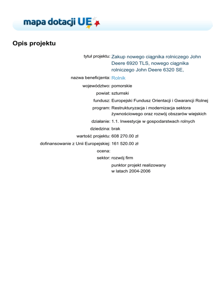 Opis projektu tytuł projektu: Zakup nowego ciągnika rolniczego John Deere 6920 TLS, nowego ciągnika rolniczego John Deere 6320 SE, nazwa beneficjenta: Rolnik województwo: pomorskie powiat: sztumski fundusz: Europejski Fundusz Orientacji i Gwarancji Rolnej program: Restrukturyzacja i modernizacja sektora żywnościowego oraz rozwój obszarów wiejskich działanie: 1.1. Inwestycje w gospodarstwach rolnych dziedzina: brak wartość projektu: 608 270.00 zł dofinansowanie z Unii Europejskiej: 161 520.00 zł ocena: sektor: rozwój firm punktor projekt realizowany w latach 2004-2006