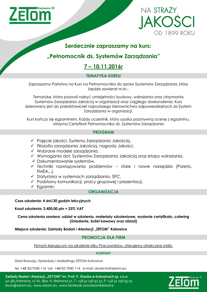 Serdecznie zapraszamy na kurs: „Pełnomocnik ds. Systemów Zarządzania” 7 – 10.11.2016r TEMATYKA KURSU Zapraszamy Państwa na Kurs na Pełnomocnika do spraw Systemów Zarządzania, który będzie zawierał m.in.: Tematykę, która pozwoli nabyć umiejętności budowy, wdrażania oraz utrzymania Systemów Zarządzania Jakością w organizacji oraz ciągłego doskonalenia. Kurs skierowany jest do przedstawicieli najwyższego kierownictwa odpowiedzialnych za System Zarządzania w organizacji. Kurs kończy się egzaminem. Każdy uczestnik, który uzyska pozytywną ocenę z egzaminu, otrzyma Certyfikat Pełnomocnika ds. Systemów Zarządzania PROGRAM Pojęcie jakości, Systemy Zarządzania Jakością, Filozofia zarządzania Jakością, nagrody Jakości, Wybrane modele zarządzania, Wymagania dot. Systemów Zarządzania Jakością oraz etapy wdrażania, Dokumentowanie systemów, Techniki rozwiązywania problemów – stare i nowe narzędzia (Pareto, FMEA,..), Statystyka w systemach zarządzania, SPC, Podstawy komunikacji, pracy grupowej i prezentacji, Egzamin. ORGANIZACJA Czas szkolenia: 4 dni/30 godzin lekcyjnych Koszt szkolenia: 2.400,00 pln + 23% VAT Cena szkolenia zawiera: udział w szkoleniu, materiały szkoleniowe, wydanie certyfikatu, catering (śniadanie, bufet kawowy oraz obiad) Miejsce szkolenia: Zakłady Badań i Atestacji „ZETOM” Katowice PROMOCJA DLA FIRM Firmom kierującym na szkolenie kilku Pracowników, oferujemy atrakcyjne zniżki. KONTAKT Dział Rozwoju, Sprzedaży i Marketingu ZETOM Katowice tel. +48 32/7040 116 lub +48/32 7040 114, e-mail: [email protected] Zakłady Badań i Atestacji „ZETOM” im. Prof. F. Stauba w Katowicach sp. z o.o. 40-384 Katowice, ul. Ks. Bpa. H. Bednorza 17, T: +48 32 256 92 57, F: +48 32 256 93 05 [email protected], www.zetom.eu, www.facebook.com/zetomkatowice
