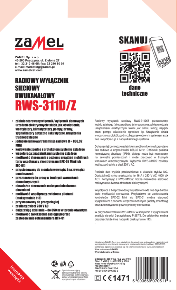 SKANUJ ZAMEL Sp. z o.o. 43-200 Pszczyna, ul. Zielona 27 tel.: 32 210 46 65; fax: 32 210 80 04 e-mail: [email protected] www.zamelcet.com RADIOWY WYŁĄCZNIK SIECIOWY DWUKANAŁOWY dane techniczne RWS-311D/Z • zdalnie sterowany włącznik/wyłącznik domowych urządzeń elektrycznych takich jak: oświetlenie, wentylatory, klimatyzatory, pompy, bramy, sygnalizatory optyczne i akustyczne, urządzenia trudnodostępne • jednokierunkowa transmisja radiowa (f = 868,32 MHz) • kodowanie zgodne z protokołem systemu exta free • współpraca z nadajnikami systemu exta free • możliwość sterowania z poziomu urządzeń mobilnych (przy współpracy z kontrolerami EFC-02 Mini lub EFC-01) • przystosowany do montażu wewnątrz i na zewnątrz pomieszczeń • przeznaczony do pracy w trudnych warunkach atmosferycznych • niezależne sterowanie maksymalnie dwoma obwodami • możliwość współpracy z wieloma pilotami (maksymalnie 113) • przystosowany do pracy ciągłej • zasilany z sieci 230 V AC • duży zasięg działania – do 350 m w terenie otwartym • możliwość zwiększenia zasięgu poprzez zastosowanie retransmitera RTN-01 Radiowy wyłącznik sieciowy RWS-311D/Z przeznaczony jest do zdalnego ( drogą radiową ) sterowania wszelkiego rodzaju urządzeniami elektrycznymi takimi jak: silniki, lampy, napędy bram, pompy, oświetlenie ogrodowe itp. Urządzenie działa w oparciu o protokół zgodny z bezprzewodowym systemem exta free i współpracuje z nadajnikami tego systemu. Do transmisji pomiędzy nadajnikiem a odbiornikiem wykorzystano fale radiowe o częstotliwości 868,32 MHz. Odbiornik posiada hermetyczną obudowę (IP56), dlatego może być montowany na zewnątrz pomieszczeń i może pracować w trudnych warunkach atmosferycznych. Wyłącznik RWS-311D/Z zasilany jest bezpośrednio z sieci 230 V AC. Posiada dwa wyjścia przekaźnikowe o układzie styków NO. Obciążalność styku przekaźnika to 16 A / 250 V AC 4000 VA AC1. Korzystając z RWS-311D/Z można niezależnie sterować maksymalnie dwoma obwodami elektrycznymi. Współpraca z bezprzewodowym systemem exta free daje bardzo duże możliwości sterowania. Przykładowo po zastosowaniu kontrolerów EFC-02 Mini lub EFC-01 można sterować wyłącznikiem z poziomu urządzeń mobilnych (tablety,smartfony) oraz automatyzować pewne procesy sterowania. W przypadku zestawu RWS-311D/Z w komplecie z wyłącznikiem znajduje się pilot 2-przyciskowy P-257/2. Do odbiornika, można przypisać także inne nadajniki (maksymalnie 113). . Niniejszym ZAMEL Sp. z o.o. oświadcza, że urządzenie jest zgodne z zasadniczymi wymaganiami oraz innymi stosownymi postanowieniami dyrektywy 1999/5/WE. Deklaracja zgodności znajduje się na stronie internetowej www.zamelcet.com Wzór zastrzeżony © ZAMEL Wyprodukowano w Polsce ja kc rz ru ąt st n in ew w Symbol oznaczający selektywne zbieranie sprzętu elektrycznego elektronicznego. Zakaz umieszczania zużytego sprzętu z innymi odpadami. Odbiornik: 230 V AC / 3,2 VA; IP56 Pilot: 3 VDC ( 1 x CR2032 ); IP20 Masa netto wyrobu: 0,435 kg PN-EN 60950-1 PN-ETSI-EN 300 220-1 PN-ETSI-EN 300 220-2 1471 5 903669 070511 WY all poza SRP-01 all poza SRP-01 20 ącz K-02 K-04 P-02 56 tylko wyłącz SRP-01 SRP-02 SRP-03 RDP-01 RNK-02 RNK-04 RNP-02 P-256 P-257 SRP-01 all SRP-02 SRP-03 włącz/wyłącz jednym klawiszem 50 P-01 ROP-01 ROP-02 ROM-01 ROM-10 RWG-01 RWL-01 SRP-01 SRP-02 SRP-03 RNK-02 RNK-04 RNP-02 włącz - trzymajP-256włącz, wyłącz puść - wyłączP-257automatyczne po czasie Urządzenia firmy ZAMEL cechowane tym znakiem mogą współprcować ze sobą. 20 all RDP-01 50 ROP-01 ROP-02 ROM-01 ROM-10 RWG-01 RWL-01 Tryby pracy: tylko włącz tylko wyłącz włącz/wyłącz jednym klawiszem włącz - trzymaj puść - wyłącz włącz, wyłącz automatyczne po czasie 58 58 SYSTEM BEZPRZEWODOWEGO STEROWANIA EXTA FREE ŁĄC RAD DW ZNI IOW UK K SI Y RW AN EC S-3 AŁO IOW 11D WY Y /Z RADIOWY WYŁĄCZNIK SIECIOWY DWUKANAŁOWY RWS-311D/Z Dane techniczne: ODBIORNIK Znamionowe napięcie zasilania: Znamionowy pobór mocy: Układ styków: Obciążalność przekaźnika: Transmisja: Sposób transmisji: Kodowanie: Zasięg działania: Zwiększenie zasięgu: Ilość wyjść: Ilość pilotów w komplecie: Maksymalna ilość pilotów: Tryby pracy: Regulacja czasu dla t.czasowego: Sposób montażu: Stopień ochrony obudowy: Temperaturowy zakres pracy: Klasa ochronności: Wymiary: Gniazdo antenowe: NADAJNIK Znamionowe napięcie zasilania: Typ baterii: Transmisja: Sposób transmisji: Kodowanie: Zasięg działania: Zwiększenie zasięgu: Ilość kanałów: Sygnalizacja nadawania: Sygnalizacja rozładowania baterii: Stopień ochrony obudowy: Temperaturowy zakres pracy: Klasa ochronności: Wymiary: 230 V AC / 50 Hz 3,2 VA / 2,4 W 2 x NO - beznapięciowe 16 A / 250 V AC 4000 VA AC1 radiowa 868,32 MHz jednokierunkowa transmisja z adresacją do 350 m w terenie otwartym zgodnie z Tab.1 tak – retransmiter RTN-01 2 1 113 bistabilny, czasowy 1 s – 4,5 min natynkowy IP56 -20 do +50ºC II 127 x 120 x 60 BNC50 3 VDC CR2032 radiowa 868,32 MHz jednokierunkowa transmisja z adresacją do 300 m w terenie otwartym tak – retransmiter RTN-01 2 dioda LED - czerwona tak IP20 -10 do +55ºC III 74 x 33 x 11,5 mm Tab.1 WSPÓŁPRACA I ZASIĘG DZIAŁANIA: Typ nadajnika Zasięg* przy współpracy z RWS-311D/Z RNK-02 300 m RNK-04 300 m P-256/8 350 m P-257/2 300 m P-257/4 300 m RNM-10 350 m RNP-01 250 m RNP-02 250 m RNL-01 300 m RTI-01 250 m RXM-01 300 m RND-01 250 m EFC-01 300 m EFC-02 Mini 300 m UWAGA! Podany zasięg działania dotyczy przestrzeni otwartej, czyli warunków idealnych, bez przeszkód. Jeżeli pomiędzy nadajnikiem a odbiornikiem znajdują się przeszkody, należy przewidzieć zmniejszenie zasięgu działania odpowiednio dla: cegła od 10 do 40%, drewna i gipsu od 5 do 20%, betonu zbrojonego od 40 do 80%, metalu od 90 do 100%, szkła od 10 do 20%. Negatywny wpływ na zasięg działania mają też napowietrzne i podziemne linie ene