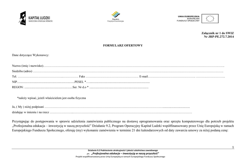 Załącznik nr 1 do SWIZ Nr JRP-PE.272.7.2014 FORMULARZ OFERTOWY Dane dotyczące Wykonawcy: Nazwa (imię i nazwisko)…………………………………………………………………………………………………………………………………………………………. Siedziba (adres) …………………………………………………………………………………………………………………………………………………………………. Tel. ……………………………………..…………… Faks …………………………………………… E-mail………………………………………. ………………………. NIP..........................................................................PESEL *….............................................................................. REGON: ..............................................................Ser. Nr d.o * ............................................................................ *należy wpisać, jeżeli właścicielem jest osoba fizyczna Ja, ( My ) niżej podpisani ……………………………………………………………………………………………………................................... działając w imieniu i na rzecz …………………..………………….………………………………………………………………………………… Przystępując do postępowania w sprawie udzielenia zamówienia publicznego na dostawę oprogramowania oraz sprzętu komputerowego dla potrzeb projektu „Profesjonalna edukacja – inwestycją w naszą przyszłość” Działanie 9.2, Program Operacyjny Kapitał Ludzki współfinansowany przez Unię Europejską w ramach Europejskiego Funduszu Społecznego, oferuję (my) wykonanie zamówienia w terminie 21 dni kalendarzowych od daty zawarcia umowy za niżej podaną cenę: 1 Działanie 9.2 Podniesienie atrakcyjności i jakości szkolnictwa zawodowego pn. „Profesjonalna edukacja – inwestycją w naszą przyszłość” Projekt współfinansowany przez Unię Europejską w ramach Europejskiego Funduszu Społecznego L.p. A 1. 2. 3. Nazwa towaru Jednostka miary Ilość zamówienia Cena jednostkowa brutto Ogólna cena brutto B C D E F (DxE) szt. 1 Szafa dystrybucyjna 19” z wyposażeniem, połączona korytkową instalacją okablowania strukturalnego z czterema punktami elektryczno-logicznymi- pracowni. Szafa dystrybucyjna stojąca, 19” min. 20U. Patch panel min.16 portowy ekranowany min. kat 6 IDC110. Półka 350mm 2U na dodatkowe urządzenie. Śruby M6 4szt. x 10 Wentylator 230V, rozmiar 120x120mm. Zaoferowana szafa dystrybucyjna 19” z wyposażeniem powinna umożliwić umieszczenie serwera stelażowego z kontrolerem pamięci masowej (pozycja 2). Serwer stelażowy z kontrolerem pamięci masowej- pracownia lokalnych sieci komputerowych. Serwer stelażowy z kontrolerem pamięci masowej . Procesor: min. 8MB Cache ,6500 pkt CPU benchmark high_end CPU's Maksymalna ilość procesorów min. 1 szt. Obsługiwane typy pamięci DDR3 1600 ECC Pamięć zainstalowana (pojemność) min. 4 GB Ilość wolnych gniazd pamięci min. 3 szt. Napęd optyczny DVD-RW Dyski 2 x 1TB 6G SATA 7.2k 3.5in SC MDL HDD Maksymalna ilość dysków min. 4 szt. Wolne alokacje 2 wolne kieszenie na dyski LFF hot swap (3,5") Sloty rozszerzeń min. 1 x PCIe 3.0 16x (Half-length, full-height), min. 1 x PCIe 2.0 4x - (Low profile) Karta graficzna obsługująca rozdzielczości 1280 x 1024 (32 bpp), 1920 x 1200 (16 bpp) Karta sieciowa Ethernet 1Gb 2-port Adapter Kontroler dysków Dynamic Smart Array Controller (RAID 1/0/10) Obudowa Rack 1U Zasilacz (rodzaj) Wbudowany. Zasilacz awaryjny z zasilaniem - pracownia lokalnych sieci komputerowych. Rodzaj Rack 19" Moc skuteczna min. 1200 Kształt przebiegu sinus Sinusoida pełna Topologia Line Interactive ( VI ) Typ akumulatora min. 4x 12V9Ah Parametry techniczne, producent, model oferowanego towaru w przypadku gdy zaoferowane produkty są równoważne. Nie dotyczy procesorów, które należy zawsze wskazać podając producenta i model. Procesor: szt. 1 szt. 1 2 Działanie 9.2 Podniesienie atrakcyjności i jakości szkolnictwa zawodowego pn. „Profesjonalna edukacja – inwestycją w naszą przyszłość” Projekt współfinansowany przez Unię Europejską w ramach Europejskiego Funduszu Społecznego 4. 5. 6. Czas podtrzymania przy 50% obciążeniu min. 19 Czas podtrzymania przy 100% obciążeniu min. 7 Czas przełączania 3 Sygnalizacja pracy min. diody LED Zabezpieczenia Filtr telekomunikacyjny oraz LAN Interfejs RS 232, USB, sieciowa karta zarządzająca SNMP/HTTP - opcja Ilość gniazd wyjściowych 6 Wysokość w szafie przemysłowej 3U Pełne oprogramowanie monitorujace gwarantujace pelna kontrole stanowisk komputerowych. Oprogramowanie wspólpracuje z systemami XP, 2000, 2003 LINUX, UNIX, Novell 5.x, 6.x. Napęd taśmowy do archiwizacji - pracownia lokalnych sieci komputerowych. Napęd taśmowy do archiwizacji z zestawem min. 5 taśm. Dołączone oprogramowanie: TAK Systemy operacyjne (zgodność) MW 2003 Server Zaproponowany napęd taśmowy do archiwizacji powinien być kompatybilny z serwerem stelażowym z pozycji 2. Przełącznik zarządzany z obsługa lokalnych Sieci wirtualnych i portami zasilania przez Ethernet - pracownia lokalnych sieci komputerowych. Przełącznik zarządzany z obsługą lokalnych sieci wirtualnych i portami zasilania przez Ethernet. Switch Zarządzalny 24 portowy min.10/100 Mbit z obsługą PoE i SFP. Ruter z modemem xDSL, z portem Ethernet i obsługa protokołu PPP - pracownia lokalnych sieci komputerowych. ROUTER Podstawa systemowa: LINUX Przeznaczenie: xDSL (sieci lokalne; telewizja kablowa) Moc nadajnika: min. 18 dBm Antena: Zewnętrzna Interfejs WAN: min. 1x 10/100BaseTX (RJ45) Interfejs LAN: min. 4x 10/100BaseTX (RJ45) Obsługa sieci bezprzewodowej: tak Funkcje: UPnP DDNS VPN Pass-Through DMZ VPN IPSec Zabezpieczenia: 64/128-bit WEP Filtrowa
