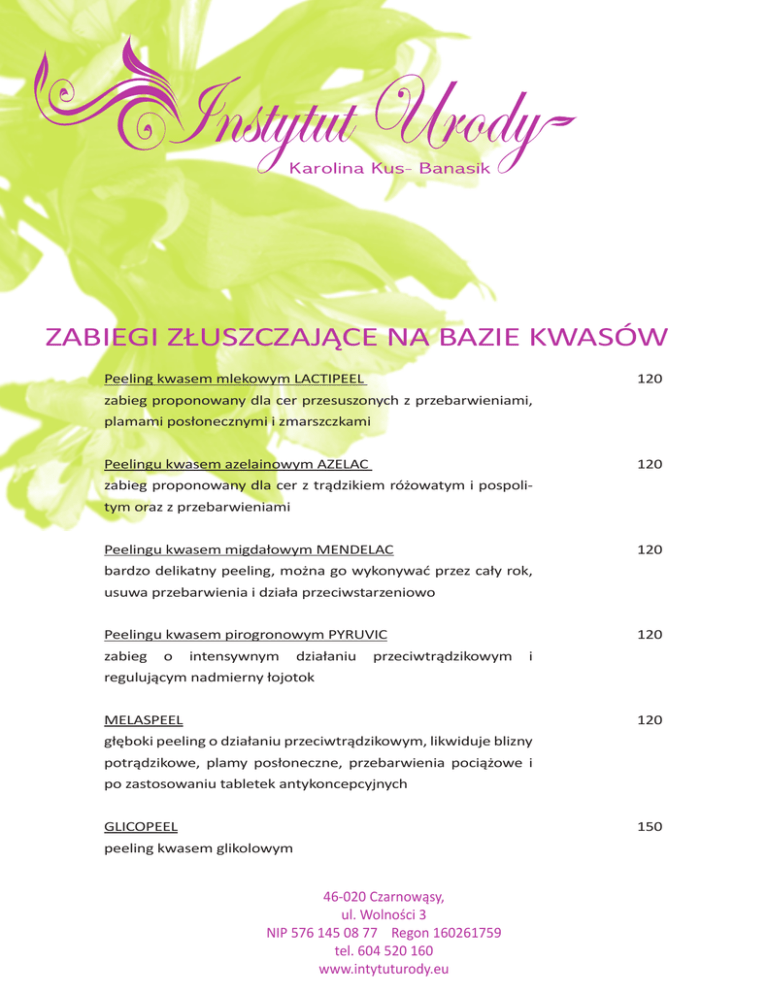 ZABIEGI ZŁUSZCZAJĄCE NA BAZIE KWASÓW 120 Peeling kwasem mlekowym LACTIPEEL zabieg proponowany dla cer przesuszonych z przebarwieniami, plamami posłonecznymi i zmarszczkami 120 Peelingu kwasem azelainowym AZELAC zabieg proponowany dla cer z trądzikiem różowatym i pospolitym oraz z przebarwieniami 120 Peelingu kwasem migdałowym MENDELAC bardzo delikatny peeling, można go wykonywać przez cały rok, usuwa przebarwienia i działa przeciwstarzeniowo 120 Peelingu kwasem pirogronowym PYRUVIC zabieg o intensywnym działaniu przeciwtrądzikowym i regulującym nadmierny łojotok 120 MELASPEEL głęboki peeling o działaniu przeciwtrądzikowym, likwiduje blizny potrądzikowe, plamy posłoneczne, przebarwienia pociążowe i po zastosowaniu tabletek antykoncepcyjnych 150 GLICOPEEL peeling kwasem glikolowym 46-020 Czarnowąsy, ul. Wolności 3 NIP 576 145 08 77 Regon 160261759 tel. 604 520 160 www.intytuturody.eu