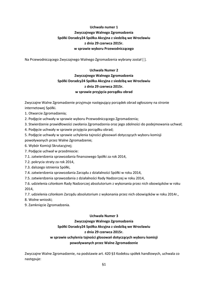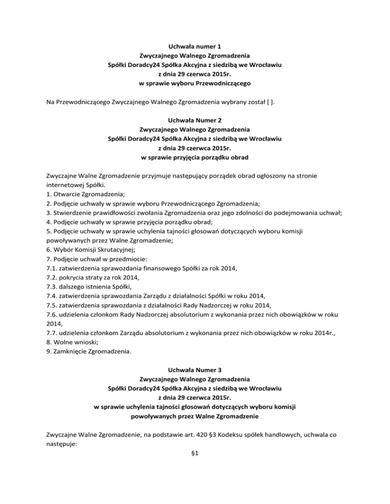 Uchwała numer 1 Zwyczajnego Walnego Zgromadzenia Spółki Doradcy24 Spółka Akcyjna z siedzibą we Wrocławiu z dnia 29 czerwca 2015r. w sprawie wyboru Przewodniczącego Na Przewodniczącego Zwyczajnego Walnego Zgromadzenia wybrany został [ ]. Uchwała Numer 2 Zwyczajnego Walnego Zgromadzenia Spółki Doradcy24 Spółka Akcyjna z siedzibą we Wrocławiu z dnia 29 czerwca 2015r. w sprawie przyjęcia porządku obrad Zwyczajne Walne Zgromadzenie przyjmuje następujący porządek obrad ogłoszony na stronie internetowej Spółki. 1. Otwarcie Zgromadzenia; 2. Podjęcie uchwały w sprawie wyboru Przewodniczącego Zgromadzenia; 3. Stwierdzenie prawidłowości zwołania Zgromadzenia oraz jego zdolności do podejmowania uchwał; 4. Podjęcie uchwały w sprawie przyjęcia porządku obrad; 5. Podjęcie uchwały w sprawie uchylenia tajności głosowań dotyczących wyboru komisji powoływanych przez Walne Zgromadzenie; 6. Wybór Komisji Skrutacyjnej; 7. Podjęcie uchwał w przedmiocie: 7.1. zatwierdzenia sprawozdania finansowego Spółki za rok 2014, 7.2. pokrycia straty za rok 2014, 7.3. dalszego istnienia Spółki, 7.4. zatwierdzenia sprawozdania Zarządu z działalności Spółki w roku 2014, 7.5. zatwierdzenia sprawozdania z działalności Rady Nadzorczej w roku 2014, 7.6. udzielenia członkom Rady Nadzorczej absolutorium z wykonania przez nich obowiązków w roku 2014, 7.7. udzielenia członkom Zarządu absolutorium z wykonania przez nich obowiązków w roku 2014r., 8. Wolne wnioski; 9. Zamknięcie Zgromadzenia. Uchwała Numer 3 Zwyczajnego Walnego Zgromadzenia Spółki Doradcy24 Spółka Akcyjna z siedzibą we Wrocławiu z dnia 29 czerwca 2015r. w sprawie uchylenia tajności głosowań dotyczących wyboru komisji powoływanych przez Walne Zgromadzenie Zwyczajne Walne Zgromadzenie, na podstawie art. 420 §3 Kodeksu spółek handlowych, uchwala co następuje: §1 Uchyla się dla potrzeb niniejszego Zwyczajnego Walnego Zgromadzenia tajność głosowania dotyczącego powołania Komisji Skrutacyjnej. §2 Uchwała wchodzi w życie z chwilą podjęcia. Uchwała Numer 4 Zwyczajnego Walnego Zgromadzenia Spółki Doradcy24 Spółka Akcyjna z siedzibą we Wrocławiu z dnia 29 czerwca 2015r. w sprawie powołania Komisji Skrutacyjnej Zwyczajne Walne Zgromadzenie uchwala co następuje: §1 Dla potrzeb Zwyczajnego Walnego Zgromadzenia powołuje się Komisję Skrutacyjną w składzie [ ]. §2 Uchwała wchodzi w życie z chwilą podjęcia. Uchwała Numer 5 Zwyczajnego Walnego Zgromadzenia Spółki Doradcy24 Spółka Akcyjna z siedzibą we Wrocławiu z dnia 29 czerwca 2015r. w sprawie zatwierdzenia sprawozdania finansowego Spółki za rok 2014 §1 Zwyczajne Walne Zgromadzenie, po rozpatrzeniu, zatwierdza sprawozdanie finansowe Spółki za rok obrotowy 2014, składające się z: a) wprowadzenia do sprawozdania finansowego, b) bilansu, który po stronie aktywów i pasywów na dzień 31 grudnia 2014 r. zamyka się sumą: 1.479.213,67 PLN zł (słownie: jeden milion czterysta siedemdziesiąt dziewięć tysięcy dwieście trzynaście 67/100), c) rachunku zysków i strat, który wykazuje stratę netto w wysokości : 1.731.249,86 PLN (słownie: jeden milion siedemset trzydzieści jeden tysięcy dwieście czterdzieści dziewięć 86/100), d) zestawienia zmian w kapitale własnym, które wykazuje zmniejszenie kapitału własnego o kwotę : 1.731.249,86 PLN (słownie: jeden milion siedemset trzydzieści jeden tysięcy dwieście czterdzieści dziewięć 86/100), e) rachunku przepływów pieniężnych, który wykazuje zmniejszenie stanu środków pieniężnych o kwotę : 273.650,62 PLN (słownie: dwieście siedemdziesiąt trzy tysiące sześćset pięćdziesiąt 62/100 ), f) dodatkowych not i objaśnień. §2 Uchwała wchodzi w życie z chwilą podjęcia. Uchwała Numer 6 Zwyczajnego Walnego Zgromadzenia Spółki Doradcy24 Spółka Akcyjna z siedzibą we Wrocławiu z dnia 29 czerwca 2015r. w sprawie pokrycia straty za rok 2014 §1 Zwyczajne Walne Zgromadzenie postanawia, że strata netto Spółki w wysokości 1.731.249,86 PLN (słownie: jeden milion siedemset trzydzieści jeden tysięcy dwieście czterdzieści dziewięć 86/100) zostanie pokryta z przyszłych wypracowanych zysków w kolejnych latach. §2 Uchwała wchodzi w życie z chwilą podjęcia. Uchwała Numer 7 Zwyczajnego Walnego Zgromadzenia Spółki Doradcy24 Spółka Akcyjna z siedzibą we Wrocławiu z dnia 29 czerwca 2015r. w sprawie dalszego istnienia Spółki §1 Zwyczajne Walne Zgromadzenie działając na podstawie art. 397 K.S.H., w związku z faktem iż bilans Spółki sporządzony na dzień 31 grudnia 2014 roku wykazał skumulowaną stratę w wysokości : 12.056.600,39 PLN (słownie: dwanaście milionów pięćdziesiąt sześć tysięcy sześćset 39/100), tj. stratę przewyższającą sumę kapitałów zapasowego i rezerwowych oraz jedną trzecią kapitału zakładowego Spółki, niniejszym postanawia o dalszym istnieniu Spółki. §2 Uchwała wchodzi w życie z chwilą podjęcia. Uchwała Numer 8 Zwyczajnego Walnego Zgromadzenia Spółki Doradcy24 Spółka Akcyjna z siedzibą we Wrocławiu z dnia 29 czerwca 2015r. w sprawie zatwierdzenia sprawozdania Zarządu z działalności Spółki za rok 2014 §1 Zwyczajne Walne Zgromadzenie, po rozpatrzeniu, zatwierdza sprawozdanie Zarządu z działalności Spółki za rok 2014. §2 Uchwała wchodzi w życie z chwilą podjęcia. Uchwała Numer 9 Zwyczajnego Walnego Zgromadzenia Spółki Doradcy24 Spółka Akcyjna z siedzibą we Wrocławiu z dnia 29 czerwca 2015r. w sprawie zatwierdzenia sprawozdania z działalności Rady Nadzorczej za rok 2014 §1 Zwyczajne Walne Zgromadzenie, po rozpatrzeniu, zatwierdza sprawozdanie z działalności Rady Nadzorczej w roku 2014. §2 Uchwała wchodzi w życie z chwilą podjęcia. Uchwała Numer 10 Zwyczajnego Walnego Zgromadzenia Spółki Doradcy24 Spółka Akcyjna z siedzibą we Wrocławiu z dnia 29 czerwca 2015r. w sprawie udzielenia absolutorium z wykonywania obowiązków czło
