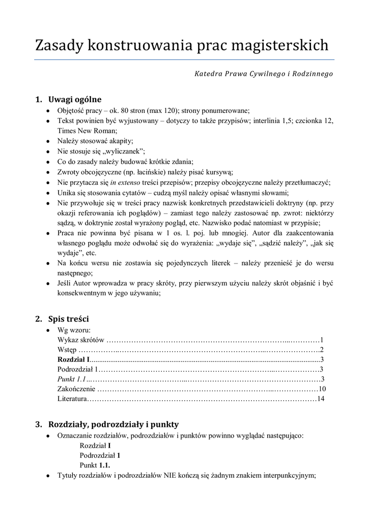 Zasady konstruowania prac magisterskich Katedra Prawa Cywilnego i Rodzinnego 1. Uwagi ogólne Objętość pracy – ok. 80 stron (max 120); strony ponumerowane; Tekst powinien być wyjustowany – dotyczy to także przypisów; interlinia 1,5; czcionka 12, Times New Roman; Należy stosować akapity; Nie stosuje się „wyliczanek”; Co do zasady należy budować krótkie zdania; Zwroty obcojęzyczne (np. łacińskie) należy pisać kursywą; Nie przytacza się in extenso treści przepisów; przepisy obcojęzyczne należy przetłumaczyć; Unika się stosowania cytatów – cudzą myśl należy opisać własnymi słowami; Nie przywołuje się w treści pracy nazwisk konkretnych przedstawicieli doktryny (np. przy okazji referowania ich poglądów) – zamiast tego należy zastosować np. zwrot: niektórzy sądzą, w doktrynie został wyrażony pogląd, etc. Nazwisko podać natomiast w przypisie; Praca nie powinna być pisana w 1 os. l. poj. lub mnogiej. Autor dla zaakcentowania własnego poglądu może odwołać się do wyrażenia: „wydaje się”, „sądzić należy”, „jak się wydaje”, etc. Na końcu wersu nie zostawia się pojedynczych literek – należy przenieść je do wersu następnego; Jeśli Autor wprowadza w pracy skróty, przy pierwszym użyciu należy skrót objaśnić i być konsekwentnym w jego używaniu; 2. Spis treści Wg wzoru: Wykaz skrótów ………………………………………………………………...…………1 Wstęp ……………..…………………………………………………...………………….2 Rozdział I............................................................................................................................3 Podrozdział 1……………………………………………………………...………………3 Punkt 1.1…………………………………...………………………………………………3 Zakończenie ……………………………………………………………...………………10 Literatura…………………………………………………………………………………14 3. Rozdziały, podrozdziały i punkty Oznaczanie rozdziałów, podrozdziałów i punktów powinno wyglądać następująco: Rozdział I Podrozdział 1 Punkt 1.1. Tytuły rozdziałów i podrozdziałów NIE kończą się żadnym znakiem interpunkcyjnym; Raczej nie wyróżnia się mniejszych jednostek redakcyjnych niż punkt; Rozdział nie powinien mieć mniej niż 5 stron; podrozdział/punkt – min. pół strony; Jednostka redakcyjna (np. podrozdział, punkt) nie powinien być obszerniejszy niż 5 stron. Jeśli jest większy, wprowadzić należy podpunkt; 4. Literatura W spisie literatury podaje się w pierwszej kolejności inicjał imienia, następnie nazwisko, tytuł kursywą, miejsce i rok wydania (gdy monografia) lub czasopismo i rok jego ukazania się oraz numer. Taka sama zasada dotyczy prasy codziennej np. Gazety Prawnej. Numerów stron nie uwzględnia się; Przykład: J. Nowacki, „Odpowiednie” stosowanie przepisów prawa, PiP 1964, z. 3. Glosy traktuje się jako odrębną pozycję literatury; glos nie dopisuje się do orzeczeń; Poszczególne pozycje literatury należy uporządkować alfabetycznie; Jeśli przywołanych jest więcej prac jednego Autora, wówczas należy je uszeregować poczynając od najstarszej; W spisie literatury należy zawrzeć zarówno artykuły, jak i monografie, komentarze, podręczniki; Można wyodrębnić wykaz aktów prawnych (uszeregowanych według hierarchii oraz chronologicznie) oraz orzeczeń (układ chronologiczny) 5. Przypisy Przypis – wyjustowany; czcionka 10px; pojedyncza interlinia Każdy przypis należy rozpocząć z wielkiej litery oraz zakończyć kropką; Numer przypisu w tekście stawia się przed znakiem interpunkcyjnym; Zawsze podaje się numer strony dzieła, z którego korzysta Autor pracy; Przypisy mają jedynie dokumentować wykorzystane dzieła lub orzeczenia; wszelkie wyjaśnienia i uwagi powinny zostać przeniesione do tekstu głównego; Trzeba uczciwie podawać źródła, z których Autor korzysta. Nie jest akceptowana sytuacja, gdy kilka stron nie ma w ogóle przypisu; Jeśli w kolejnych przypisach Autor powołuje się na to samo dzieło, wówczas stosuje się Ibidem oraz numer strony Przykład: 1 R. Tokarczyk, Kultura prawa europejskiego [w:] C. Mik (red.), Europeizacja prawa krajowego, Toruń 2000, s. 21. 2 Ibidem, s. 22. Jeżeli w pracy kilkakrotnie jest przywoływane to samo dzieło, wtedy podaje się inicjał imienia, nazwisko, początkowe słowa tytułu i trzy kropki, numer strony Przykład: 1 M. Smyk, Pełnomocnictwo według kodeksu cywilnego, Warszawa 2010, s. 106. 2 K. A. Dadańska, Działanie osoby prawnej, Warszawa 2006, s. 30 – 36. 3 M. Smyk, Pełnomocnictwo…, s. 200. Jeśli wykorzystywane są źródła elektroniczne, nie jest wystarczające podanie adresu strony www. Należy również napisać, co się na stronie znajduje. Trzeba także usunąć hiperłącza. Przykład 1: U.S. Department of Justice, Executive Office for United States Trustees, Report to Congress: Impact of the Utilization of Internal Revenue Service Standards for Determining Expenses on Debtors and the Court, July 2007, s. 28. Dostępny on-line: http://www.justice.gov/ust/eo/public_affairs/reports_studies/docs/Rpt_to_Congress_on_IRS _Standards.pdf. Przykład 2: ABI Consumer Bankruptcy Center, More Details on the Bankruptcy Process. Dostępne on-line: http://consumer.abiworld.org/?q=node/23. 6. Przypisy – wzory Akty prawne o Ustawa z dnia 25.2.1964 r. Kodeks rodzinny i opiekuńczy, Dz.U. z 1964, Nr 9, poz. 59 ze zm. (zawsze „ze zm.” nigdy „z późn. zm.” – każda zmiana jest późniejsza!) o Dyrektywa Rady 93/13/EWG z dnia 5.4.1993 r. w sprawie nieuczciwych warunków w umowach konsumenckich, Dz.U. UE L 095 z 1993 r., s. 29 – 34. Orzeczenia sądowe o Wyrok SN z dnia 25.4.2007 r., IV CSK 34/07, LEX nr 461601. o Uchwała SN