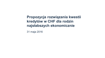 Propozycja rozwiązania kwestii kredytów w CHF dla rodzin najsłabszych ekonomicznie 31 maja 2016 Dotychczasowe działania banków w sferze ograniczenia konsekwencji skokowego wzrostu kursu CHF „Sześciopak” – obowiązuje bez zmian od 02.2015 r. Rozwiązania Efekt dla klientów / sektora 1. 2. 3. Stabilizacja raty kredytu dla klientów Pomoc w obsłudze zadłużenia Koszt dla sektora bankowego: 1 mld zł rocznie Pomoc w obsłudze zadłużenia dla kredytobiorców w przejściowo trudnej sytuacji Pomoc czasowa, zwrotna z możliwością umorzenia Koszt dla sektora bankowego: 600 mln zł 4. 5. 6. Uwzględnienie ujemnej stawki LIBOR Istotne zmniejszenie tzw. spreadu walutowego Wydłużenie, na wniosek klienta, okresu spłaty lub okresowe zawieszenie spłaty raty kapitałowej , tak aby jej poziom nie był wyższy lub był niewiele wyższy niż przed uwolnieniem kursu Rezygnacja z żądania nowego zabezpieczenia oraz ubezpieczenia kredytu Umożliwienie kredytobiorcom bezprowizyjnego przewalutowania po średnim kursie NBP Uelastycznienie zasad restrukturyzacji kredytów hipotecznych dla klientów zamieszkujących kredytowane nieruchomości 7. Fundusz Wsparcia Restrukturyzacji Kredytów Hipotecznych Dodatkowe rozwiązania 8. Uwolnienie zabezpieczenia Umożliwienie klientom zmiany zabezpieczenia poprzez zamianę hipoteki 2 Jak banki pomagają Kowalskiemu Dostał rozwiązania „sześciopaku”? DOSTAŁ KOSZT: 1 MLD ZŁ Dostał pomoc gdy stracił pracę, zachorował lub miał wypadek? DOSTAŁ KOSZT: 600 MLN ZŁ Dostawał propozycję przewalutowania gdy cena franka rosła przed 15 stycznia 2015 r.? DOSTAWAŁ NIE SKORZYSTAŁ Dostaje propozycję dopłaty gdy współczynnik DtI przekracza 70%? KOSZT: 2,7 MLD ZŁ 3 Postawy Polaków wobec kwestii pomocy kredytobiorcom, którzy zaciągnęli zobowiązania w CHF TNS Polska, marzec 2016, N=1004 CBOS, marzec/kwiecień 2016, N=1102 Czy Pana(i) zdaniem polskie władze powinny udzielić pomocy kredytobiorcom, którzy zaciągnęli kredyty w CHF lub innych walutach? Czy państwo powinno wprowadzić przepisy mające na celu pomoc osobom, które zaciągnęły kredyty we frankach? 38% TAK 18 47% NIE 36% TAK 6 12 28 32 24 54% NIE 29 26 15 10 Zdecydowanie tak Raczej tak Zdecydowanie tak Raczej tak Nie wiem / nie mam zdania Raczej nie Raczej nie Zdecydowanie nie Zdecydowanie nie Trudno powiedzieć dane w procentach 4 Główne cele i idea propozycji CELE 1 Pomoc dla rodzin najsłabszych ekonomicznie 2 Zachowanie bezpieczeństwa depozytów zgromadzonych w bankach 3 Utrzymanie stabilnego poziomu kredytowania gospodarki 4 Utrzymanie poziomu wpływów do budżetu państwa IDEA PROPOZYCJI Udzielenie wsparcia klientom w trudnej sytuacji finansowej. Przewalutowanie kredytów po kursie bieżącym. Rata kredytu po przewalutowaniu nie przekroczy 70% dochodów kredytobiorcy w związku z dopłatami dokonywanymi przez bank. Program realizowany w każdym banku indywidualnie 5 Przykładowa symulacja dla kredytów z lutego 2008 r. Suma dopłat banku w okresie dalszej spłaty kredytu: 78,4 tys. zł 2300 2100 1900 1825,5 1700 1603,6 1500 1300 1375,16 Początkowa wartość kredytu wyrażona w PLN Suma spłaconych rat na moment przewalutowania kredytu w CHF 135 000 CHF = 300 753 PLN marża 1,0% 300 753 PLN marża 1,5% 144 556 PLN 168 401 PLN cze-16 gru-15 Wysokość raty kredytu PLN mar-16 cze-15 wrz-15 gru-14 mar-15 cze-14 wrz-14 gru-13 mar-14 cze-13 wrz-13 gru-12 Wysokość raty kredytu CHF mar-13 cze-12 wrz-12 gru-11 mar-12 cze-11 wrz-11 gru-10 mar-11 cze-10 wrz-10 gru-09 mar-10 cze-09 wrz-09 gru-08 mar-09 cze-08 wrz-08 900 mar-08 1100 1575 (DtI = 70%) przy dochodach netto kredytobiorcy = 2250 zł Przewalutowanie kredytu CHF po kursie bieżącym maj 2016 6 Korzyści dla przykładowego Kowalskiego Bank dopłaca do raty 250 zł 1825 Rata kredytu frankowicza po przewalutowaniu bez dopłaty banku 1603 Rata kredytu frankowicza bez przewalutowania 1575 Pierwsza rata frankowicza po przewalutowaniu z dopłatą banku 1375 Dzień przewalutowania Rata złotówkowicza • Niższa rata • Brak ryzyka walutowego 7 Do kogo skierowana jest propozycja? Warunki uczestnictwa w programie: ► Brak dotychczasowych opóźnień w spłacie ze strony kredytobiorcy, ► DtI o poziomie minimum 70% (poziom od ustalenia na bazie szczegółowych analiz), kryterium DtI weryfikowane na bazie PIT za zeszły rok, ► Kredyt udzielony na zakup lokali mieszkaniowych o powierzchni użytkowej do 75 m2 i domów jednorodzinnych o powierzchni do 150 m2, dla klientów posiadających jedynie jeden lokal mieszkalny/dom, Działanie programu dopłat: ► Oferta składana jednorazowo kredytobiorcom spełniającym warunki uczestnictwa w programie. ► Oferta zakłada przewalutowanie kredytu w CHF na kredyt w PLN po kursie spot z daty akceptacji oferty przez kredytobiorcę oraz zamiany oprocentowania na WIBOR plus marża. Poziom marży nie będzie zmieniany. ► Zapewnienie maksymalnego poziomu raty kredytowej płaconej przez klienta na poziomie nie wyższym niż 70% dochodów klienta ustalonych na bazie PIT za zeszły rok przy równoczesnym maksymalnym wydłużeniu terminu kredytu o nie więcej niż 5 lat (maksymalnie 20% pozostałego terminu do zapadalności) pod warunkiem terminowego obsługiwania rat kredytu. ► W wypadku przewalutowania, gdy okres kredytowania został wydłużony o 5 lat, a DtI nadal przekracza 70%, pozostałą różnicę pokrywa bank ► Okres obowiązywania oferty – do końca roku, preferowany termin to maj – listopad. 8 Warunki realizacji i koszty rozwiązania 1 2 3 Warunki uczestnictwa w zakresie poziomu DtI powinny być ustalone w taki sposób, aby skala i wartość wsparcia pozwalała rodzinom najsłabszym ekonomicznie na bieżącą spłatę kredytu i zapewniała bezpieczeństwo sektora finansowego biorąc pod uwagę aktualne otoczenie makroekonomiczne. Program wymaga wsparcia NBP w zakresie minimalizacji potencjalnych negatywnych skutków przewalutowania na stabilność rynku walutowego w Polsce