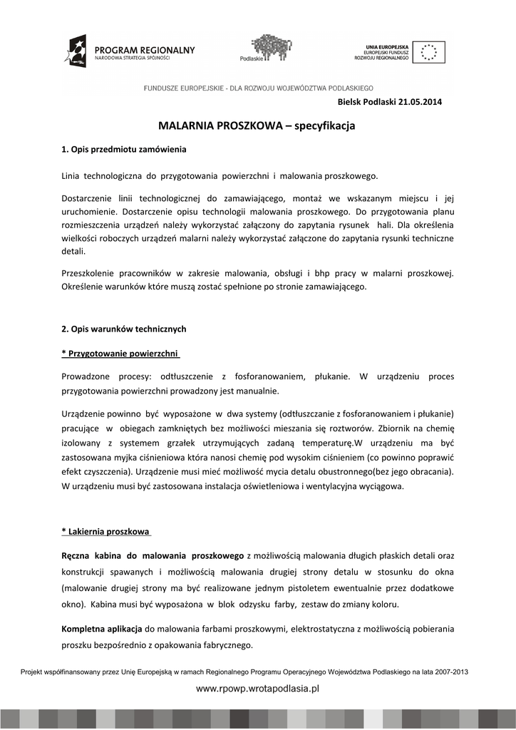 Bielsk Podlaski 21.05.2014 MALARNIA PROSZKOWA – specyfikacja 1. Opis przedmiotu zamówienia Linia technologiczna do przygotowania powierzchni i malowania proszkowego. Dostarczenie linii technologicznej do zamawiającego, montaż we wskazanym miejscu i jej uruchomienie. Dostarczenie opisu technologii malowania proszkowego. Do przygotowania planu rozmieszczenia urządzeń należy wykorzystać załączony do zapytania rysunek hali. Dla określenia wielkości roboczych urządzeń malarni należy wykorzystać załączone do zapytania rysunki techniczne detali. Przeszkolenie pracowników w zakresie malowania, obsługi i bhp pracy w malarni proszkowej. Określenie warunków które muszą zostać spełnione po stronie zamawiającego. 2. Opis warunków technicznych * Przygotowanie powierzchni Prowadzone procesy: odtłuszczenie z fosforanowaniem, płukanie. W urządzeniu proces przygotowania powierzchni prowadzony jest manualnie. Urządzenie powinno być wyposażone w dwa systemy (odtłuszczanie z fosforanowaniem i płukanie) pracujące w obiegach zamkniętych bez możliwości mieszania się roztworów. Zbiornik na chemię izolowany z systemem grzałek utrzymujących zadaną temperaturę.W urządzeniu ma być zastosowana myjka ciśnieniowa która nanosi chemię pod wysokim ciśnieniem (co powinno poprawić efekt czyszczenia). Urządzenie musi mieć możliwość mycia detalu obustronnego(bez jego obracania). W urządzeniu musi być zastosowana instalacja oświetleniowa i wentylacyjna wyciągowa. * Lakiernia proszkowa Ręczna kabina do malowania proszkowego z możliwością malowania długich płaskich detali oraz konstrukcji spawanych i możliwością malowania drugiej strony detalu w stosunku do okna (malowanie drugiej strony ma być realizowane jednym pistoletem ewentualnie przez dodatkowe okno). Kabina musi być wyposażona w blok odzysku farby, zestaw do zmiany koloru. Kompletna aplikacja do malowania farbami proszkowymi, elektrostatyczna z możliwością pobierania proszku bezpośrednio z opakowania fabrycznego. Projekt współfinansowany przez Unię Europejską w ramach Regionalnego Programu Operacyjnego Województwa Podlaskiego na lata 2007-2013 Gazowy piec do wygrzewania(suszenia) zasilany gazem propan butan. Rodzaj zamknięcia komory roboczej drzwi podwójne, uszczelnione uszczelką. Piec ma być wyposażony w sześciotorowy system transportu podwieszanego. System transportu podwieszanego - krzyżowy, podwieszany 6-torowy, max nośność 350kg/szynę. - przewidywana powierzchnia pod malarnię proszkową - 25mb x 12mb - przewidywana wydajność malarni to min. 1800 do ok.2200m2 miesięcznie. 3. Opis malowanych detali Podstawowym materiałem malowanym jest stal czarna a w niewielkich ilościach aluminium. Do malowania używamy kolorów farb: RAL3003 – 85%, RAL9005 – 2%, RAL1028 połysk – 4%, RAL7047 połysk – 8%, RAL9003 połysk – 1%, O wielkości urządzeń zastosowanych w malarni decydują wymiary elementów malowanych. Malowane detale zostały podzielone na cztery grupy: 1. detale drobne, których wymiar nie przekracza max długości 100cm i powierzchnia 0,5m² 2. detale płaskie wykonane z blach o grubości 1,5-2mm i powierzchni max 3m² (przykładowe rys. detali: S60E10A-04-001, S36G260-02-055) 3. detale wykonane z profili zamkniętych o max długości 3,5m (przykładowe rys. detali:TR20A00-39-100, VN18A00-01-000 ) 4. konstrukcje spawane. (przykładowe rys. detali:OV20A00-01-001, S60E10A-02-001, VN18A00-04-000, VN18A00-05-000, VN18A00-06-000) Projekt współfinansowany przez Unię Europejską w ramach Regionalnego Programu Operacyjnego Województwa Podlaskiego na lata 2007-2013