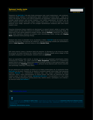 Śpiewać każdy może Data publikacji : 27.09.2010 Ocena: 5/5 (6) Pojawienie się StarCrafta 2 dla wielu fanów pierwowzoru było czymś niesłychanym. Lata oczekiwań, pojedyncze plotki składane w wyimaginowaną całość, rozważania na temat fabuły - skąd my to znamy. Nie dziwota, że wiele z tych osób po pojawieniu się zapowiedzi, a później bety postanowiło we wszelaki sposób pokazać swój zachwyt związany z tym wielkim wydarzeniem. Są rysunki, gry we flashu, pościele, tatuaże, klocki lego, origami, modele z gliny, placki... no i jest też muzyka. I to na nią zwrócimy teraz uwagę, zapraszam na mini przegląd najciekawszych propozycji jakie tylko można znaleźć w sieci. Powyższą fantazyjną kreację mogliście już obserwować na naszych łamach, jednak w ramach miłej powtórki pojawi się tutaj kilka znanych już kawałków. Mimo fajnej kompozycji powyższego dzieła, to jednak jest to tylko zgrane podłożenie kawałka starego, dobrego Raffiego z postaciami z gry. Kolejny utwór został stworzony całkowicie od podstaw przez internetowego barda, znanego jako Singing Nerd a opowiada historię pewnego Vikinga. Następne dwa utwory są dowodem na to, że piosenka o miłości i StarCraft wcale nie muszą stanowić dziwnego oksymoronu, przynajmniej dla niektórych. Autorką pierwszego kawałka jest zamieszkała w Kalifornii Aizel Agustino, natomiast kolejny to dzieło Davida Choia. Jeśli można tworzyć utwory o tematyce takiej jak powyższe, to dlaczego by w tak muzyczny sposób nie przyjrzeć się samej mechanice gry. Kolejna piosenka w zabawny sposób zwraca uwagę na kilka szczegółów związanych z grą Protossem. Autorem coveru jest JoshSuth. Skoro już poprawiliśmy sobie nastrój, to starając się was w nim pozostawić prezentujemy kolejny humorystyczny kawałek, tym razem autorstwa Roba Houghtona. Opowiada on w prześmiewczy sposób historię o pylonie Pylo. Wspomniana budowla protosów zyskała to miano podczas jednej z gier komentowanej przez Huskiego (dostępna TUTAJ), zachęcam do jej obejrzenia jeśli chcecie zrozumieć sens poniższego, świetnego z resztą utworu. Na tym zakończymy nasz przegląd, po którym po raz kolejny przekonujemy się, że wyobraźnie fanów StarCrafta nie zna granic. Okazuje się, że również w muzykalny sposób można oddać hołd najnowszej produkcji Blizzarda i to z powodzeniem. Zachęcam więc i was, naszych czytelników do własnej twórczości, którą z chęcią zaprezentujemy na naszych łamach. Jeśli tylko coś stworzycie bez obaw możecie wysłać to pod adres mailowy [email protected], a my pomyślimy co z tym można zrobić. Na zachętę prezentujemy poniżej jeszcze dwa, świetne utwory i pamiętajcie, że to również i wy tworzycie arenę StarCraftowa 2. Tagi: twórczość fanów, muzyka Uprasza się osoby kopiujące w całości newsy z naszej witryny na swoje strony lub fora o wstawianie widocznych klikalnych linków, bezpośrednio do pobranego tekstu. W przypadku braku widocznego linku, skopiowanie tekstu uważa się za kradzież własności intelektualnej. Dziękujemy: Administratorzy serwisu. Autor: Robert "Xrasnolud" Rojek Data publikacji : 27.09.2010 Data modyfikacji : 27.09.2010 Liczba wyświetleń tekstu: 3930 Komentarz (13) dodaj komentarz Pylo <3~PoDsIaD 2010/09/27 19:42 Było...~Bomber 2010/09/27 20:14 Oddam lewa nerke za mp3 z zerglingowskim "kekekekekeke" z 3 filmiku od gory (A Viking's Lament) Po prostu the best !!! ;D~SzRaPnEL 2010/09/27 20:39 No to proszę: http://homepage.mac.com/osxpert/sc2.mp3 To teraz mogę pić bez obaw o nerki ;D~xrasnolud Battlenet Network 2010/09/27 20:40 "Tell my wife I love her, GG!" Chyba zrobie sobie takie makro w S][C na koniec partyjki :)~SzRaPnEL 2010/09/27 20:41 xrasnolud zapomniałeś o http://www.youtube.com/watch?v=22ERCh4dn4g xd~NeedForSpeed 2010/09/27 21:01 Paylo the paylon powinien trafic na TOP LISTE w catnynie, poza tym ta Aizel Agustino ma swietny glos a melodia nie jest zla 4 akordy daja rade.~HaholWES 2010/09/27 21:10 Patrzac na ostatni kawalek, to ja juz rozumiem czemu mule tak krotko zyja. No jak przy tym command center taka jumpreza jest, to nie ma sie co dziwic XD~sunbeam01 2010/09/27 21:27 i http://www.youtube.com/watch?v=LMdDmbpmIRw~Omgzpwnd 2010/09/27 21:47 http://www.youtube.com/watch?v=pZEZy-EaHvA - posłuchajcie tego gościa, wymiatacz :D~ironlemon 2010/09/28 01:47 NOWY PATCH StarCraft II: Wings of Liberty – Patch 1.1.1 Poprawione błędy Poprawiono błąd, w którym zasięg rozdzierania Ultraliska był nienaturalnie powiększany przez duże cele. Poprawiono błąd, w którym wiązka grawitonowa Feniksa była automatycznie anulowana gdy użyłeś jej zaraz po zgromadzeniu 50 punktów energii. Poprawiono błąd, w którym skolejkowanie Zwróć ładunek u zbieracza powodowało zignorowanie wbudowanego opóźnienia po zakończeniu zbierania. Poprawiono błąd, w którym gracze oglądający starsze powtórki lub zapisane gry doświadczają zacięć. Poprawiono błąd, w którym niektórzy użytkownicy Mac nie mogli poprawnie dołączyć do gier. StarCraft II: Wings of Liberty - Patch 1.1.0 Ogólne Profile skrótów klawiszowych Standard US i Standard US dla leworęcznych są teraz dostępne we wszystkich regionach. Dodano wewnętrzny zegar w grze. Gracze mogą łatwo sprawdzić ile czasu trwa aktualna misja lub mecz. Opcję tą można włączyć lub wyłączyć w menu opcji r~Hollow 2010/09/28 08:46 Piosenka o Pylo nie jest prześmiewcza, raczej humorystyczna ; )~hellknight 2010/09/28 10:22 No to macie wasze kekeke: Całe od "Zerg Rush...": http://ftp.iml.pl/reynevan/Zerg%20Rush%20-%20kekeke%20-%20A%20Viking%27s%20Lament.mp3 Samo kekeke: http://ftp.iml.pl/reynevan/Kekeke%20-%20A%20Viking%27s%20Lament.mp3 A tutaj w rarze: http://ftp.iml.pl/reynevan/Zerg Rush - kekeke - A Viking's Lament.rar Wszelkie ucałowania, nerki i inne narządy, a także równoważność w walucie przesyłać na adres... Jednocześnie zaznaczam, że prawa autorskie 