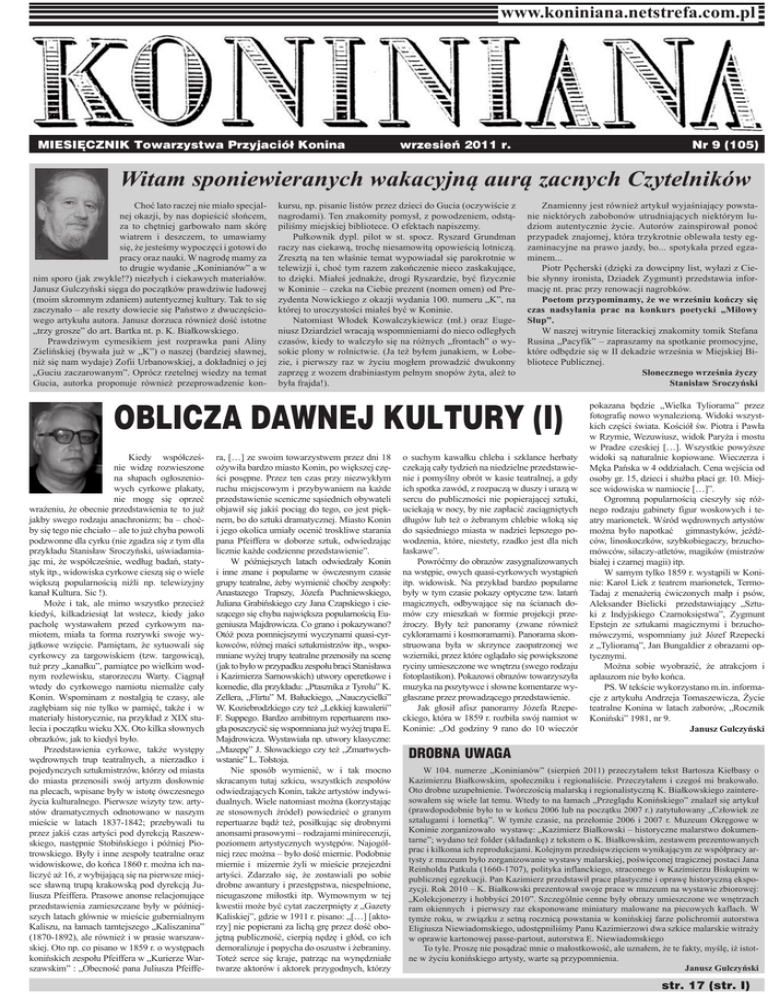 www.koniniana.netstrefa.com.pl MIESIĘCZNIK Towarzystwa Przyjaciół Konina wrzesień 2011 r. Nr 9 (105) Witam sponiewieranych wakacyjną aurą zacnych Czytelników Choć lato raczej nie miało specjalnej okazji, by nas dopieścić słońcem, za to chętniej garbowało nam skórę wiatrem i deszczem, to umawiamy się, że jesteśmy wypoczęci i gotowi do pracy oraz nauki. W nagrodę mamy za to drugie wydanie „Koninianów” a w nim sporo (jak zwykle!?) niezłych i ciekawych materiałów. Janusz Gulczyński sięga do początków prawdziwie ludowej (moim skromnym zdaniem) autentycznej kultury. Tak to się zaczynało – ale reszty dowiecie się Państwo z dwuczęściowego artykułu autora. Janusz dorzuca również dość istotne „trzy grosze” do art. Bartka nt. p. K. Białkowskiego. Prawdziwym cymesikiem jest rozprawka pani Aliny Zielińskiej (bywała już w „K”) o naszej (bardziej sławnej, niż się nam wydaje) Zofii Urbanowskiej, a dokładniej o jej „Guciu zaczarowanym”. Oprócz rzetelnej wiedzy na temat Gucia, autorka proponuje również przeprowadzenie kon- kursu, np. pisanie listów przez dzieci do Gucia (oczywiście z nagrodami). Ten znakomity pomysł, z powodzeniem, odstąpiliśmy miejskiej bibliotece. O efektach napiszemy. Pułkownik dypl. pilot w st. spocz. Ryszard Grundman raczy nas ciekawą, trochę niesamowitą opowieścią lotniczą. Zresztą na ten właśnie temat wypowiadał się parokrotnie w telewizji i, choć tym razem zakończenie nieco zaskakujące, to dzięki. Miałeś jednakże, drogi Ryszardzie, być fizycznie w Koninie – czeka na Ciebie prezent (nomen omen) od Prezydenta Nowickiego z okazji wydania 100. numeru „K”, na której to uroczystości miałeś być w Koninie. Natomiast Włodek Kowalczykiewicz (mł.) oraz Eugeniusz Dziardziel wracają wspomnieniami do nieco odległych czasów, kiedy to walczyło się na różnych „frontach” o wysokie plony w rolnictwie. (Ja też byłem junakiem, w Łobezie, i pierwszy raz w życiu mogłem prowadzić dwukonny zaprzęg z wozem drabiniastym pełnym snopów żyta, ależ to była frajda!). Znamienny jest również artykuł wyjaśniający powstanie niektórych zabobonów utrudniających niektórym ludziom autentycznie życie. Autorów zainspirował ponoć przypadek znajomej, która trzykrotnie oblewała testy egzaminacyjne na prawo jazdy, bo... spotykała przed egzaminem... Piotr Pęcherski (dzięki za dowcipny list, wyłazi z Ciebie słynny ironista, Dziadek Zygmunt) przedstawia informację nt. prac przy renowacji nagrobków. Poetom przypominamy, że we wrześniu kończy się czas nadsyłania prac na konkurs poetycki „Milowy Słup”. W naszej witrynie literackiej znakomity tomik Stefana Rusina „Pacyfik” – zapraszamy na spotkanie promocyjne, które odbędzie się w II dekadzie września w Miejskiej Bibliotece Publicznej. Słonecznego września życzy Stanisław Sroczyński OBLICZA DAWNEJ KULTURY (I) Kiedy współcześnie widzę rozwieszone na słupach ogłoszeniowych cyrkowe plakaty, nie mogę się oprzeć wrażeniu, że obecnie przedstawienia te to już jakby swego rodzaju anachronizm; ba – choćby się tego nie chciało – ale to już chyba powoli podzwonne dla cyrku (nie zgadza się z tym dla przykładu Stanisław Sroczyński, uświadamiając mi, że współcześnie, według badań, statystyk itp., widowiska cyrkowe cieszą się o wiele większą popularnością niźli np. telewizyjny kanał Kultura. Sic !). Może i tak, ale mimo wszystko przecież kiedyś, kilkadziesiąt lat wstecz, kiedy jako pacholę wystawałem przed cyrkowym namiotem, miała ta forma rozrywki swoje wyjątkowe wzięcie. Pamiętam, że sytuowali się cyrkowcy za targowiskiem (tzw. targowicą), tuż przy „kanałku”, pamiątce po wielkim wodnym rozlewisku, starorzeczu Warty. Ciągnął wtedy do cyrkowego namiotu niemalże cały Konin. Wspominam z nostalgią te czasy, ale zagłębiam się nie tylko w pamięć, także i w materiały historycznie, na przykład z XIX stulecia i początku wieku XX. Oto kilka słownych obrazków, jak to kiedyś było. Przedstawienia cyrkowe, także występy wędrownych trup teatralnych, a nierzadko i pojedynczych sztukmistrzów, którzy od miasta do miasta przenosili swój artyzm dosłownie na plecach, wpisane były w istotę ówczesnego życia kulturalnego. Pierwsze wizyty tzw. artystów dramatycznych odnotowano w naszym mieście w latach 1837-1842; przebywali tu przez jakiś czas artyści pod dyrekcją Raszewskiego, następnie Stobińskiego i później Piotrowskiego. Były i inne zespoły teatralne oraz widowiskowe, do końca 1860 r. można ich naliczyć aż 16, z wybijającą się na pierwsze miejsce sławną trupą krakowską pod dyrekcją Juliusza Pfeiffera. Prasowe anonse relacjonujące przedstawienia zamieszczane były w późniejszych latach głównie w mieście gubernialnym Kaliszu, na łamach tamtejszego „Kaliszanina” (1870-1892), ale również i w prasie warszawskiej. Oto np. co pisano w 1859 r. o występach konińskich zespołu Pfeiffera w „Kurierze Warszawskim” : „Obecność pana Juliusza Pfeiffe- ra, […] ze swoim towarzystwem przez dni 18 ożywiła bardzo miasto Konin, po większej części posępne. Przez ten czas przy niezwykłym ruchu miejscowym i przybywaniem na każde przedstawienie sceniczne sąsiednich obywateli objawił się jakiś pociąg do tego, co jest pięknem, bo do sztuki dramatycznej. Miasto Konin i jego okolica umiały ocenić troskliwe starania pana Pfeiffera w doborze sztuk, odwiedzając licznie każde codzienne przedstawienie”. W późniejszych latach odwiedzały Konin i inne znane i popularne w ówczesnym czasie grupy teatralne, żeby wymienić choćby zespoły: Anastazego Trapszy, Józefa Puchniewskiego, Juliana Grabińskiego czy Jana Czapskiego i cieszącego się chyba największa popularnością Eugeniusza Majdrowicza. Co grano i pokazywano? Otóż poza pomniejszymi wyczynami quasi-cyrkowców, różnej maści sztukmistrzów itp., wspomniane w