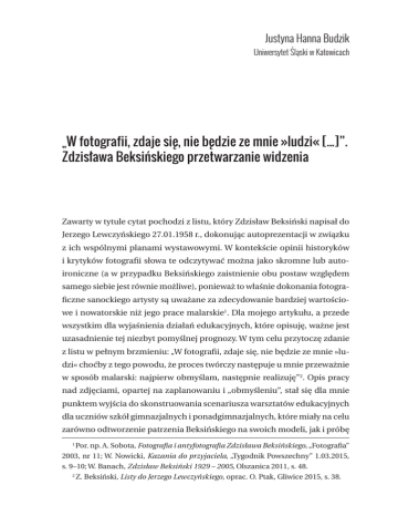 245 Justyna Hanna Budzik Uniwersytet Śląski w Katowicach „W fotografii, zdaje się, nie będzie ze mnie »ludzi« [...]”. Zdzisława Beksińskiego przetwarzanie widzenia Zawarty w tytule cytat pochodzi z listu, który Zdzisław Beksiński napisał do Jerzego Lewczyńskiego 27.01.1958 r., dokonując autoprezentacji w związku z ich wspólnymi planami wystawowymi. W kontekście opinii historyków i krytyków fotografii słowa te odczytywać można jako skromne lub autoironiczne (a w przypadku Beksińskiego zaistnienie obu postaw względem samego siebie jest równie możliwe), ponieważ to właśnie dokonania fotograficzne sanockiego artysty są uważane za zdecydowanie bardziej wartościowe i nowatorskie niż jego prace malarskie1. Dla mojego artykułu, a przede wszystkim dla wyjaśnienia działań edukacyjnych, które opisuję, ważne jest uzasadnienie tej niezbyt pomyślnej prognozy. W tym celu przytoczę zdanie z listu w pełnym brzmieniu: „W fotografii, zdaje się, nie będzie ze mnie »ludzi« choćby z tego powodu, że proces twórczy następuje u mnie przeważnie w sposób malarski: najpierw obmyślam, następnie realizuję”2. Opis pracy nad zdjęciami, opartej na zaplanowaniu i „obmyśleniu”, stał się dla mnie punktem wyjścia do skonstruowania scenariusza warsztatów edukacyjnych dla uczniów szkół gimnazjalnych i ponadgimnazjalnych, które miały na celu zarówno odtworzenie patrzenia Beksińskiego na swoich modeli, jak i próbę Por. np. A. Sobota, Fotografia i antyfotografia Zdzisława Beksińskiego, „Fotografia” 2003, nr 11; W. Nowicki, Kazania do przyjaciela, „Tygodnik Powszechny” 1.03.2015, s. 9–10; W. Banach, Zdzisław Beksiński 1929 – 2005, Olszanica 2011, s. 48. 1 2 Z. Beksiński, Listy do Jerzego Lewczyńskiego, oprac. O. Ptak, Gliwice 2015, s. 38. 246 Justyna Hanna Budzik spojrzenia na innych lub samego siebie tak, jak mógł robić to fotograf, zanim przystąpił do wykonania zdjęć (auto)portretowych. Koncept kształtowania fotografii na podobieństwo malarstwa pojawia się w dyskursie o fotografii już w początkach jej historii. Obok nurtu „mimetycznego”, uznającego fotografię za medium idealnego odwzorowania rzeczywistości, zaistniał też drugi nurt, który rzeczywistość uznawał za tworzywo, jakie fotograf może przekształcić, by stworzyć nowy obraz. Jakub Dziewit, kulturoznawca i fotograf, w bardzo interesujący sposób komentuje znaną historię fałszywego Autoportretu topielca Hyppolyte’a Bayarda (1840) – inscenizowanej fotografii, w której autor wystylizował się na martwą ofiarę utonięcia i opatrzył zdjęcie przekornym podpisem, iż do tego czynu doprowadził go brak uznania ze strony współczesnych: Zdjęcie […] jest pierwszym przykładem fotografii, której celem nie jest mimetyczne odwzorowanie i reprezentacja rzeczywistości. Chodzi raczej o wykorzystanie fragmentów świata do stworzenia obrazu, który nie jest jego odzwierciedleniem. […] Po raz pierwszy fotograf był „malarzem”, a „rzeczywistość” – jego farbami. Po raz pierwszy rzeczywistość w fotografii była w pełni wykorzystana3. A zatem już w roku 1840 potencjał fotografii został użyty do stworzenia rzeczywistości alternatywnej, posługującej się „mimetycznymi” środkami obrazowania aparatu fotograficznego. Mistyfikacja utkana z rzeczywistości okazała się możliwa. Autodiagnoza Beksińskiego wydaje się nieco zbyt surowa, gdyż – jak pokazuje historia – malarski sposób tworzenia zdjęć pozostaje jak najbardziej uprawniony. W 1980 r. Roland Barthes napisze: „Fotografia zrobiła z Malarstwa – kopiując je lub mu zaprzeczając – Odniesienie absolutne, ojcowskie, tak jakby narodziła się z Obrazu”4. Można więc założyć, iż Beksiński-fotograf kontynuuje ów nurt „wykorzystywania” realności dla jej przekształcania i kreacji zupełnie nowych obrazów. W tym miejscu warto też przypomnieć stwierdzenie François’a Soulages’a: 3 4 J. Dziewit, Aparaty i obrazy.W stronę kulturowej historii fotografii, Katowice 2014, s. 78. R. Barthes, Światło obrazu, tłum. J. Trznadel, Warszawa 2008, s. 58. „W fotografii, zdaje się, nie będzie ze mnie »ludzi« [...]”. Zdzisława Beksińskiego... 247 „Nie »zdejmuje się« zdjęcia, ale się je tworzy”5. Filozof i krytyk sztuki wykazał w rozpatrującej relacje między fotografią a rzeczywistością rozprawie Estetyka fotografii. Strata i zysk, iż Barthes’owska doktryna „tego-co-było” – a zatem przekonanie, iż zdjęcie jest niezaprzeczalnym śladem obecności realnej rzeczy przed obiektywem – nie znajduje potwierdzenia w badaniu epistemologicznego wymiaru fotografii. Właściwszym określeniem istoty fotografii jest według Soulages’a „to, co zostało odegrane” – wskazujące na inscenizację jako podstawę obrazu fotograficznego6. Zanim przystąpię do omówienia warsztatów edukacyjnych skupionych na portretach i autoportrecie Beksińskiego, doprecyzuję jeszcze moje rozumienie „obrazu” w odniesieniu do zaplanowanych i przeprowadzonych działań dydaktycznych. Największy wpływ na kształtowanie koncepcji zajęć miała antropologiczna koncepcja obrazu autorstwa Hansa Beltinga. Zgodnie z wywodem badacza, najważniejszą czynnością człowieka jest jego „aktywność wizualna”, w ramach której powstają obrazy jako „wynik indywidualnej lub kolektywnej symbolizacji”7. Niematerialny obraz obecny jest w materialnym medium, którym jest zarówno nośnik-podłoże obrazu, jak i ciało odbiorcy. Za najważniejszą konstatację Beltinga uważam stwierdzenie: „Obraz dopiero wtedy staje się obrazem, gdy jest ożywiany przez widza. W akcie ożywiania oddzielamy go w wyobraźni od jego medium-nośnika”8. Celem proponowanych uczniom gimnazjów i liceów warsztatów było właśnie „ożywienie” obrazów-fotografii Beksińskiego, zbadanie jak młodzi ludzie patrzą i co widzą na antyportretach9, jakie przyjmują 